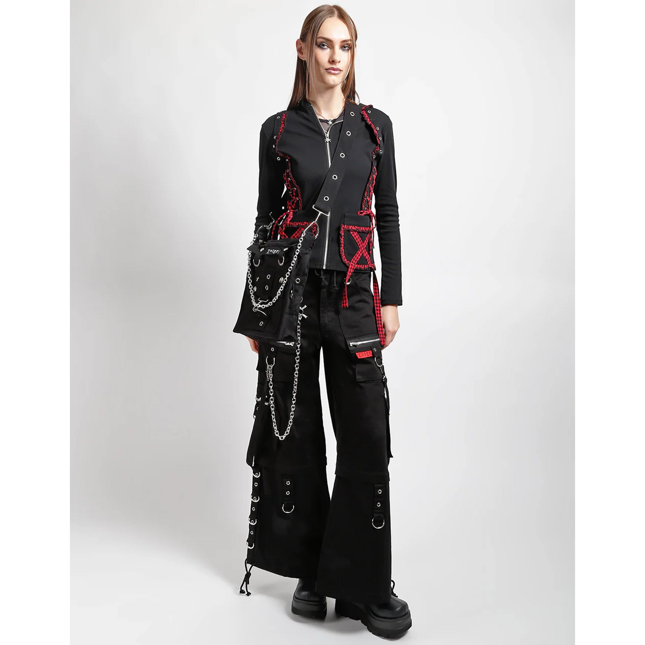 Shoulder bag with strap and chain. Button front closure with d-ring detail and inside pockets.
