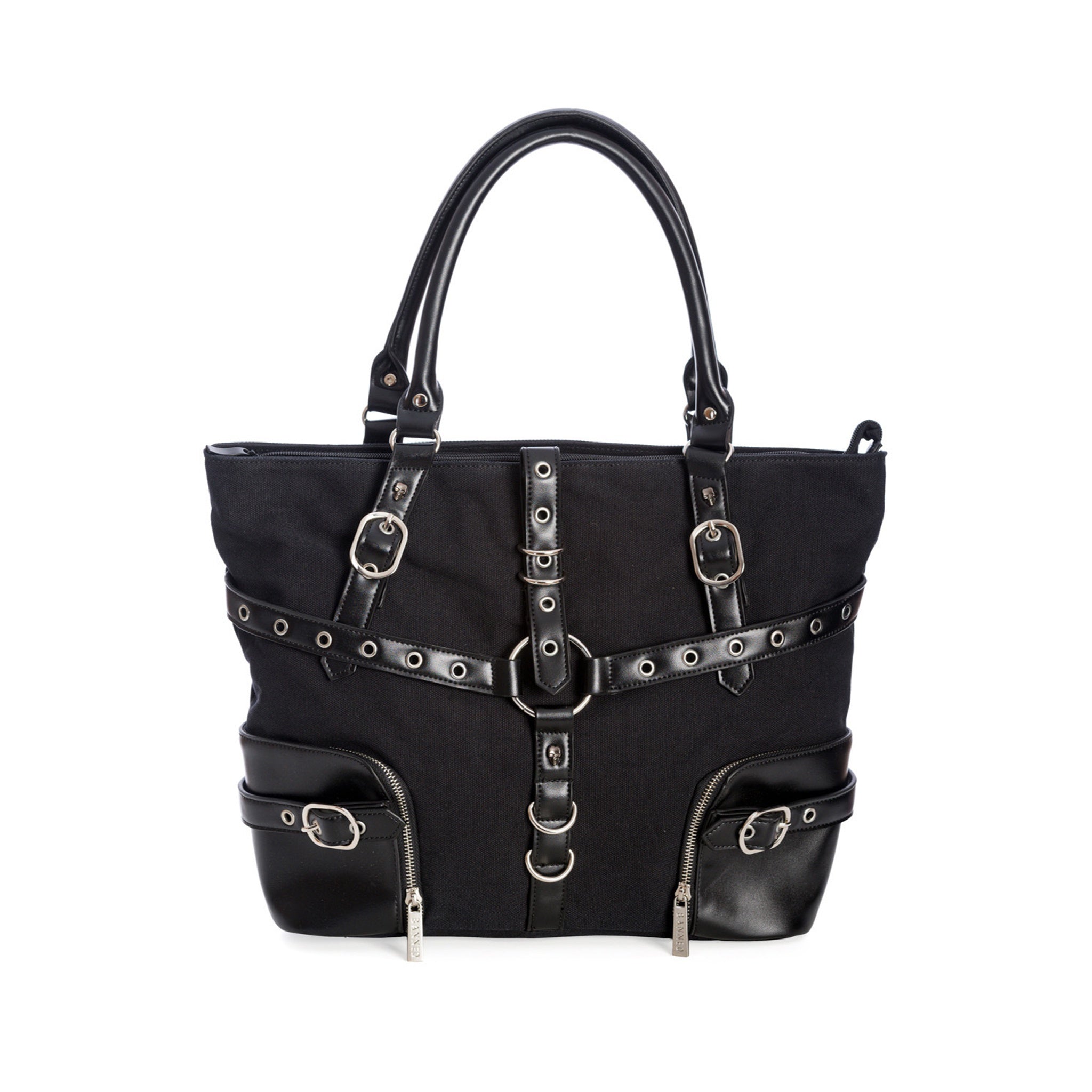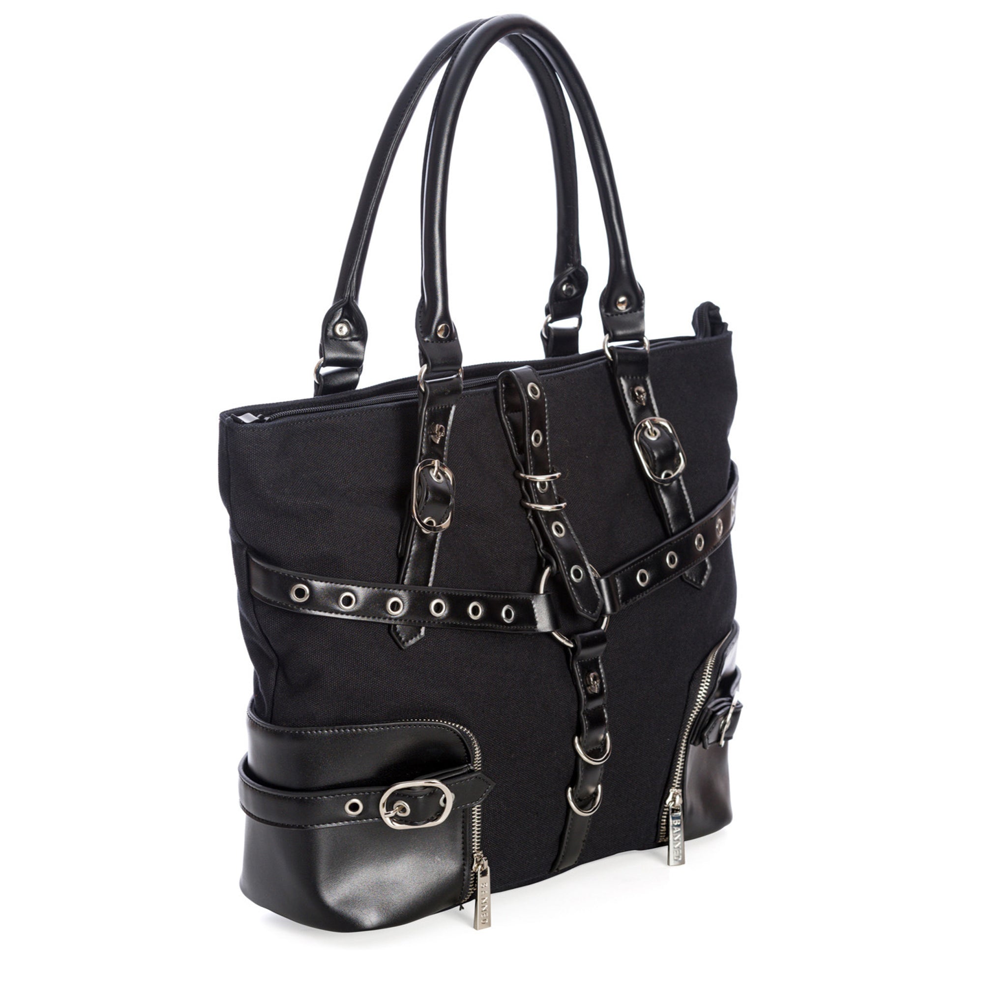 This black canvas tote features silver ring and strap details for a distinctive look. It includes a zippered pocket at the back and a secure zip closure on top. The front is embellished with skull rivets, adding a bold, edgy touch.