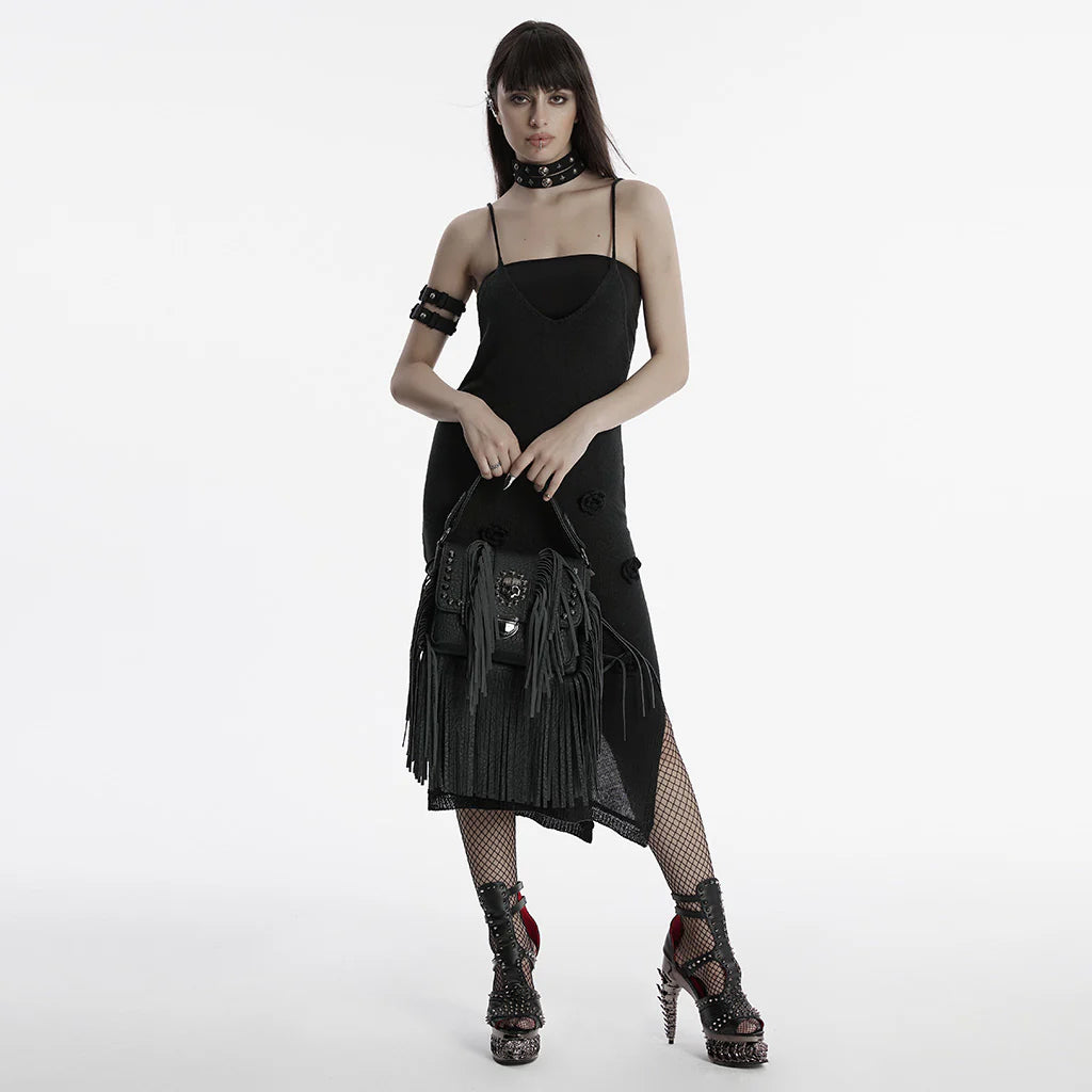 This striking bag merges rebellious style with everyday practicality. Bold studs and flowing fringe create an unmistakably edgy aesthetic that makes a statement. The ergonomic handle adapts to your preference—carry it by hand for a polished look or sling it over your shoulder for hands-free convenience. Inside, you'll find generous space to hold everything you need throughout your day, from work essentials to personal items.