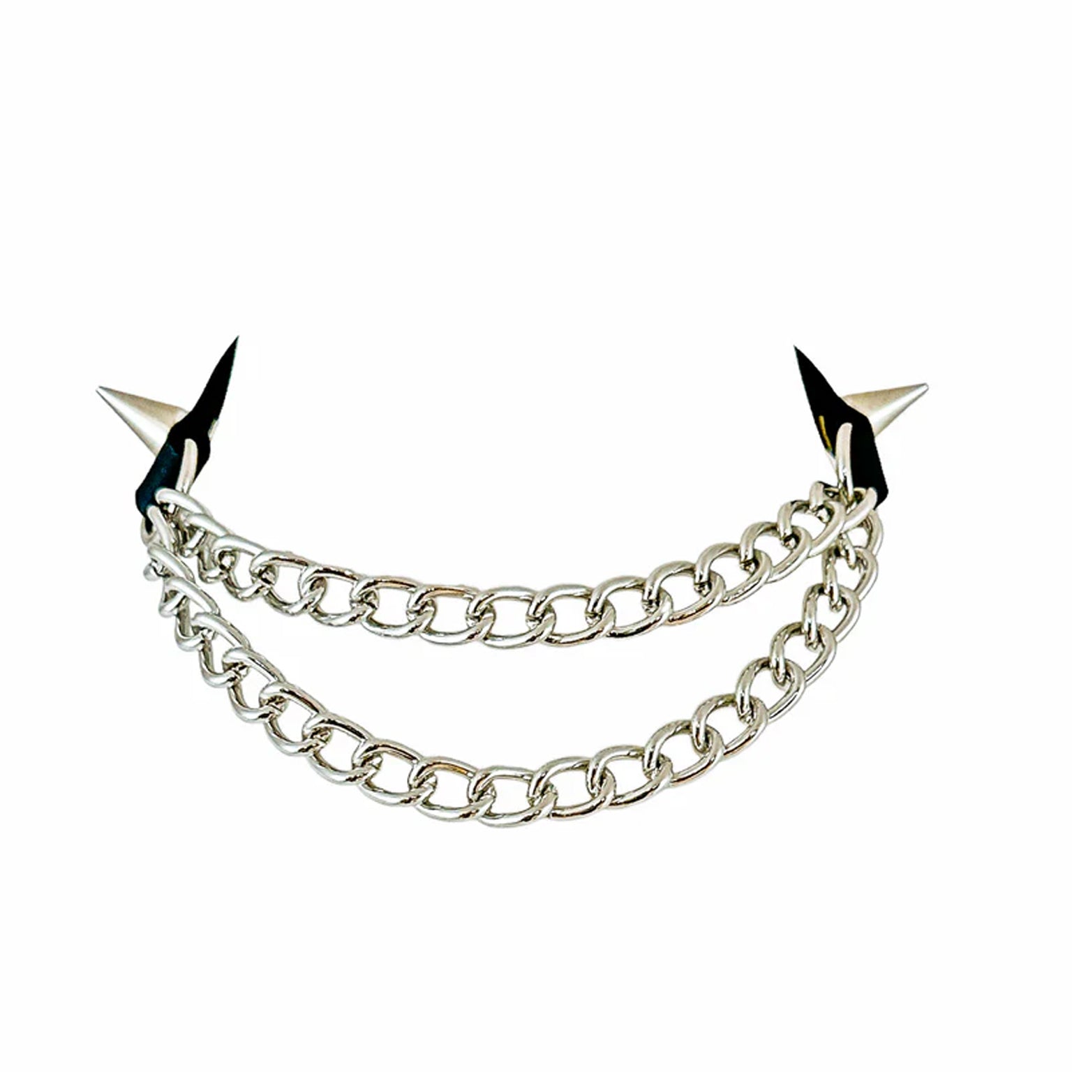 This choker features a 1 1/4" wide band with a 1" spike-adorned hanging chain and a buckle closure at the back for a secure fit.