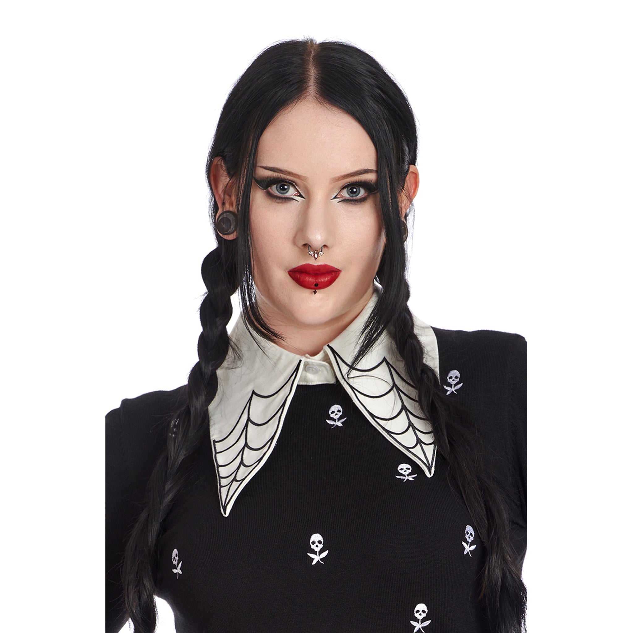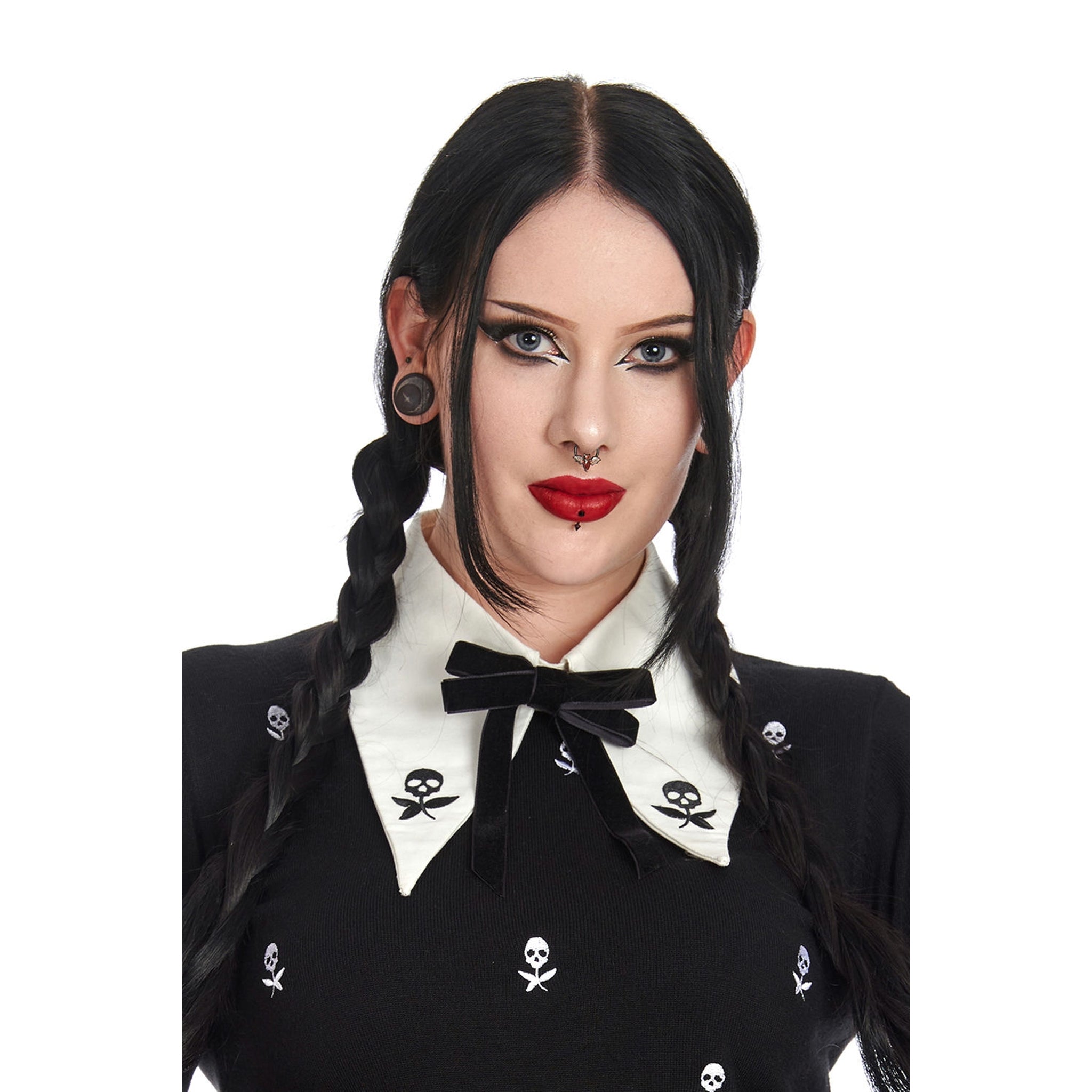 Detachable embroidered collar with a front button closure. The skull design includes a removable velvet bow. Made of 97% cotton and 3% elastane; bow is 100% polyester.