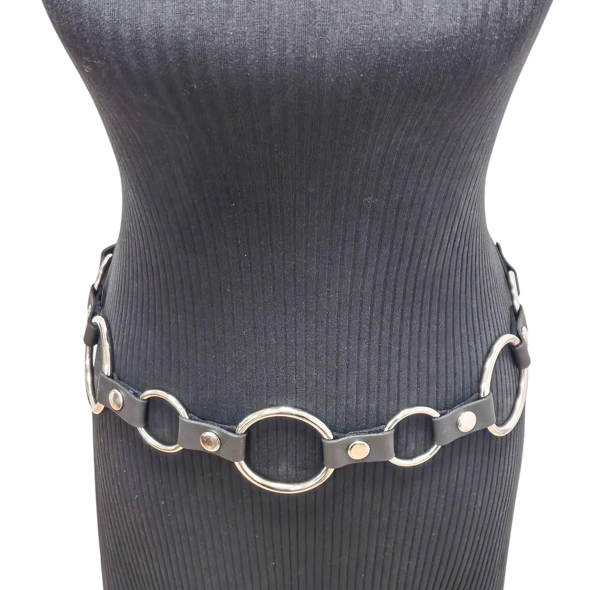 This black leather belt features 1 1/4" and 2" nickel ring links and is made from authentic leather. It fastens with a roller buckle, ensuring a secure and durable fit.