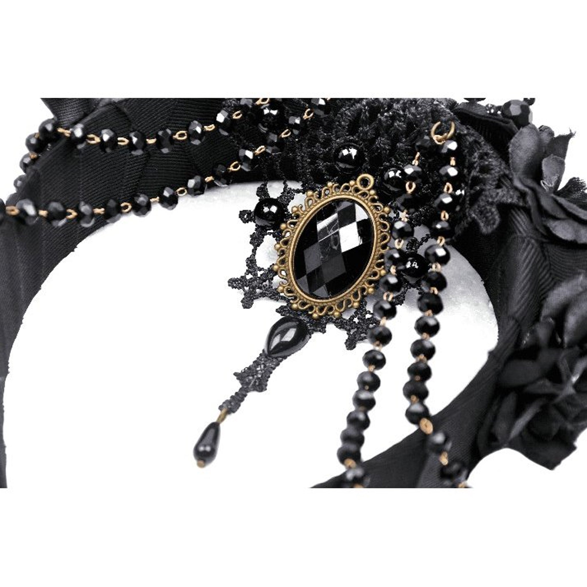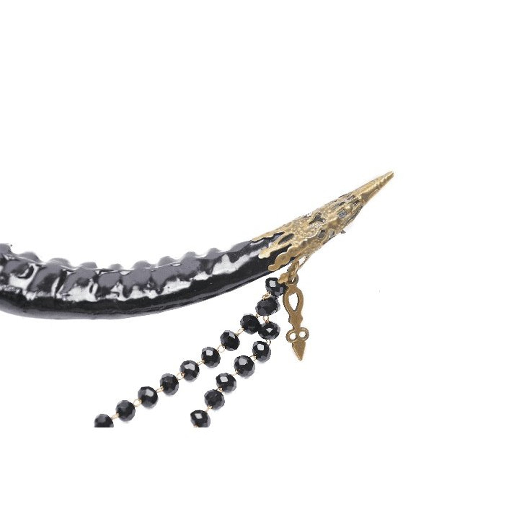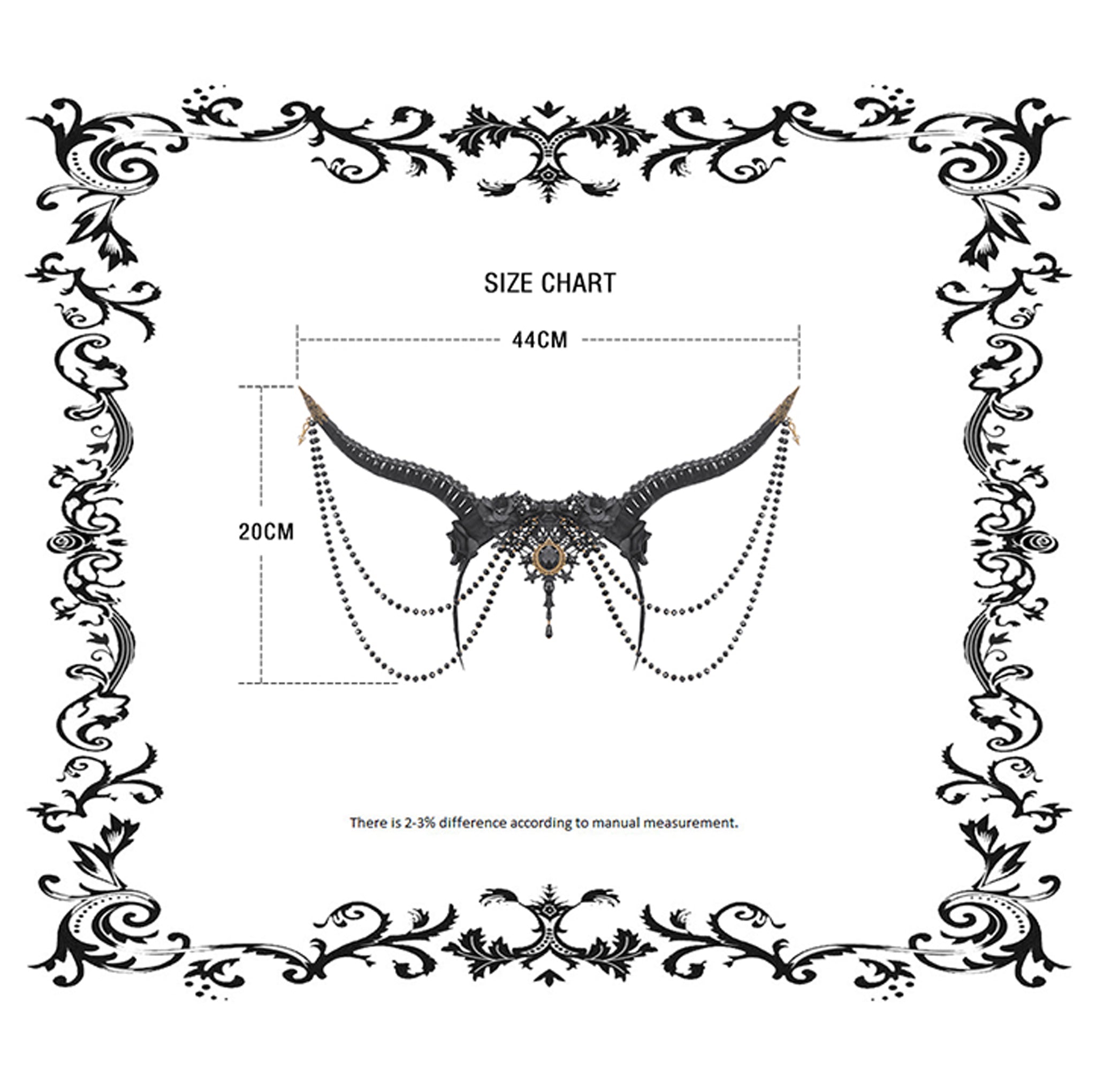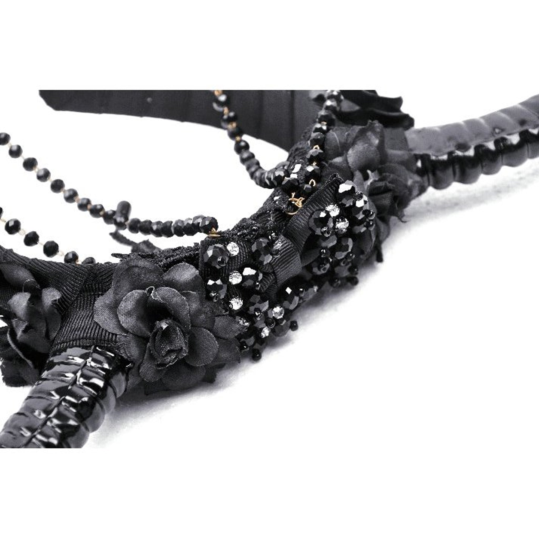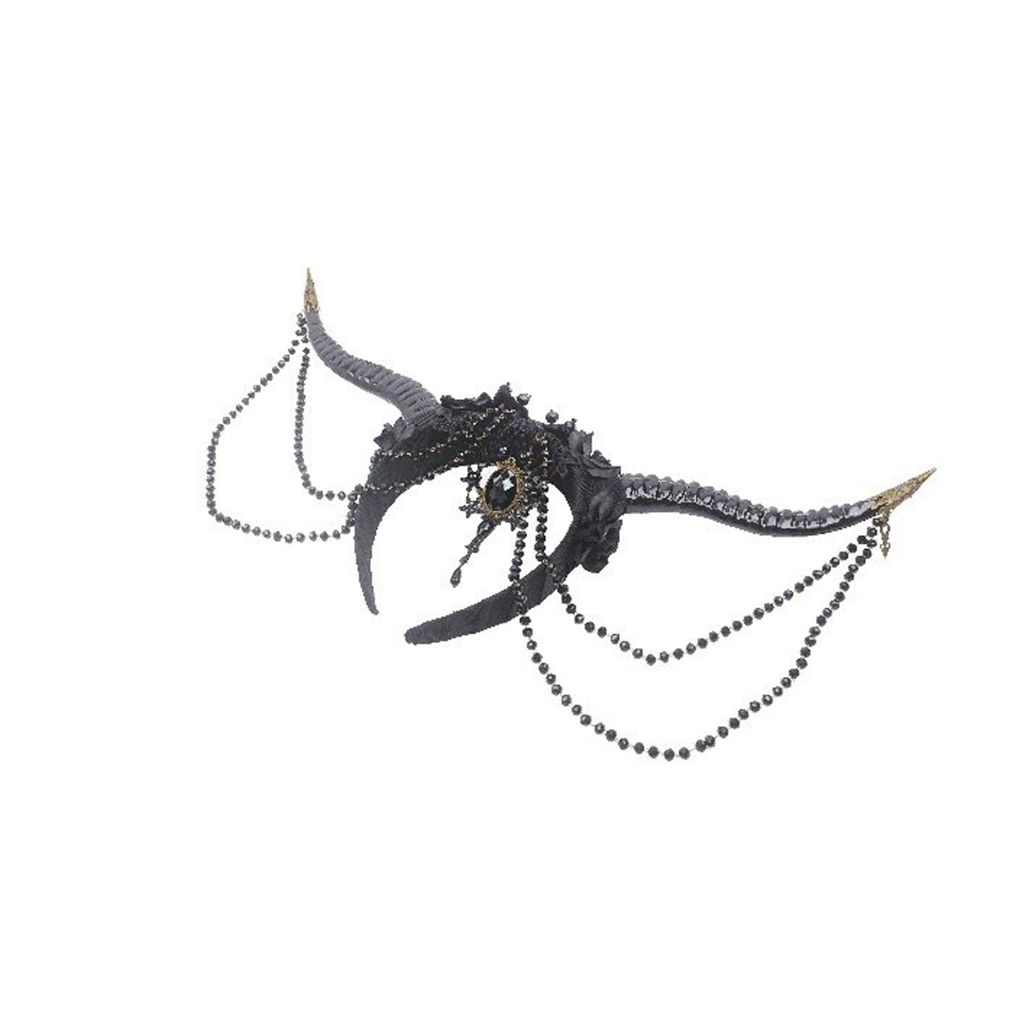 Beautiful symmetrical horns trimmed in gold filigree. Beaded ropes drape from each horn. Horns are attached to a wide headband for comfortable and secure fit. We love the beaded details in the front as well.