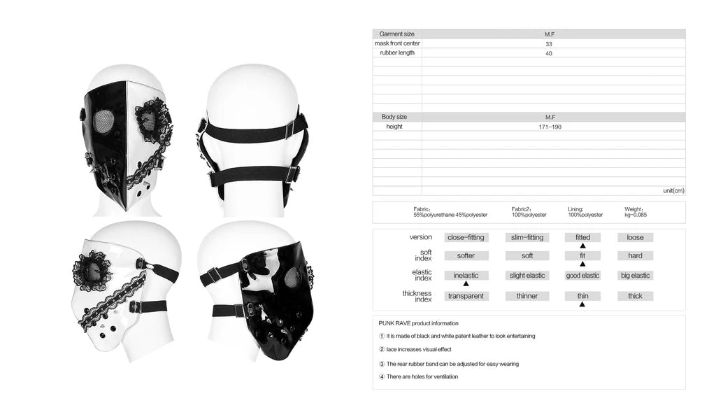 Crafted from striking black and white patent leather, this mask brings an air of mystery and theatrical flair to your look. Delicate lace detailing enhances its visual appeal with intricate texture and dimension. The adjustable rear elastic band ensures a comfortable, secure fit that works for various face shapes, making it effortless to wear throughout your event or occasion.
