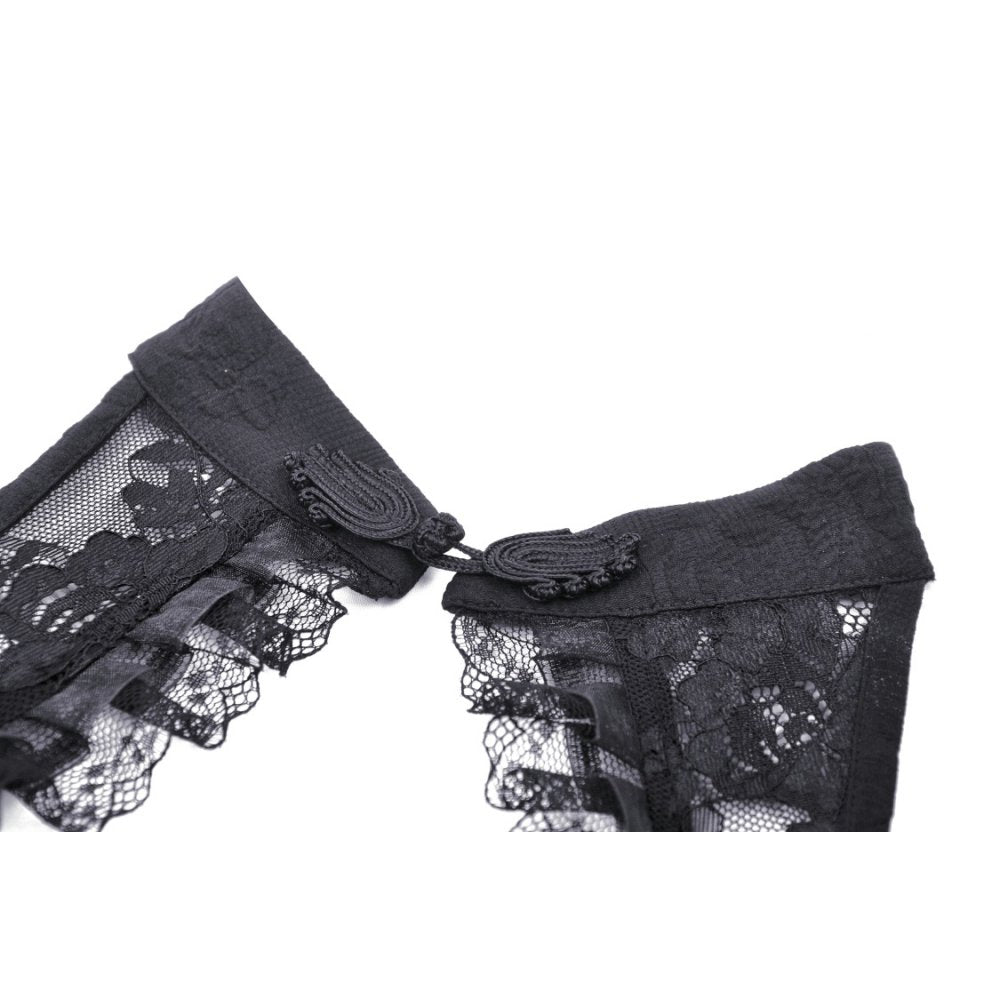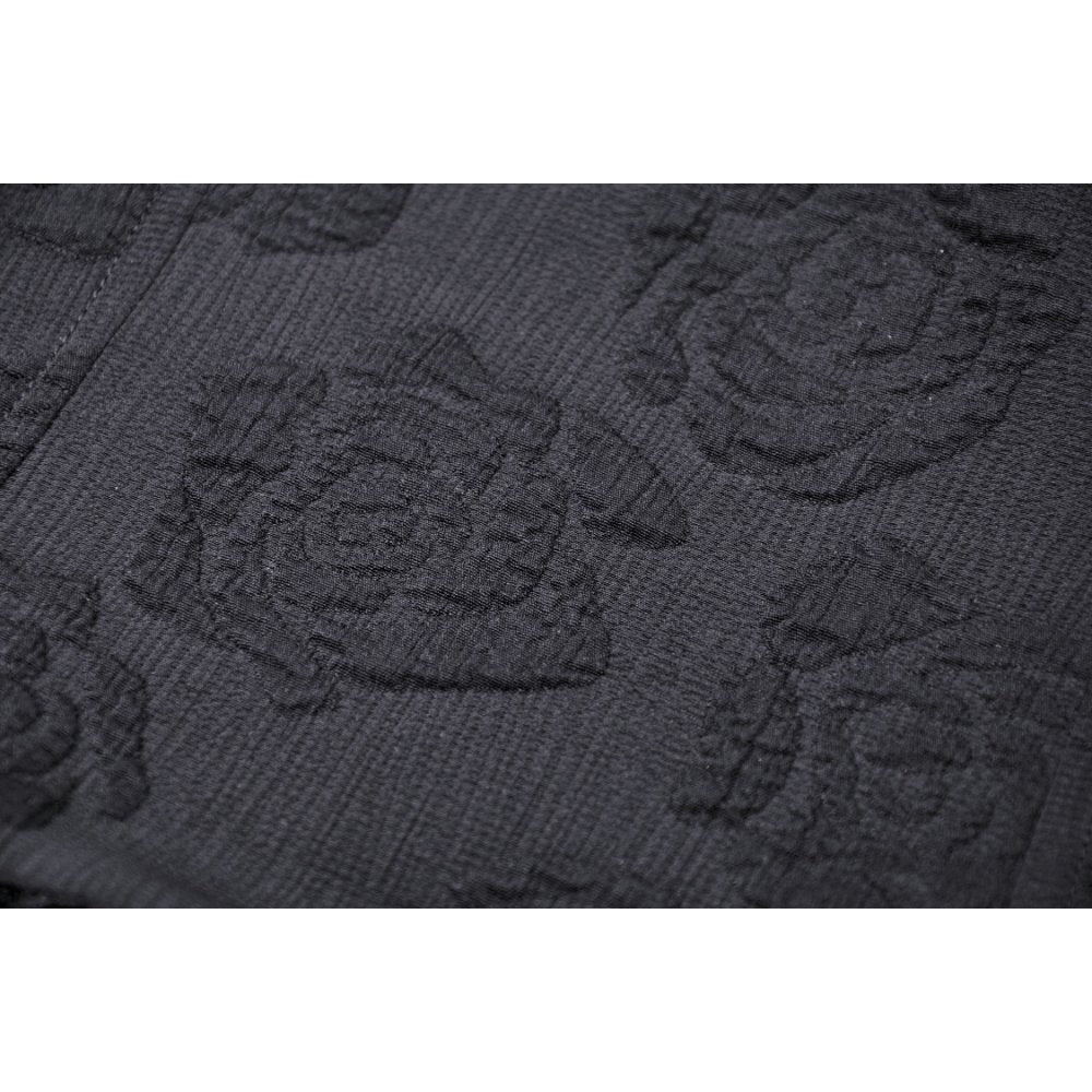 This sophisticated halter dress features expertly crafted embossed floral fabric paired with refined design details. The frog closure and zipper accents provide both security and visual interest, while delicate lace trim and intricate braided embellishments elevate the overall aesthetic.