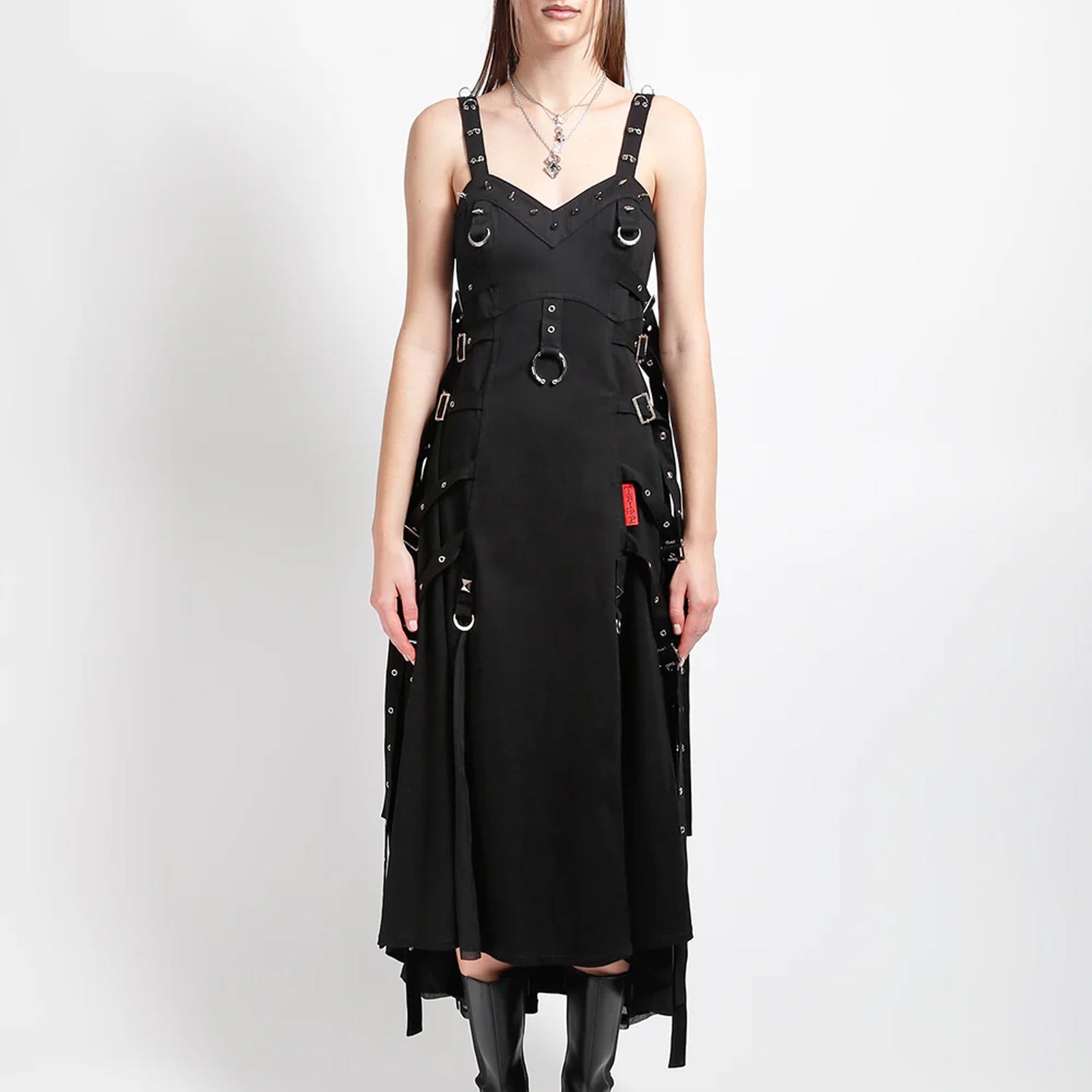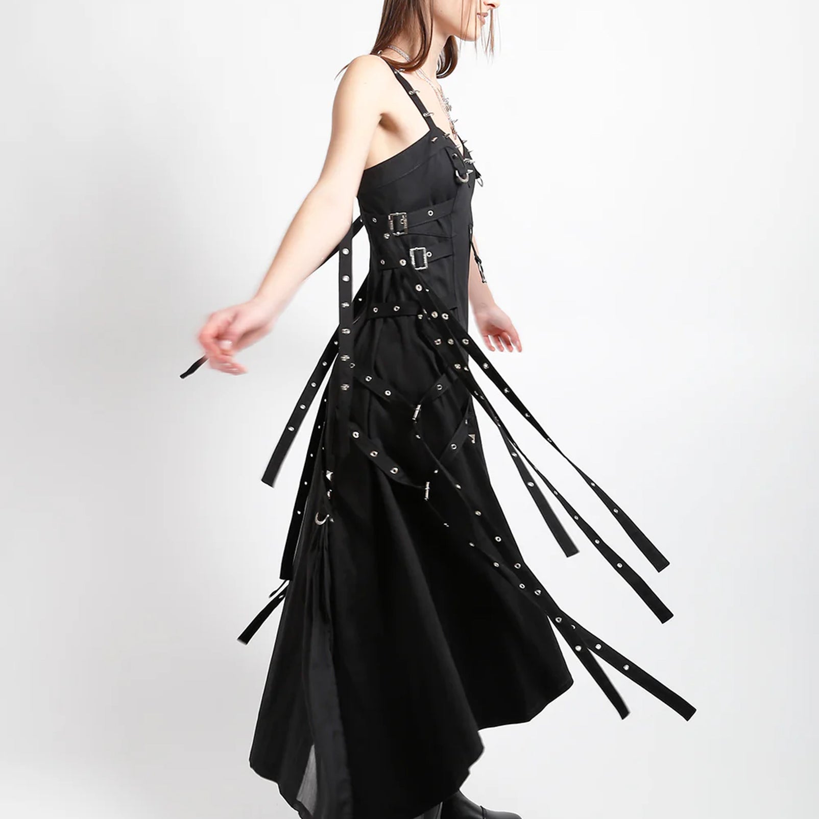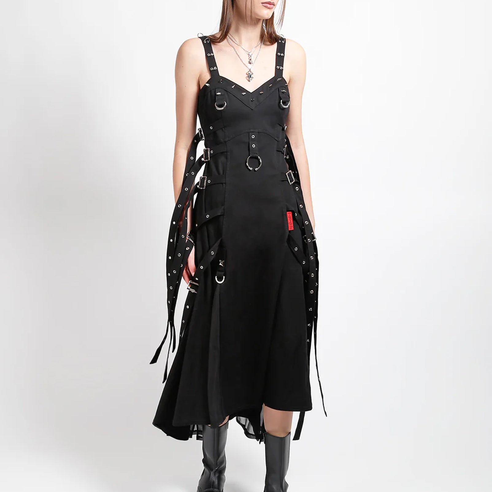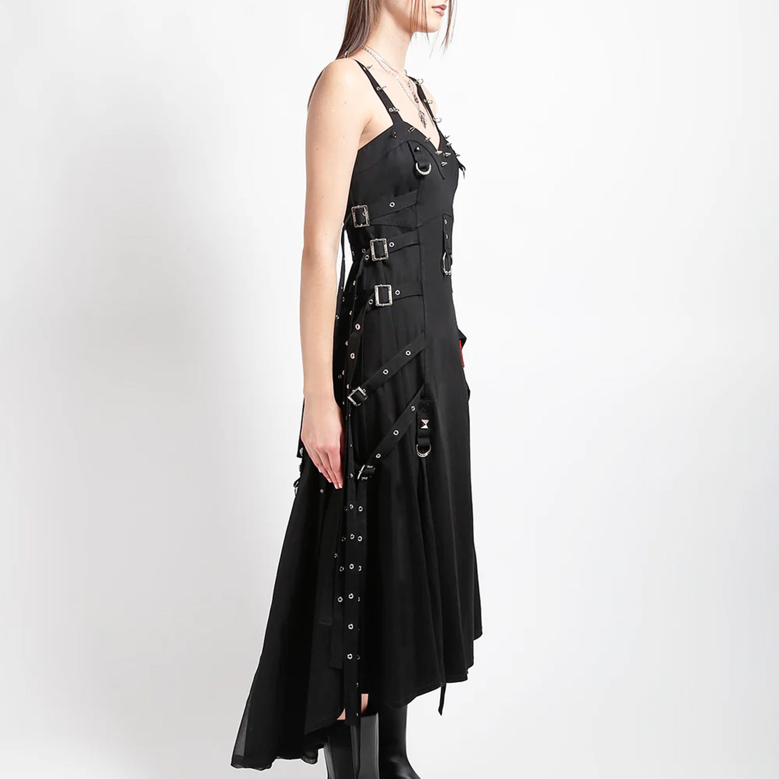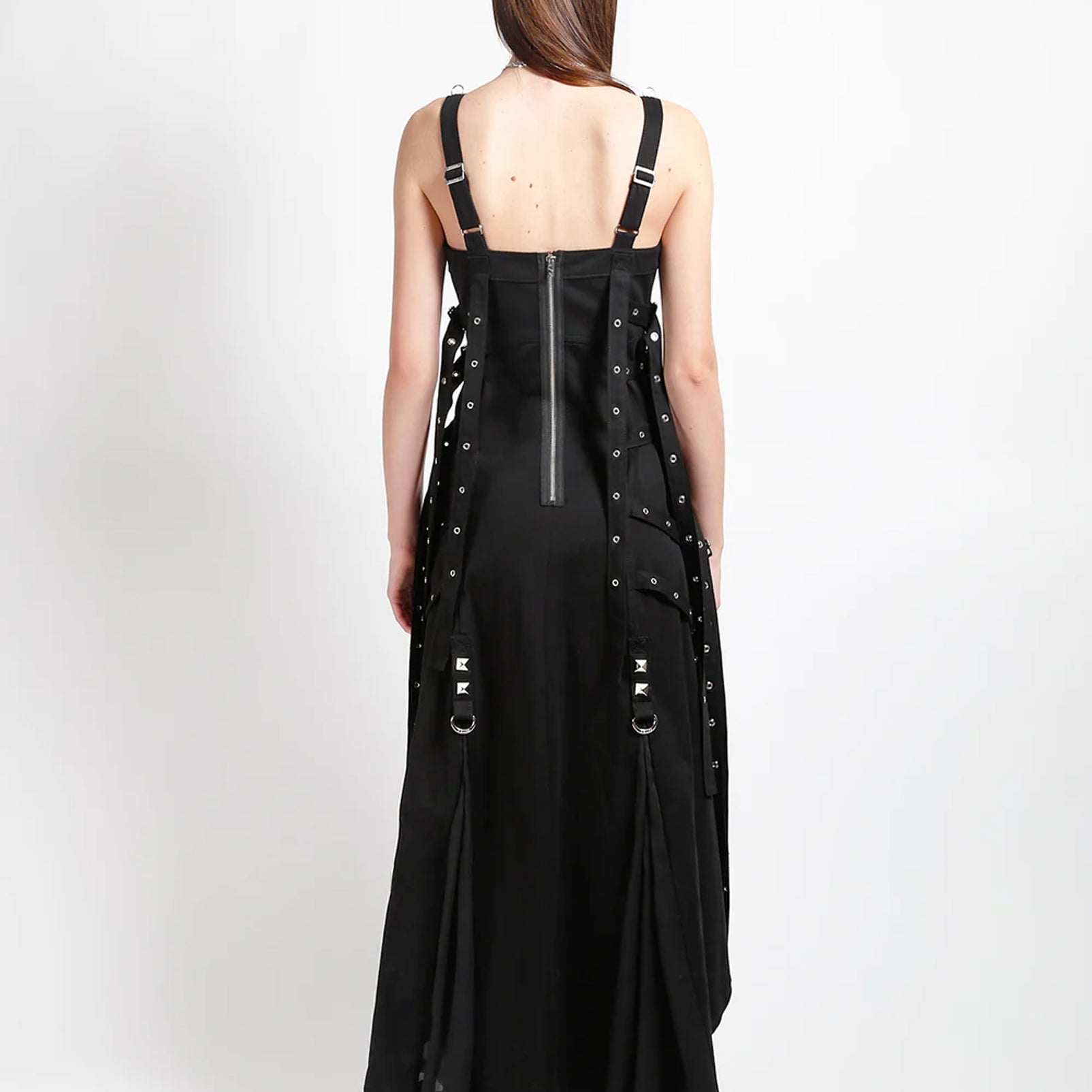 Long dress featuring straps with adjustable side buckles, drings and spike with back zipper closure.