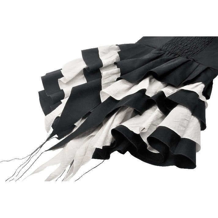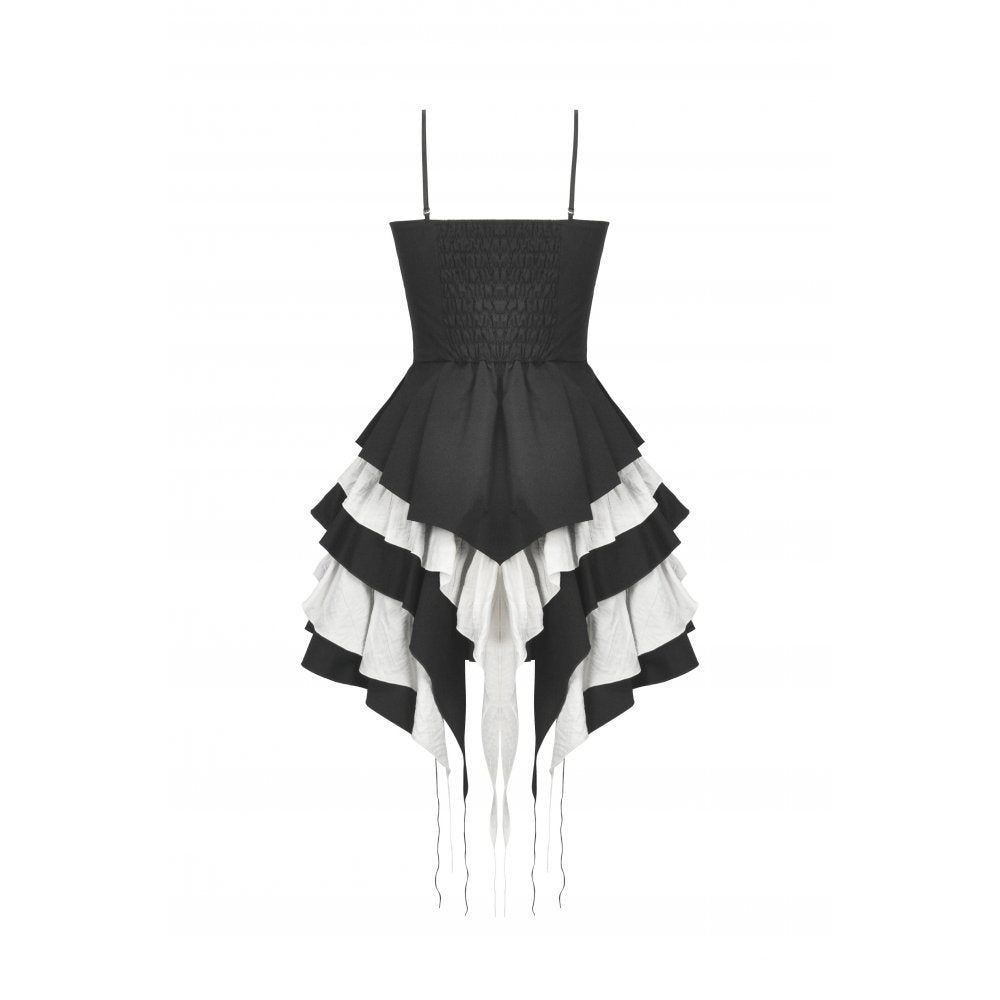 A mesmerizing interplay of black and white, the Nocturne Banquet dress captures the essence of gothic romance. The strapless corset-style bodice highlights the collarbone, with adjustable side laces adding a structured yet delicate touch. A white bow adorns the chest, like moonlight piercing through the night. The layered pleated skirt forms a dramatic silhouette, while the asymmetrical black-and-white lower hem flows like the wings of a nocturnal raven. Elegant yet bold, this dress is perfect for a darkly enchanting soirée.