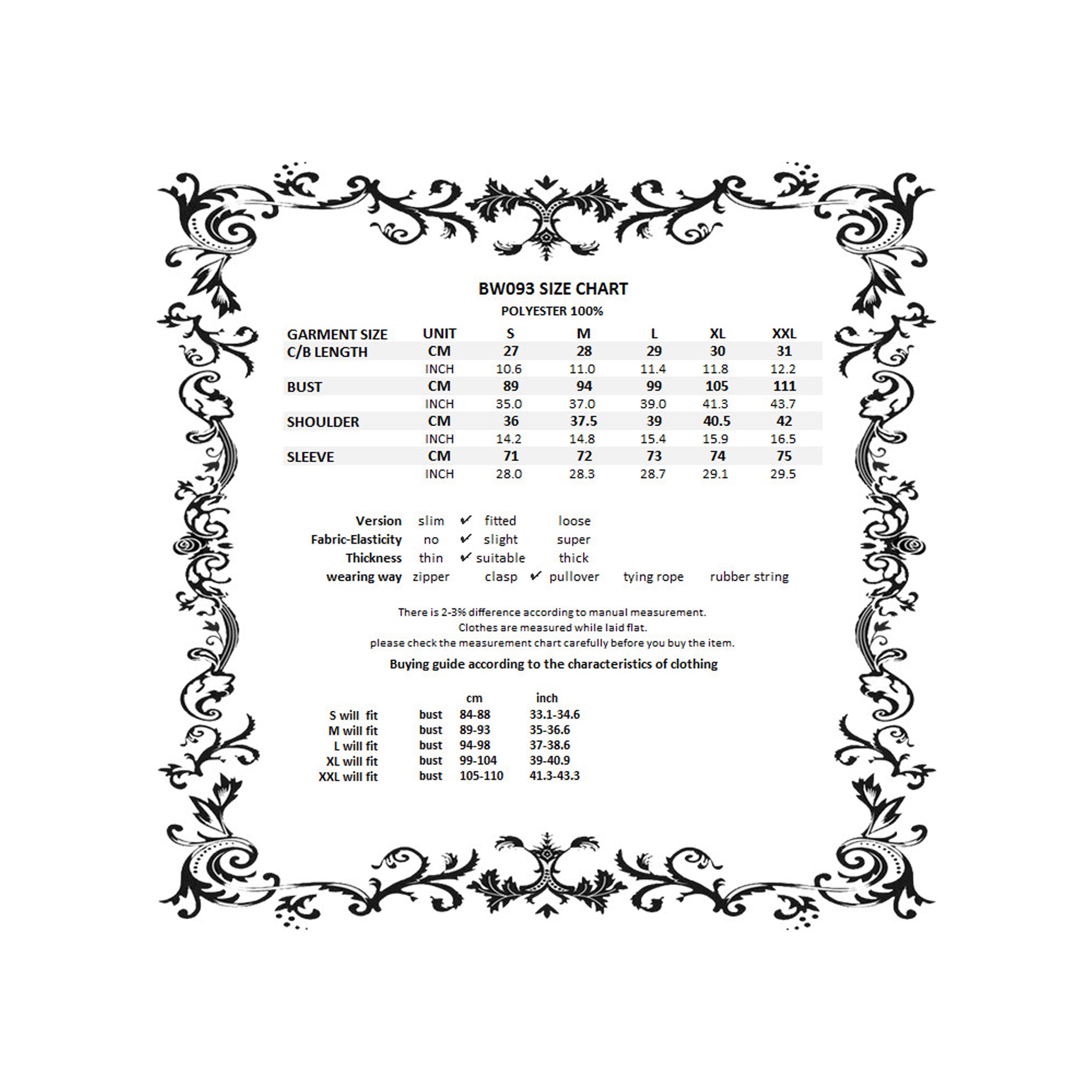 See size chart for more sizing information