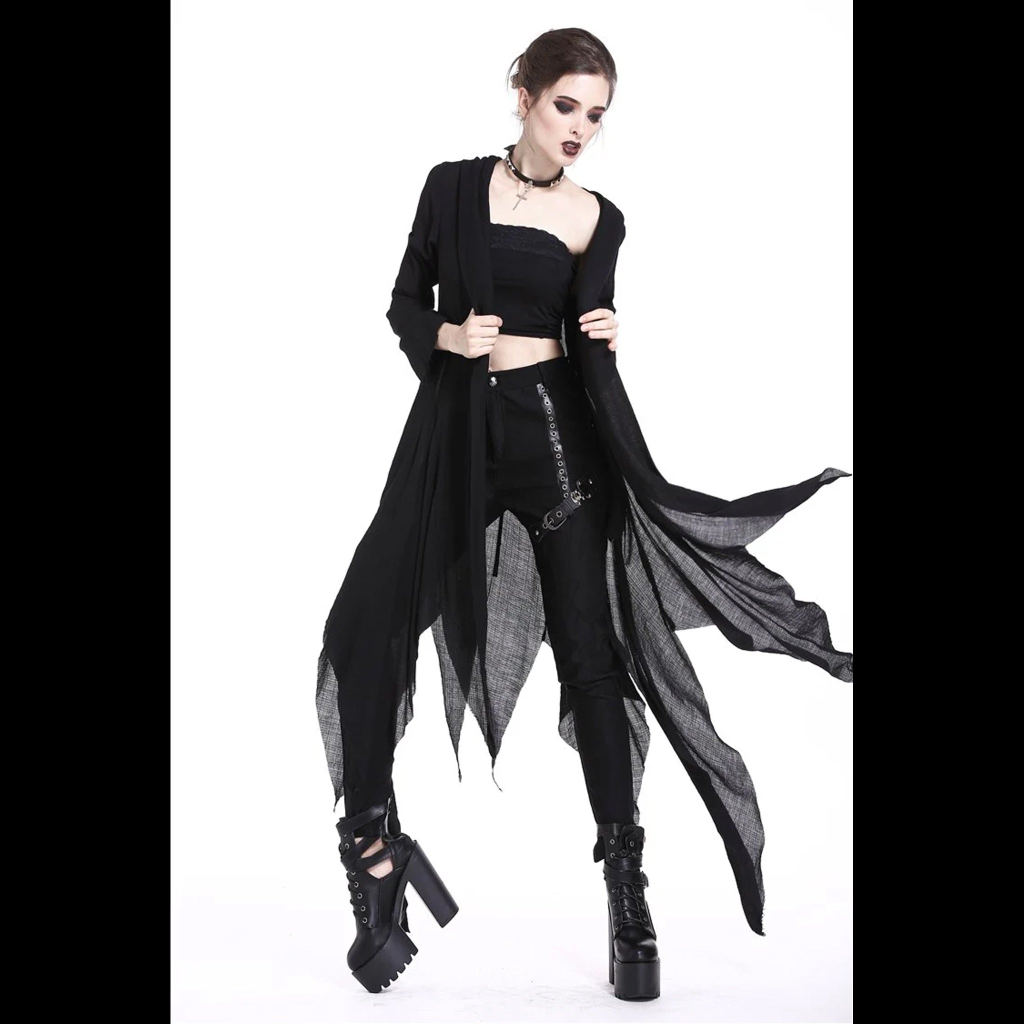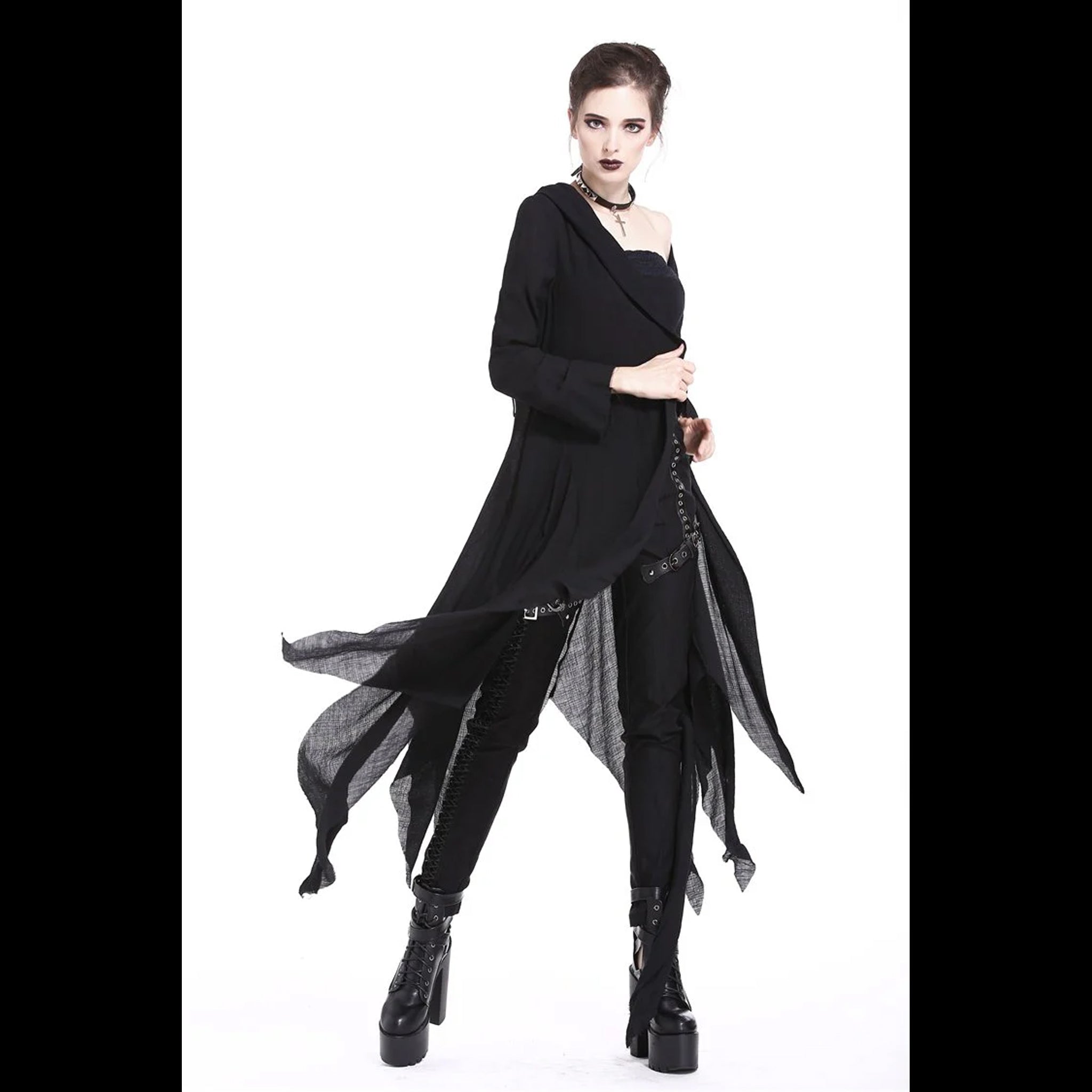Hooded jacket is light weight layered and distressed.  The back has a moon applique over mesh and silver beaded trim detail.  Not shown is the belt made from matching material.