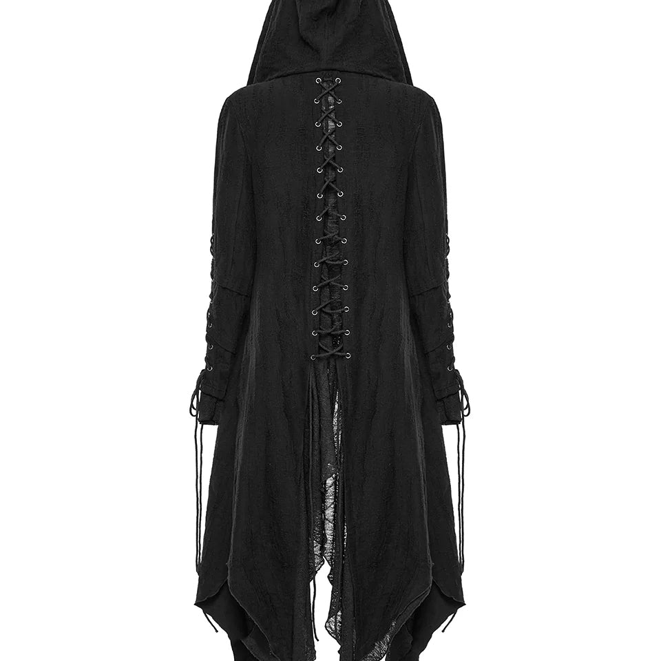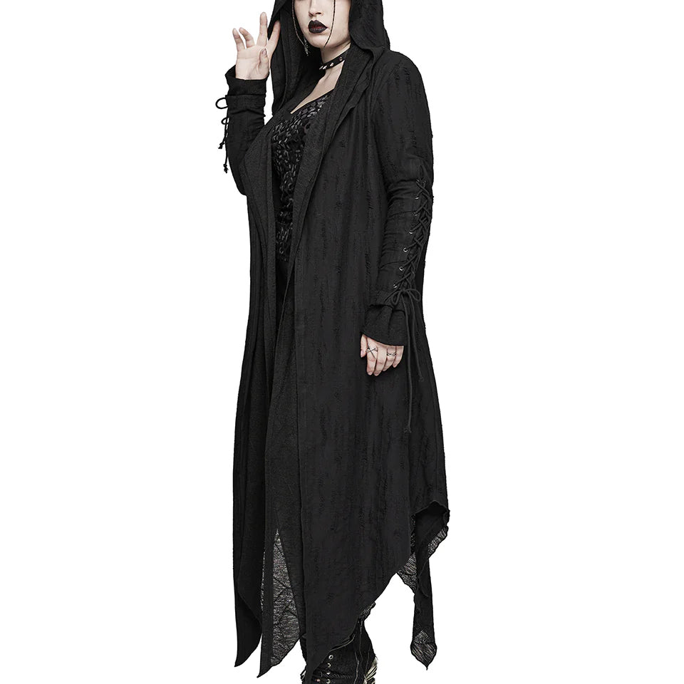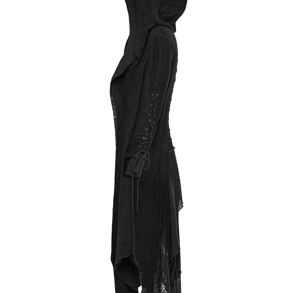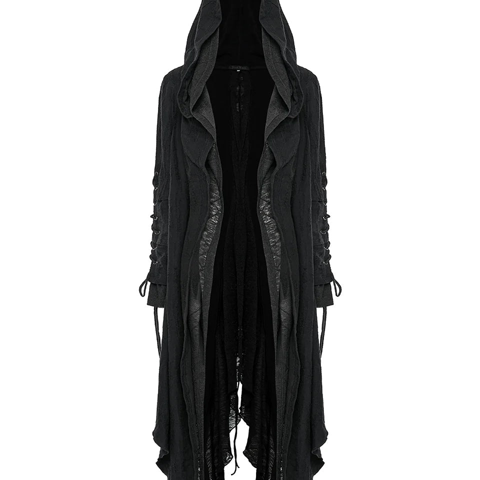 Embrace your edgy aesthetic with this Apocalyptic Hoodie, designed to make a bold statement. Crafted from distressed knit and textured striped fabric, it features a distinctive double-layered hood with draping accents that balance structure with comfort while flattering your silhouette. Adjustable cotton drawstrings at the sleeves and a rear threading strap let you customize the fit to your preference. Layered sleeve construction adds visual depth, while the open front design offers versatile styling options.