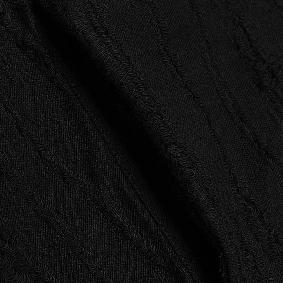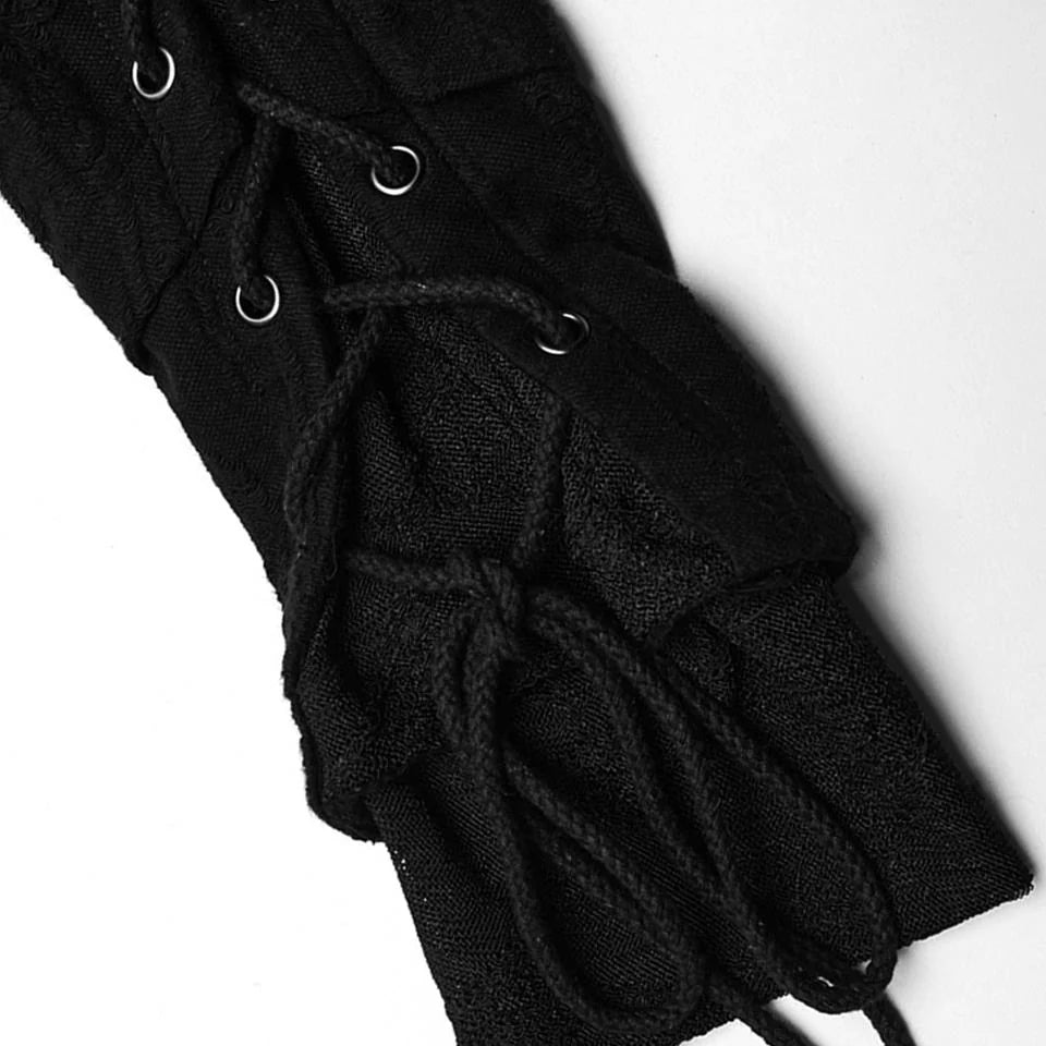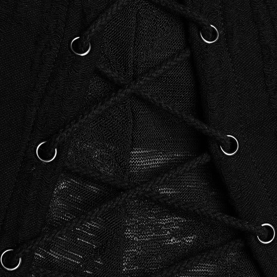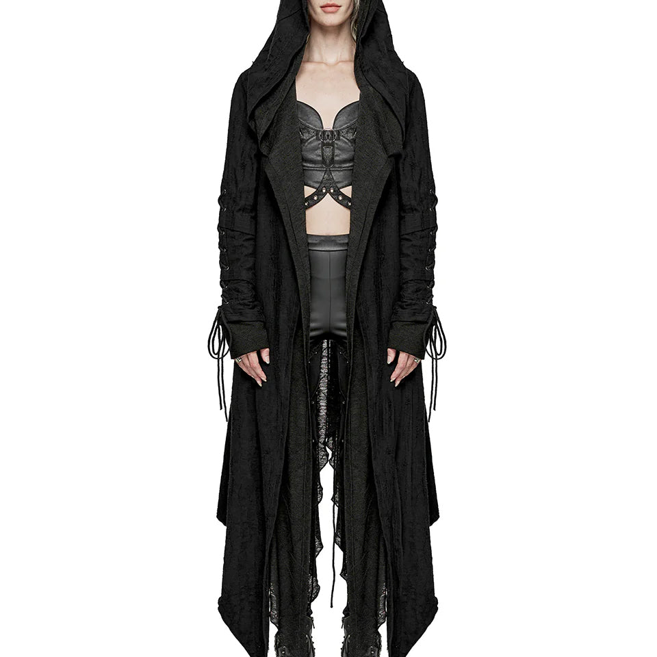 Embrace your edgy aesthetic with this Apocalyptic Hoodie, designed to make a bold statement. Crafted from distressed knit and textured striped fabric, it features a distinctive double-layered hood with draping accents that balance structure with comfort while flattering your silhouette. Adjustable cotton drawstrings at the sleeves and a rear threading strap let you customize the fit to your preference. Layered sleeve construction adds visual depth, while the open front design offers versatile styling options.