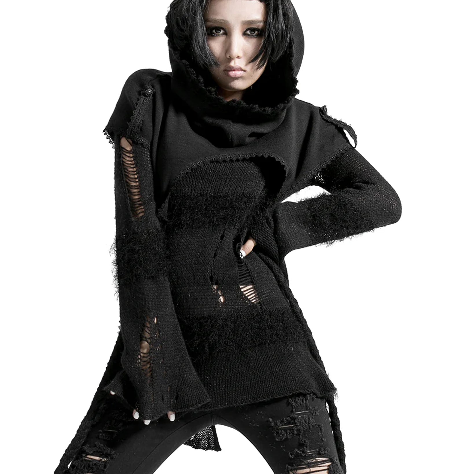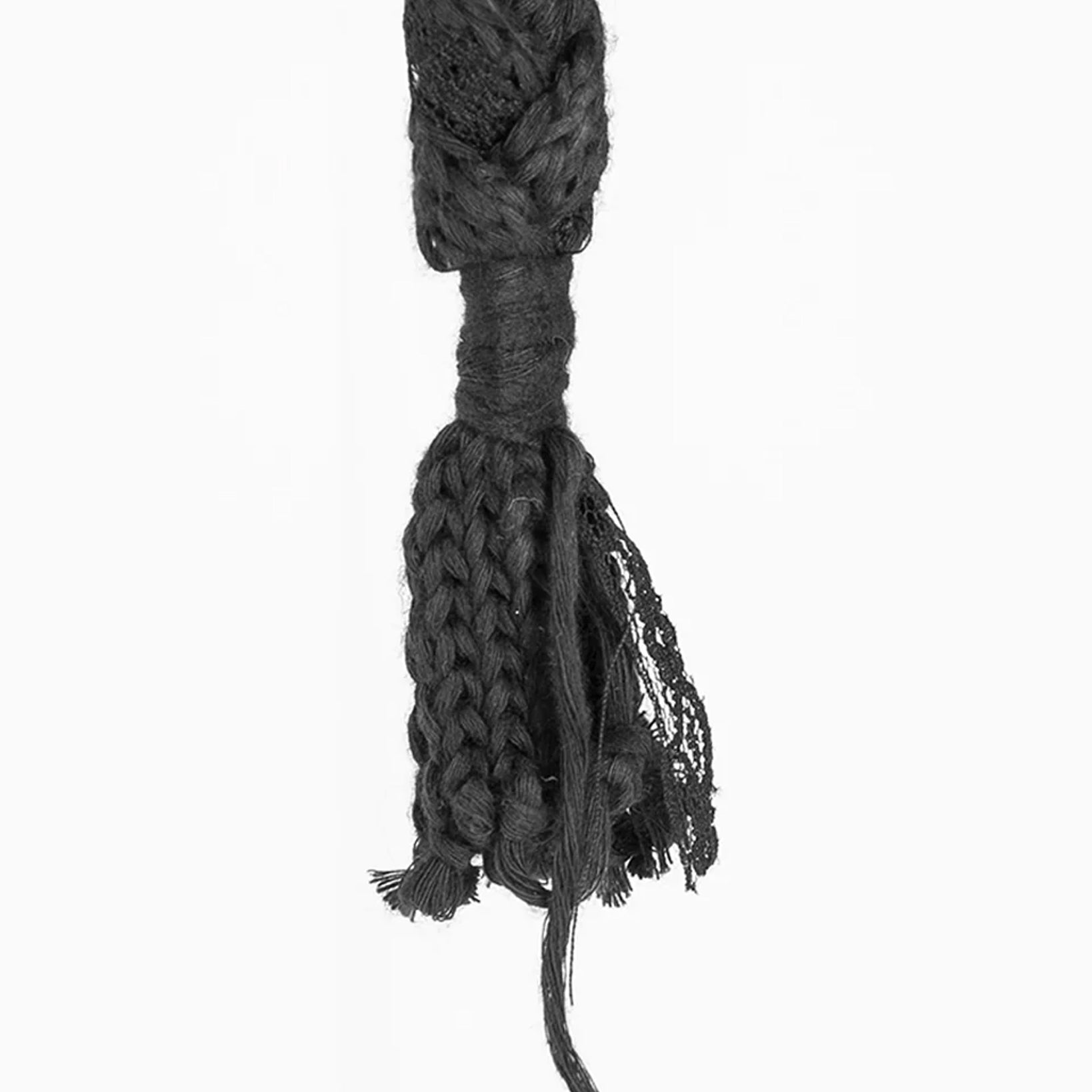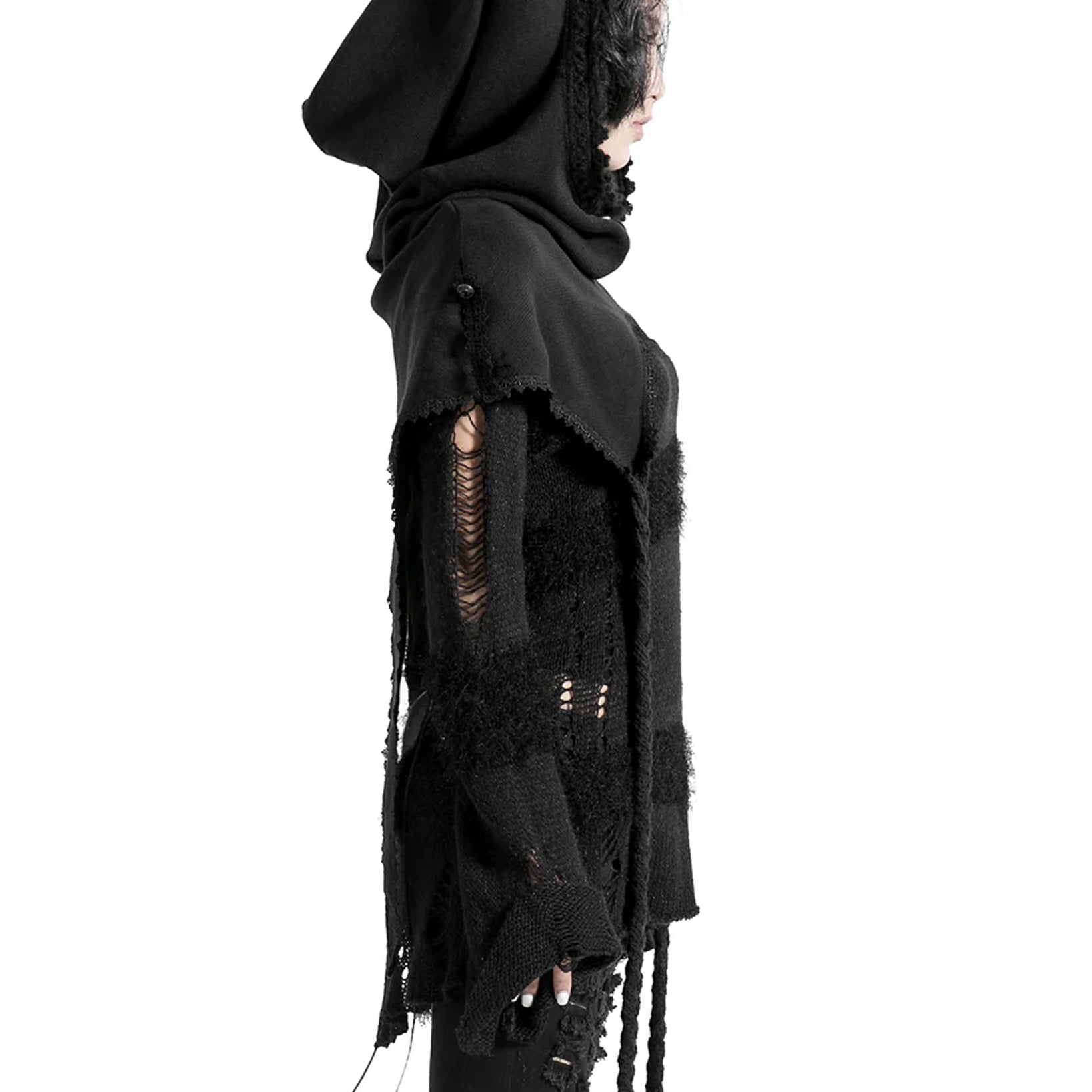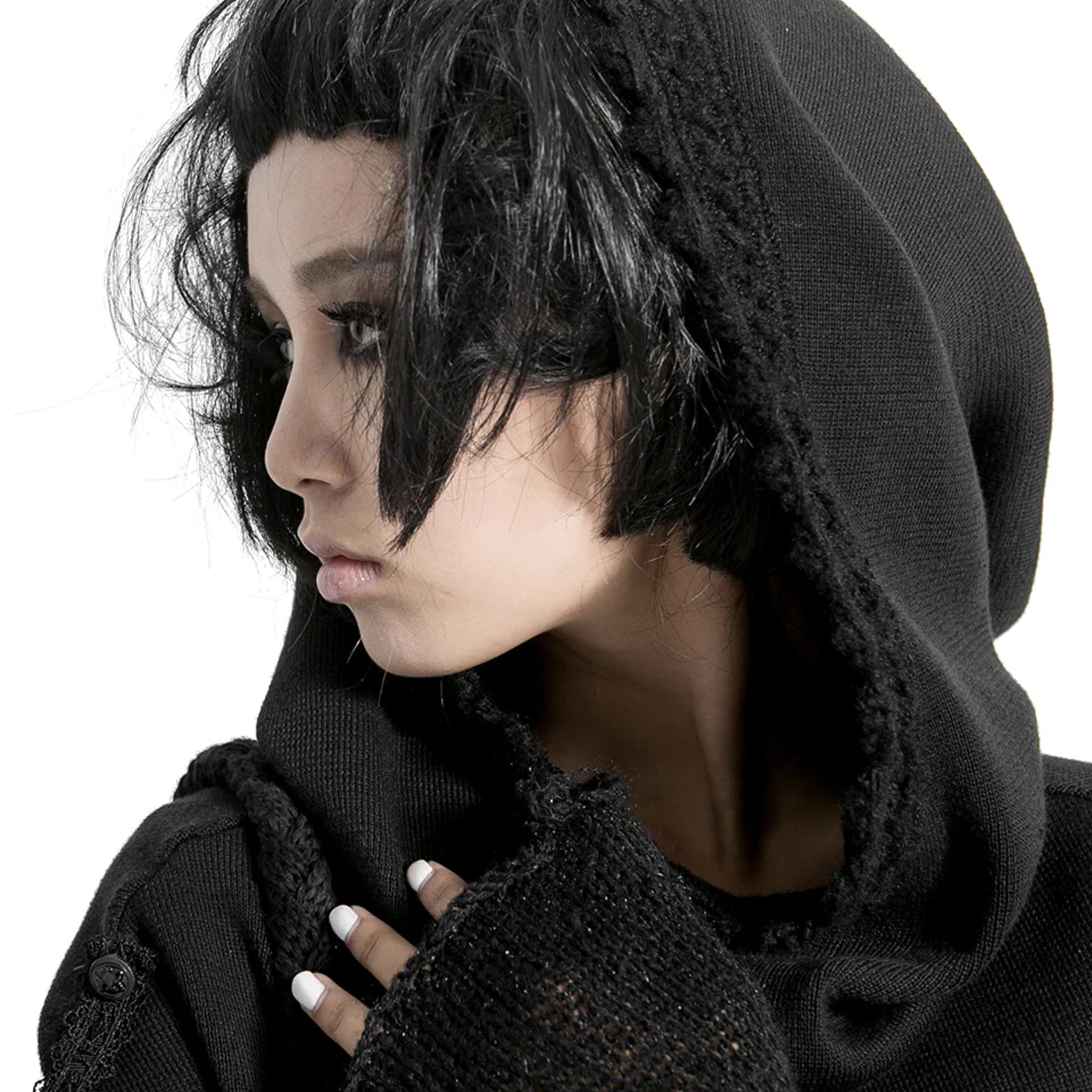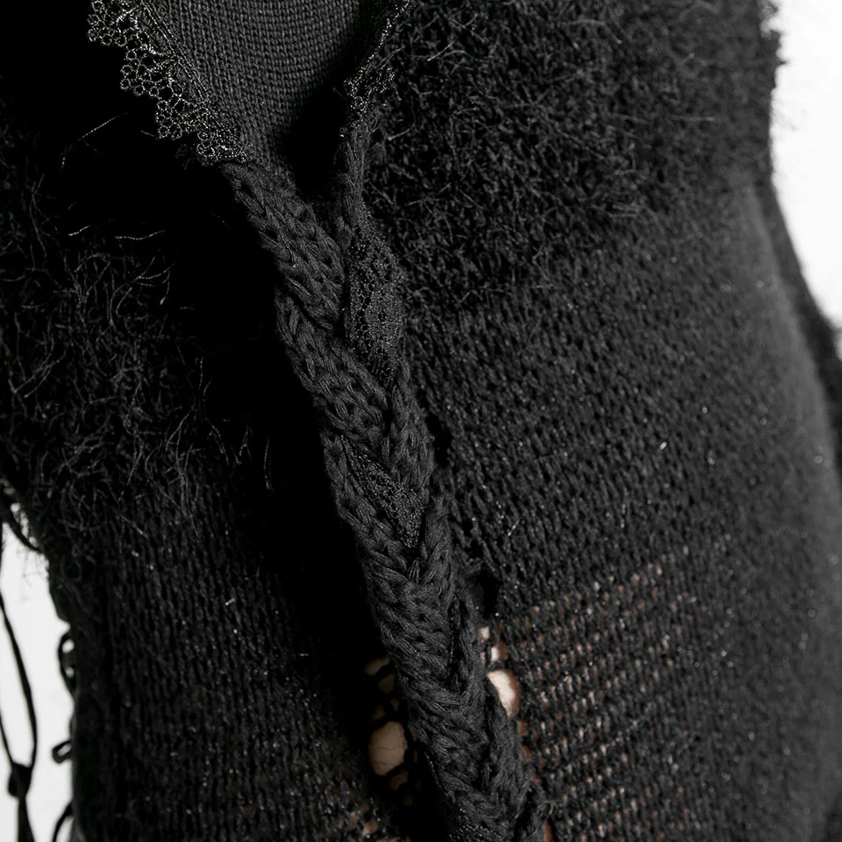 The Gothic Poncho Capelet is a knitted black wool garment that reinterprets the traditional poncho with a striking pointed hem and braided tassel accents. Designed as a pullover, it is easily worn by slipping it over the head, combining classic comfort with a distinctive gothic edge.