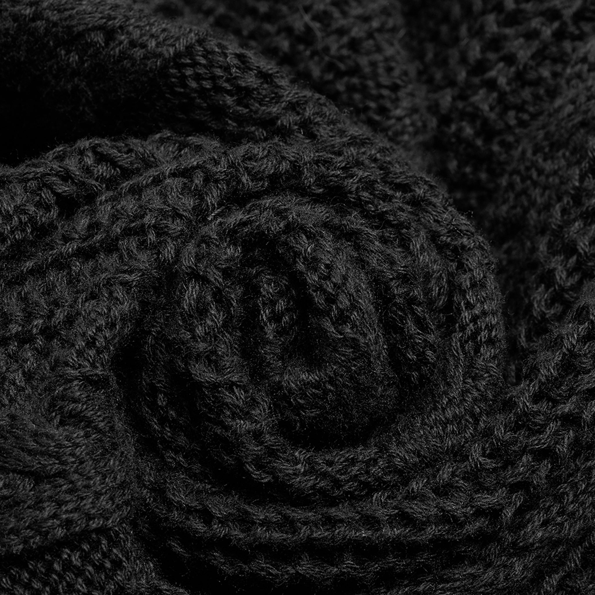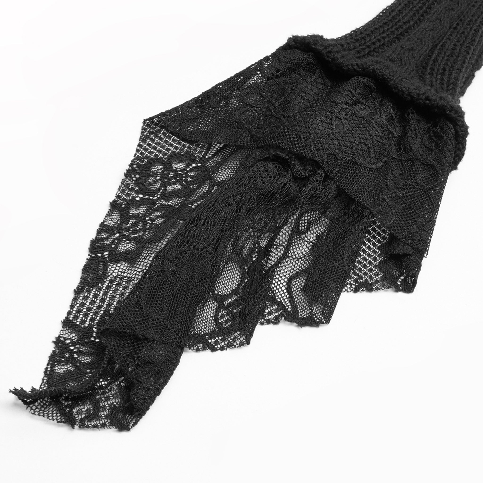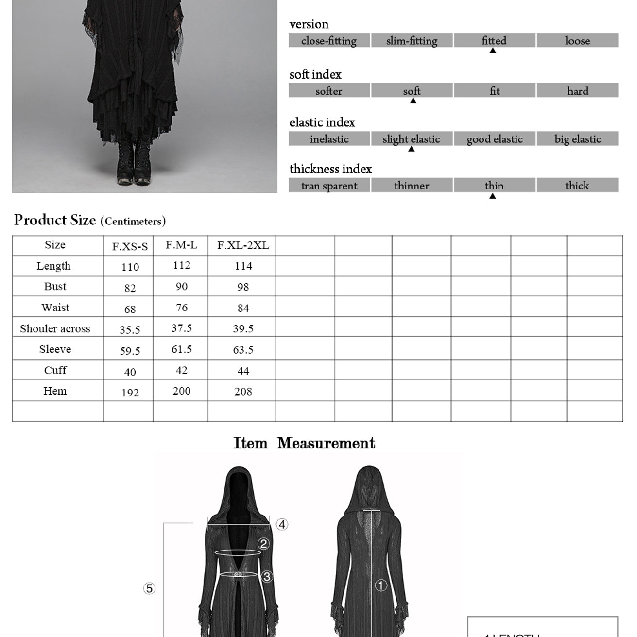 This cardigan features a large hood and a front clasp hook closure for secure wear. It is accented with substantial lace trim on the cuffs and hem, adding a refined gothic touch. Equipped with two side pockets, it offers practicality alongside style. While not overly heavy, it provides sufficient warmth for cooler days.
