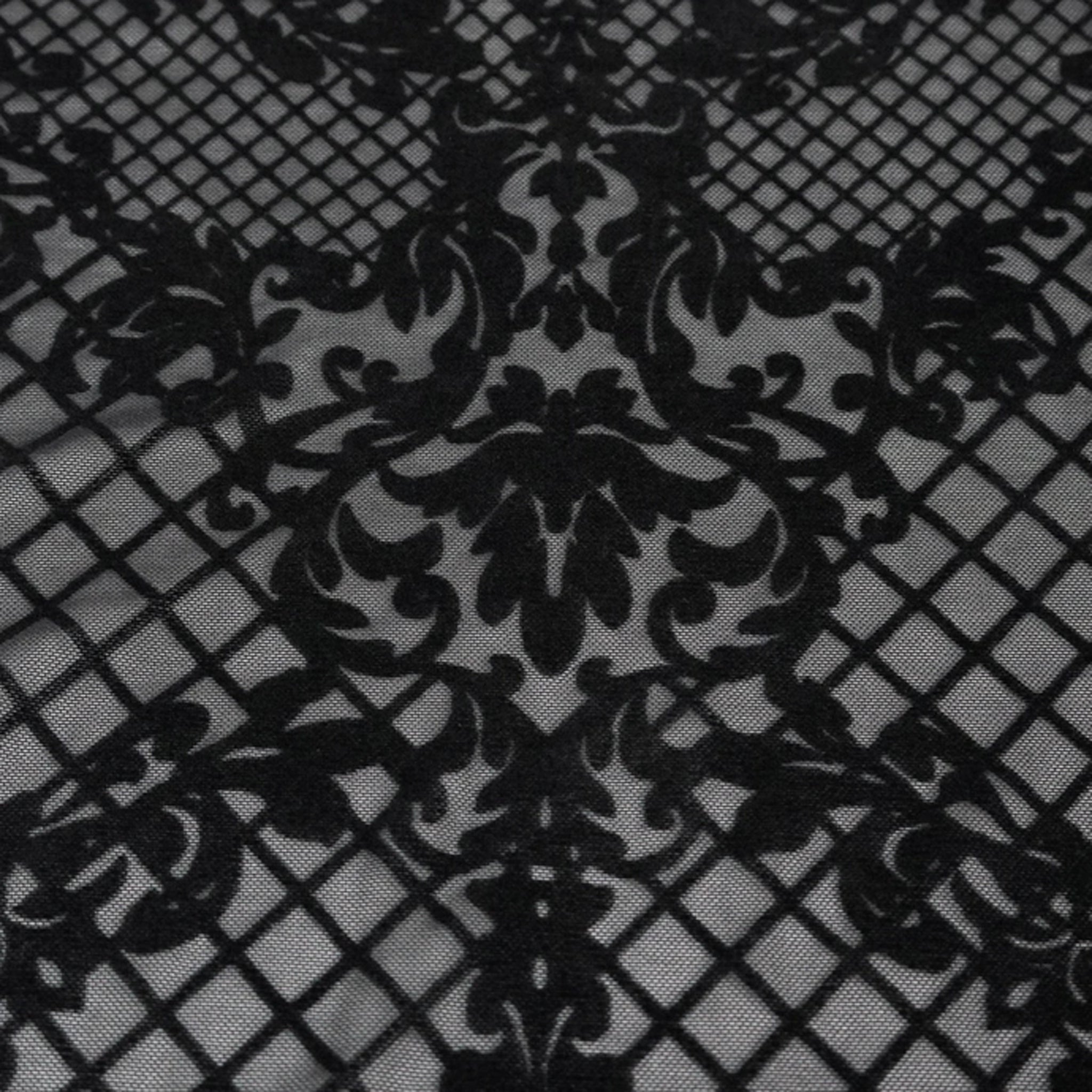 This classic capelet showcases a high-low hem and elegant draping at the back, complemented by a hood. Crafted from scroll velvet mesh, it is detailed with lace trim and finishes with a velvet ribbon tie at the front.