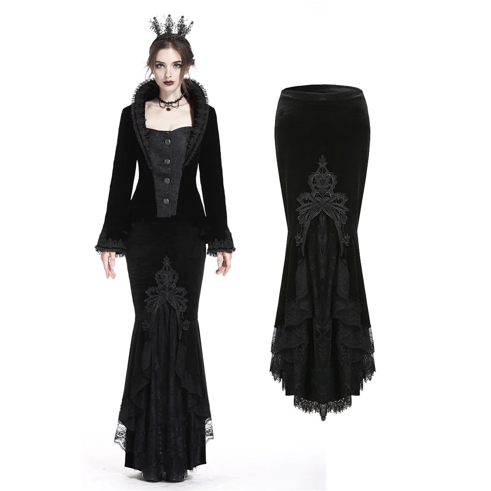 Beautiful mermaid style maxi skirt with lace front applique details and lace overlay front.  Velvet has a nice stretch.  Zipper closure.  Waistband does not stretch so please see measurement chart.