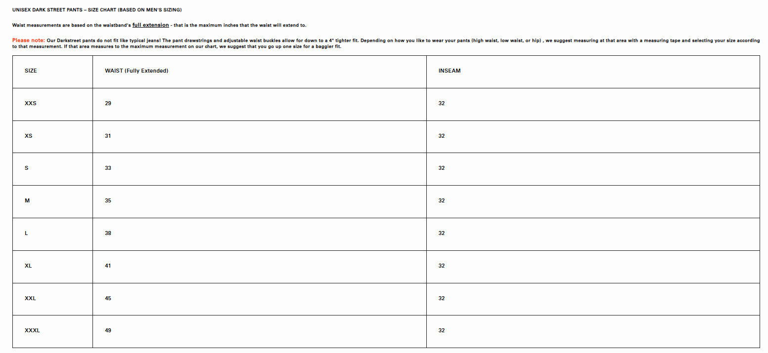 – Refer to Unisex Darkstreet Pant - Size Chart (Based on Men's Sizing)