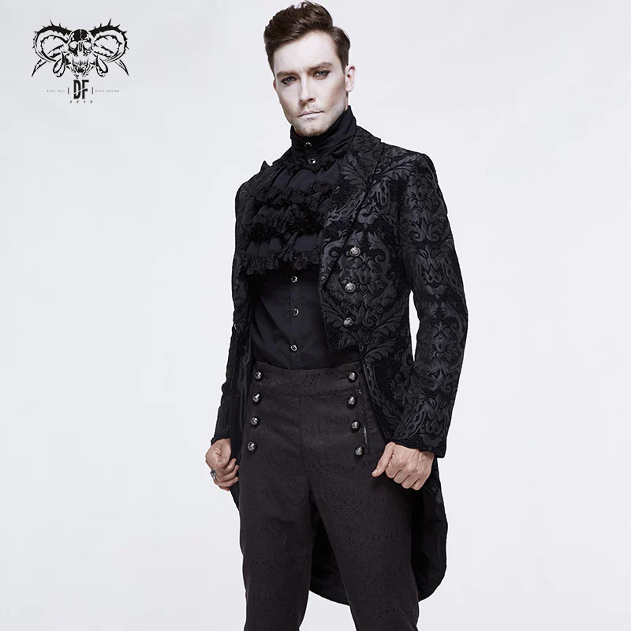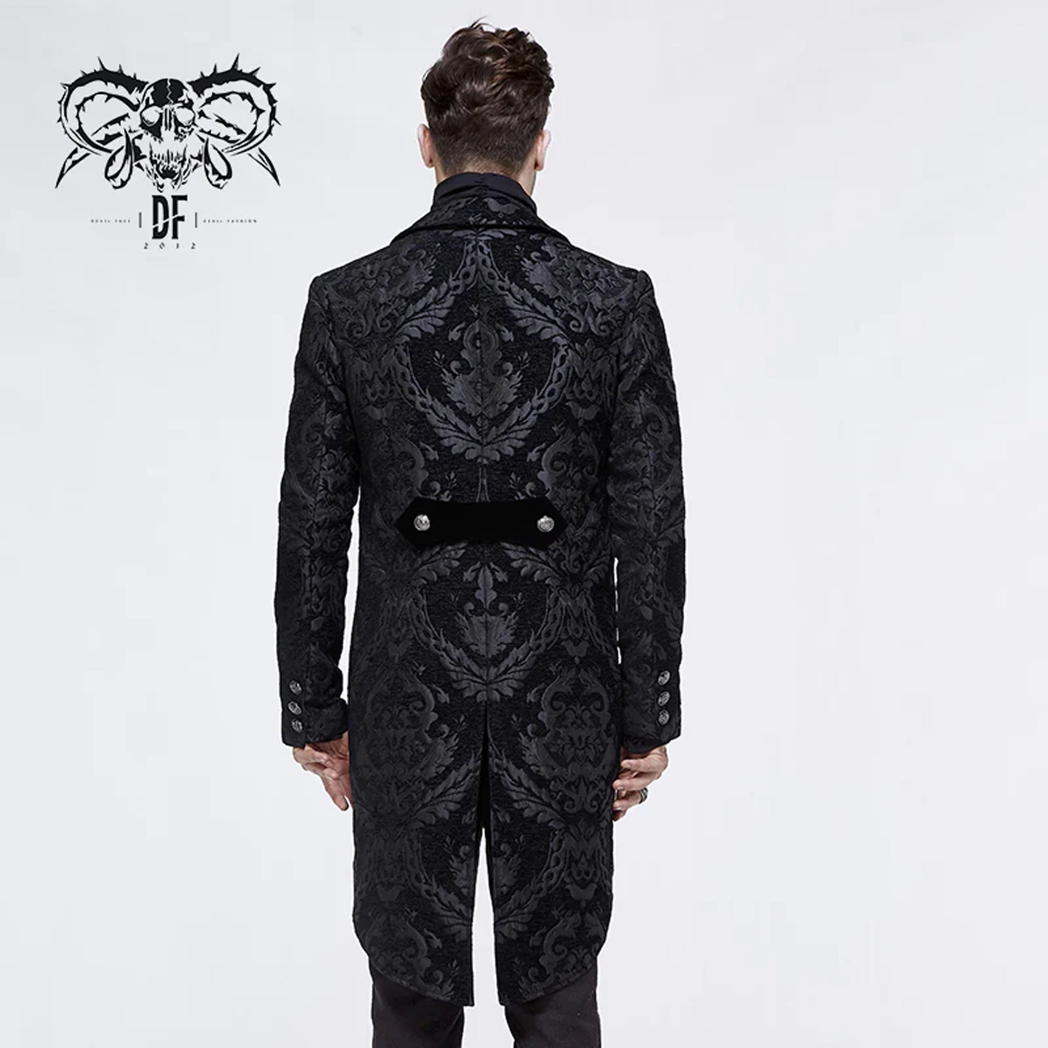 Victorian cut with a high low effect.  Jacket is Jaquard and fully lined.  Detailed silver butons and velvetine accents.  Front pocket is lined and funtional.