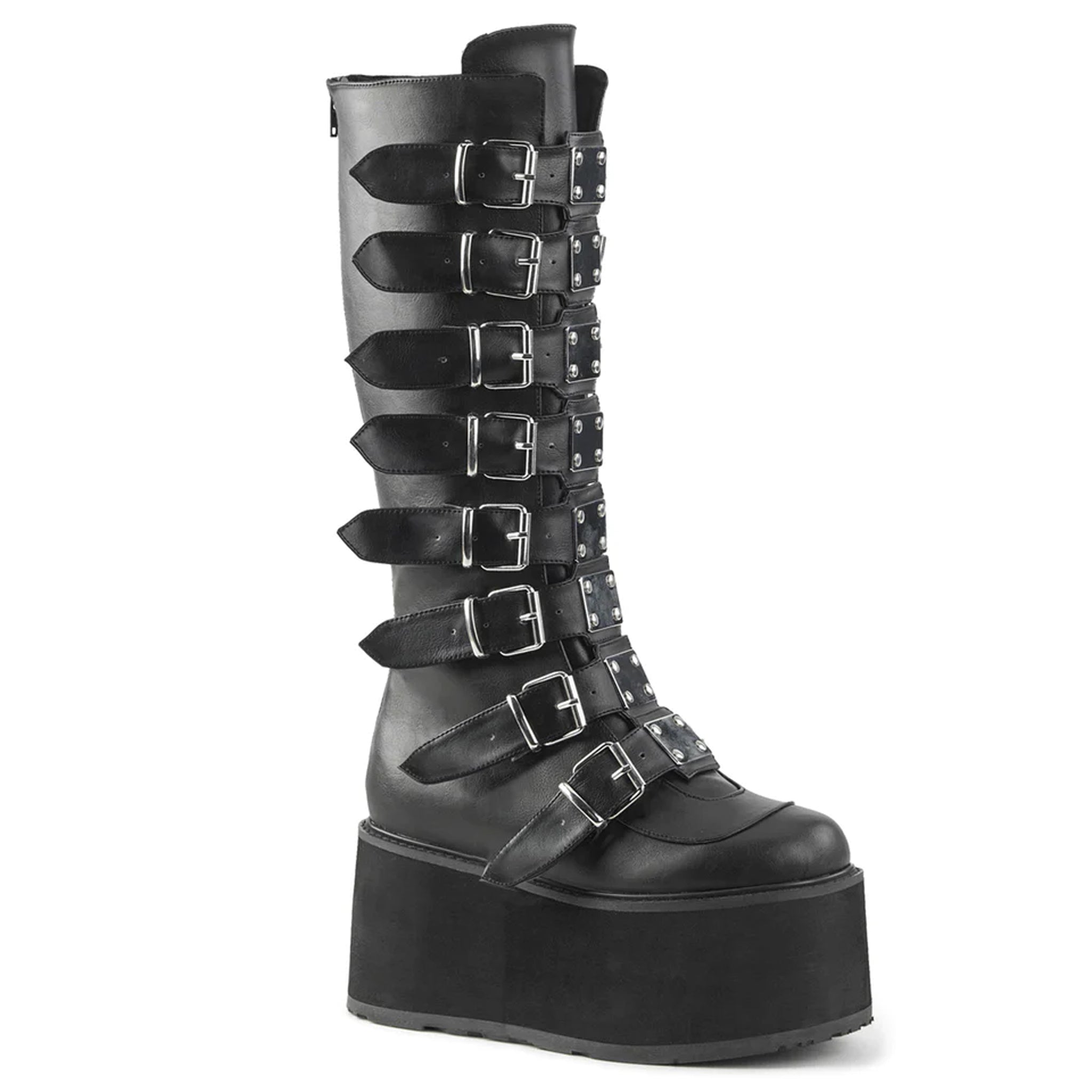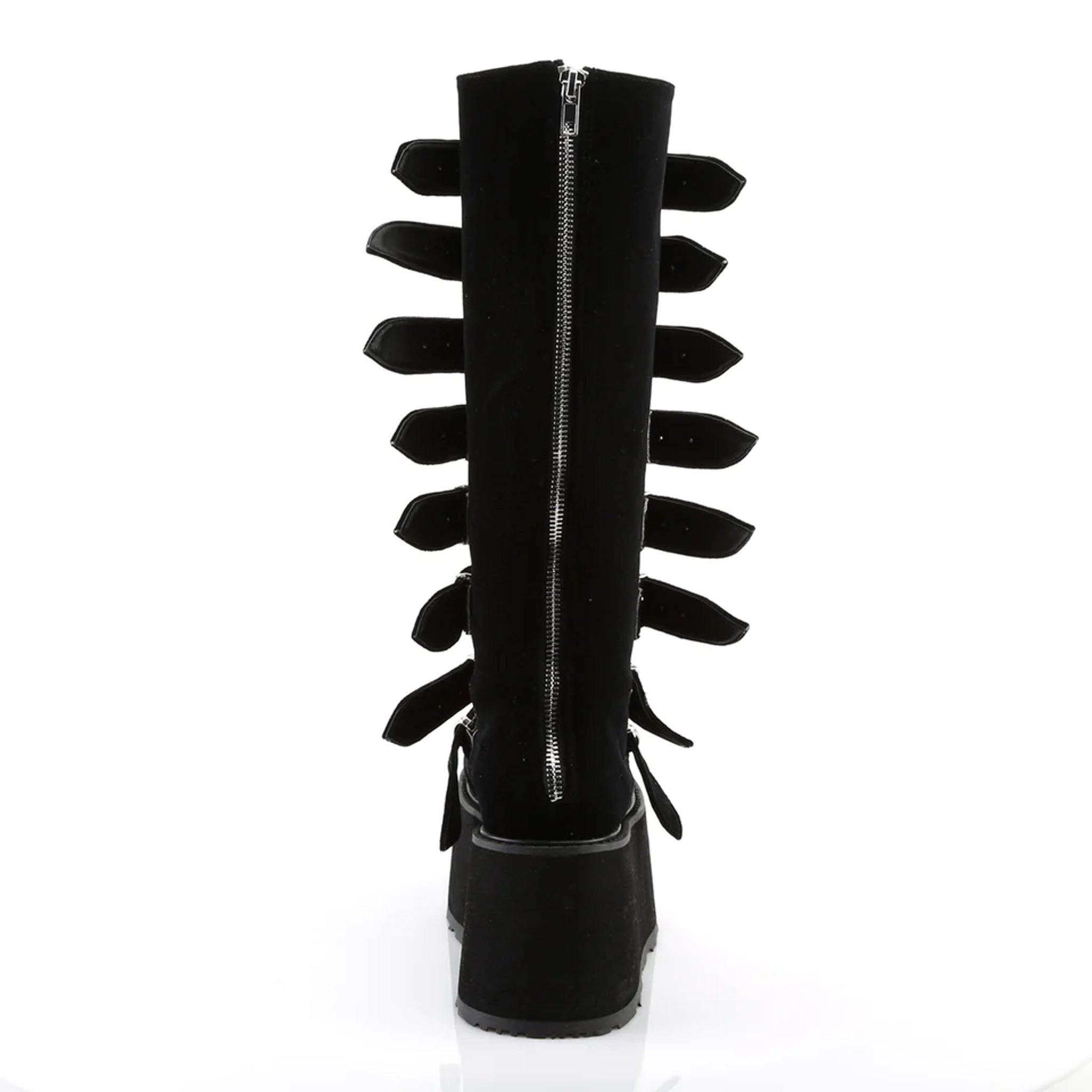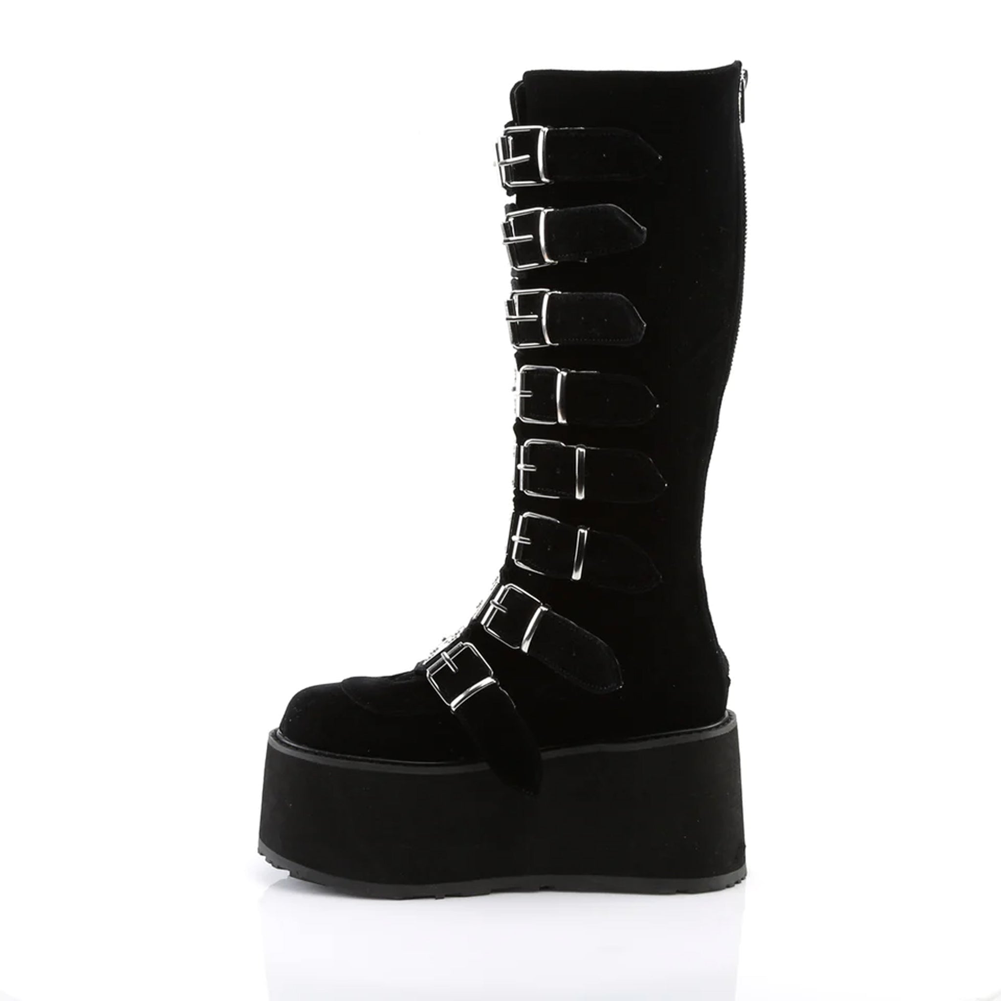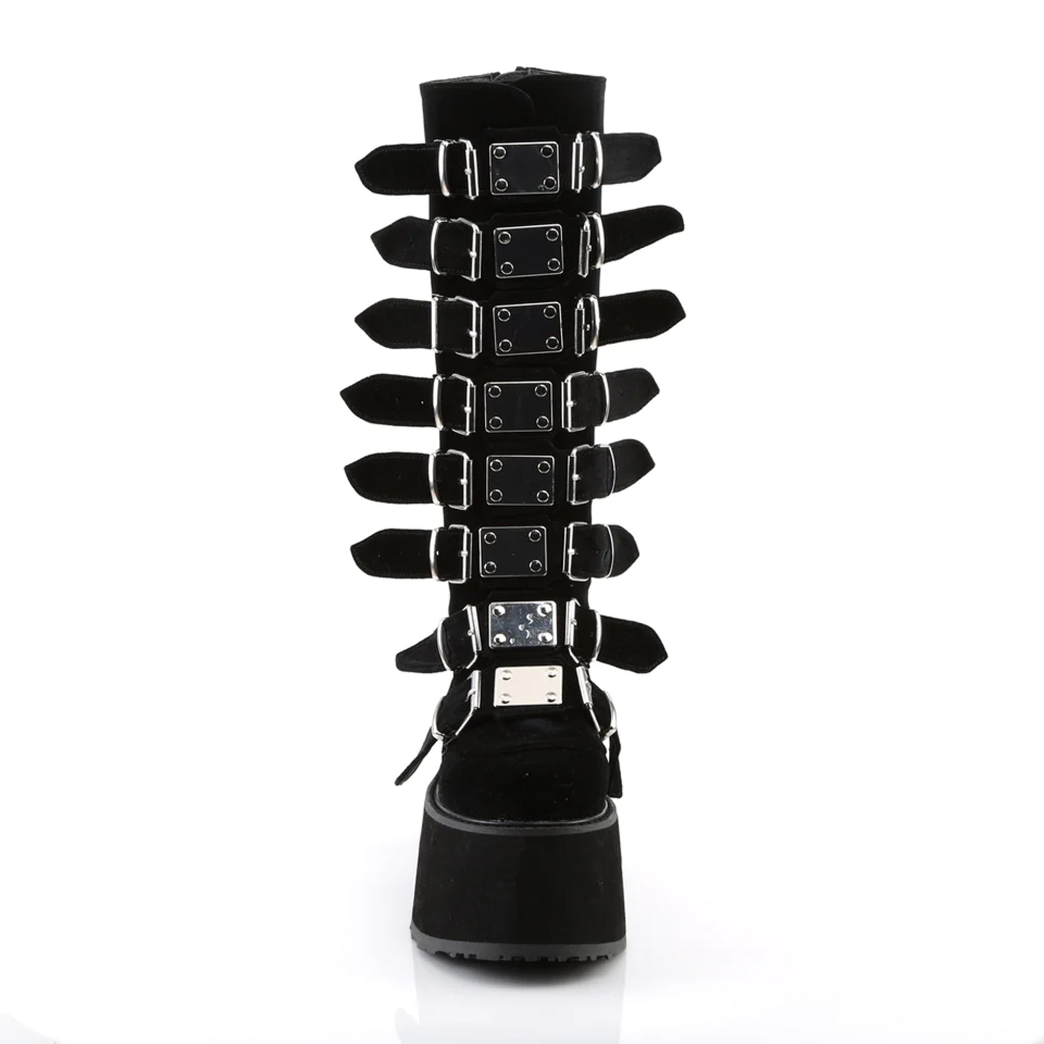 Meet the Damned-318, a knee high boot made for the fashion-conscious gothic and alternative enthusiasts. The black vegan leather or velvet construction boasts 8 chrome plated buckle hardware straps and a 3 1/2" platform that exudes a rebellious yet refined aesthetic. The full back zip closure ensures that you will be able to put it on and take it off without any struggles. Whether you're channeling your inner goth, punk or embracing alternative style, these boots will help you unleash your attitude and elevate your look with a fashionable edge.