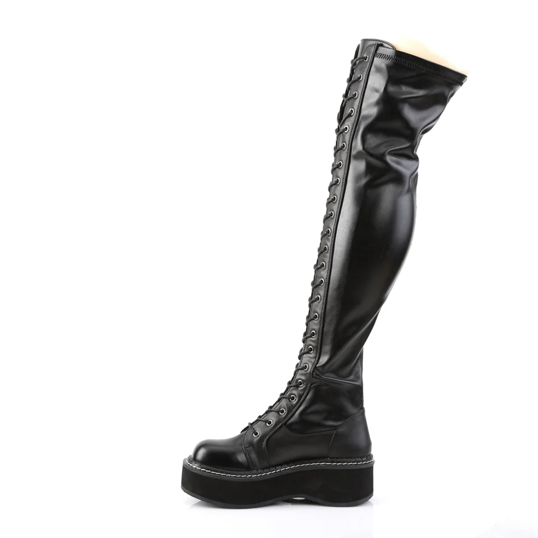 Make a bold statement with our Emily-375 thigh-high boots. Featuring a striking 2" platform, lace-up front, and outer metal zipper for ease and accessibility. These boots are made with black stretch vegan leather, ensuring a comfortable fit for any size. Perfect for the edgy fashion lover looking to stand out, our Emily-375 boots will make any outfit unforgettable.