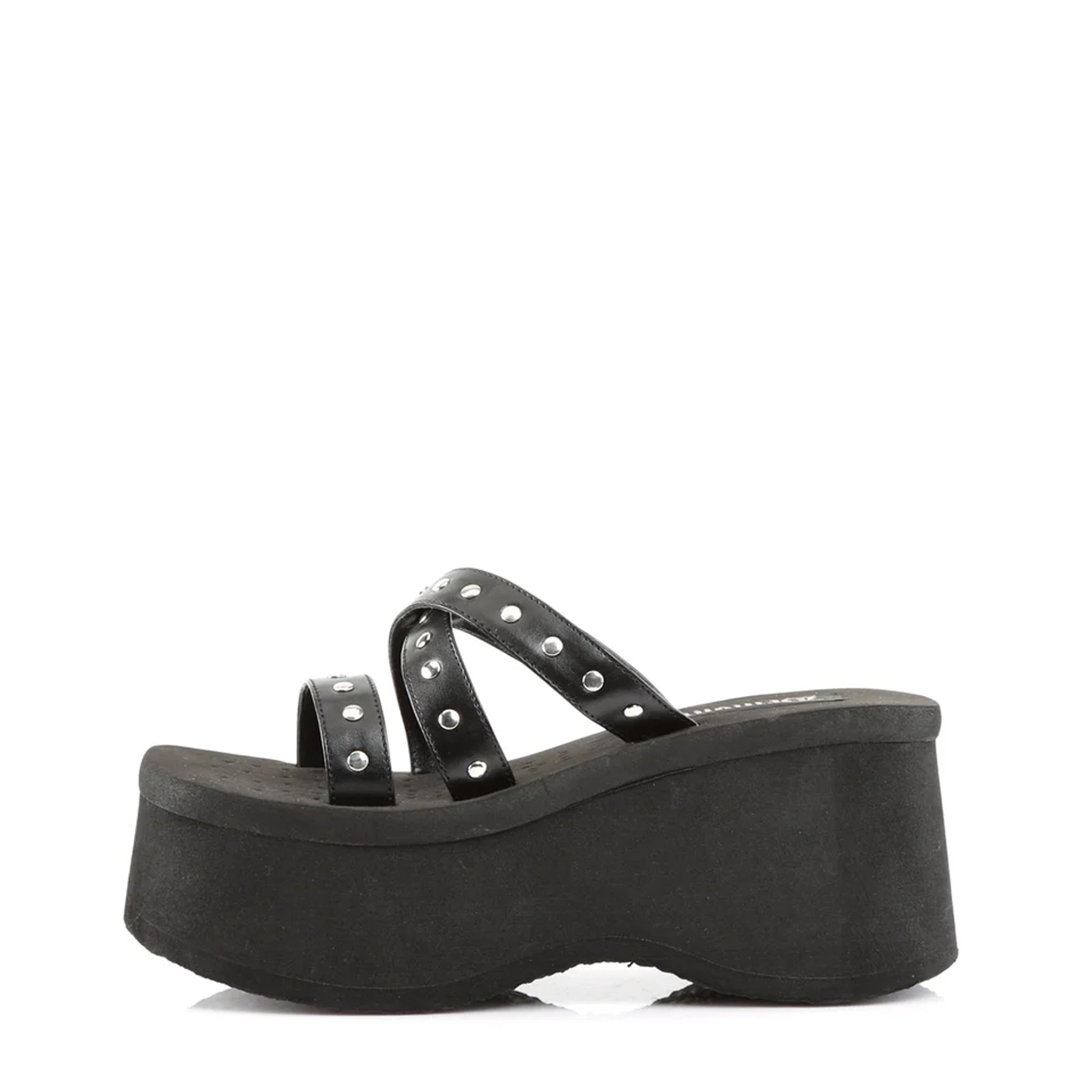 Step up your style game with our Funn-19 platform sandals. Designed to take your look to the next level, this gorgeous sandal features multiple studded straps across the vamp, giving it a bold and edgy look that's perfect for any alt wardrobe. The 3.5" platform will elevate your height and confidence, while thevegan leather adds a touch of luxury and durability. Whether you're dressing up for a rock concert, day out on the town, or just want to spice up your everyday style, the Funn-19 is a must-have.