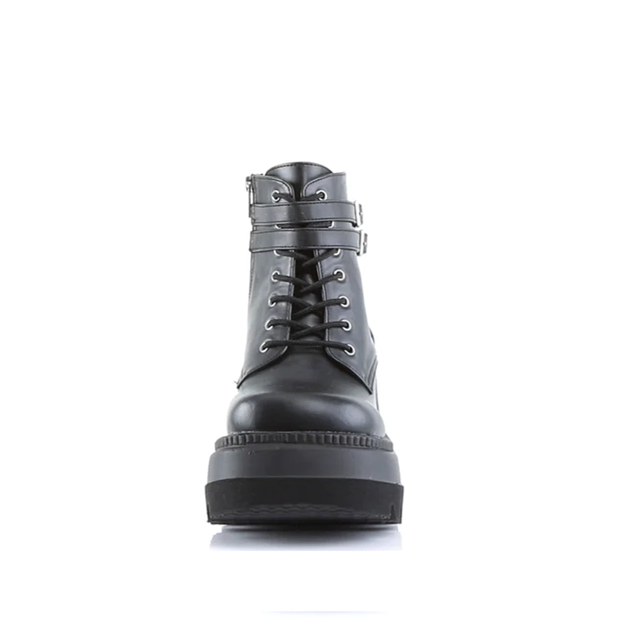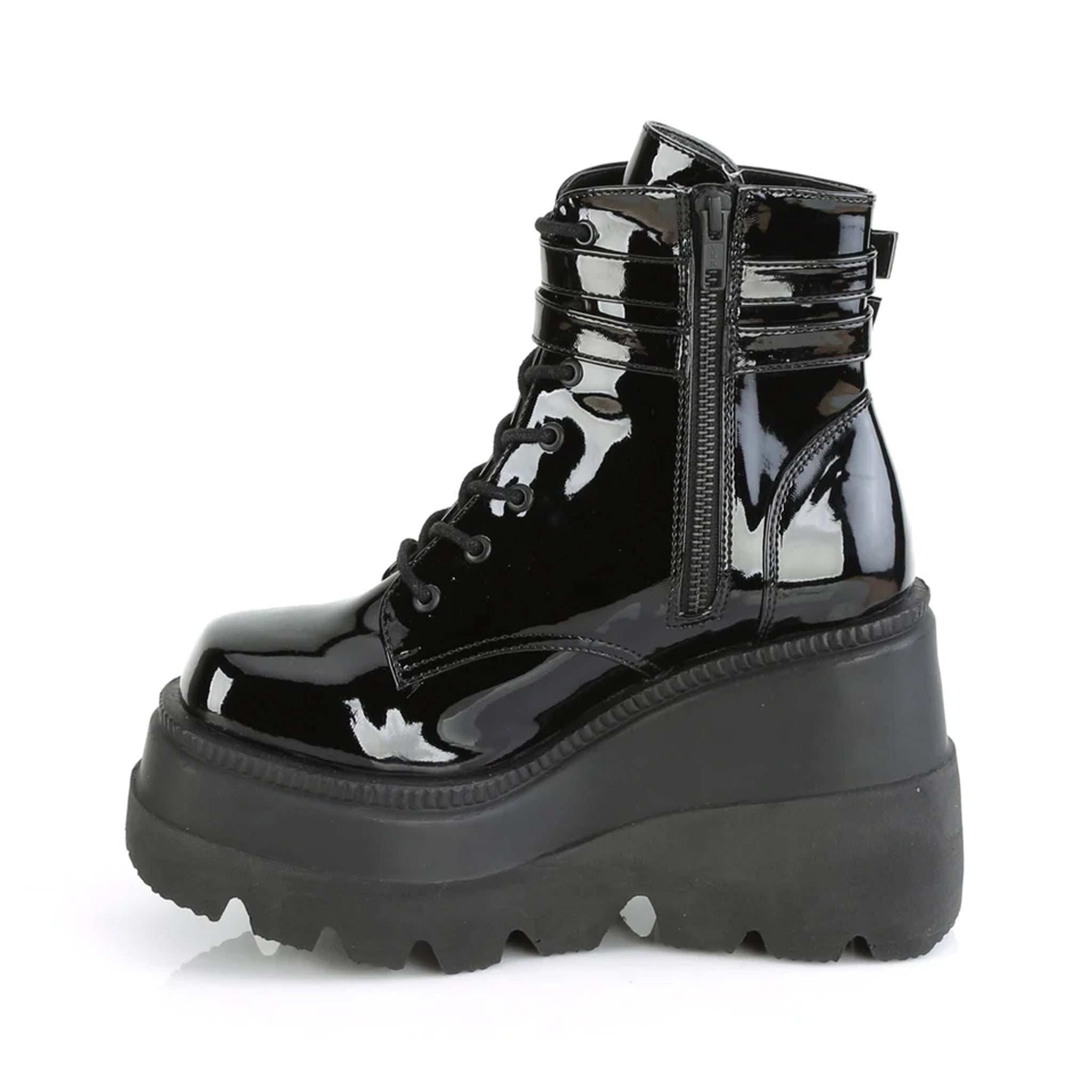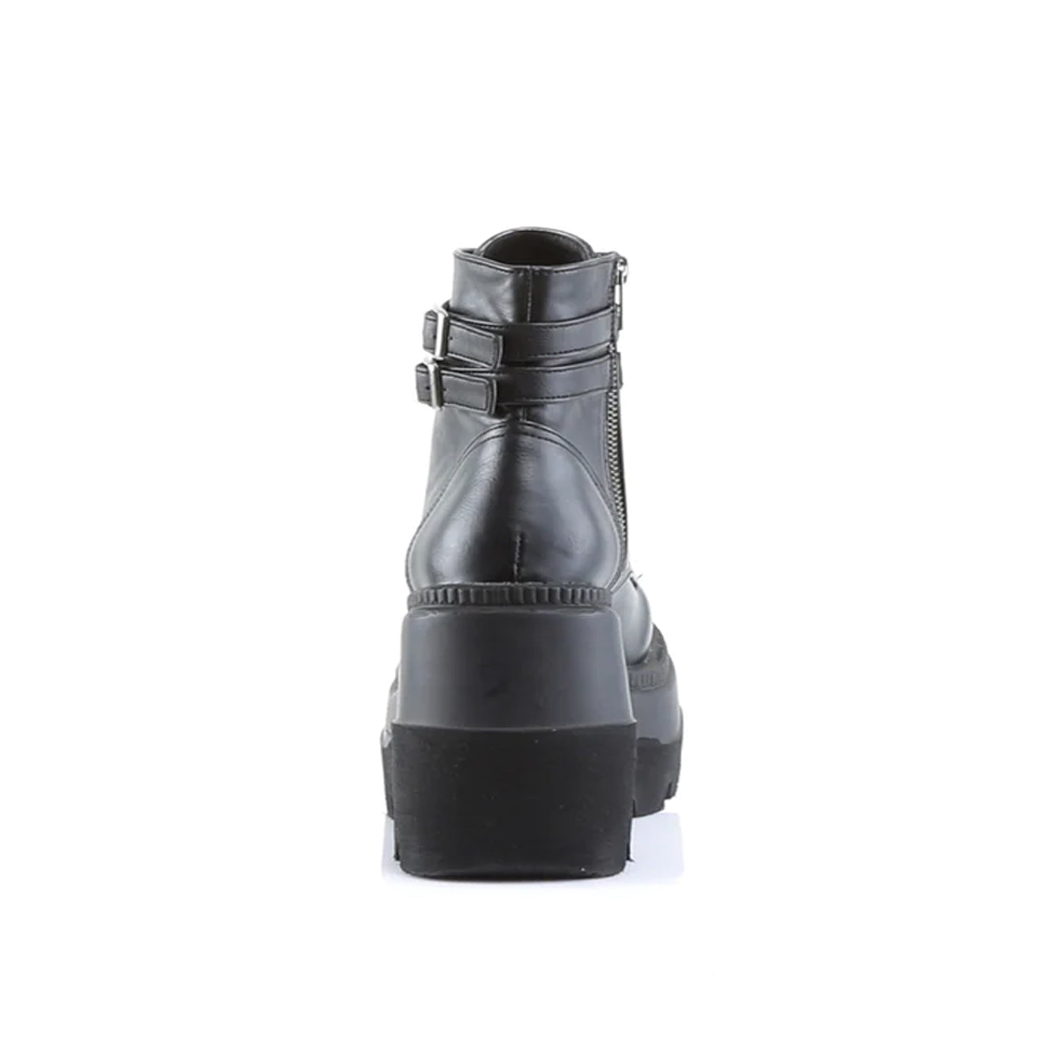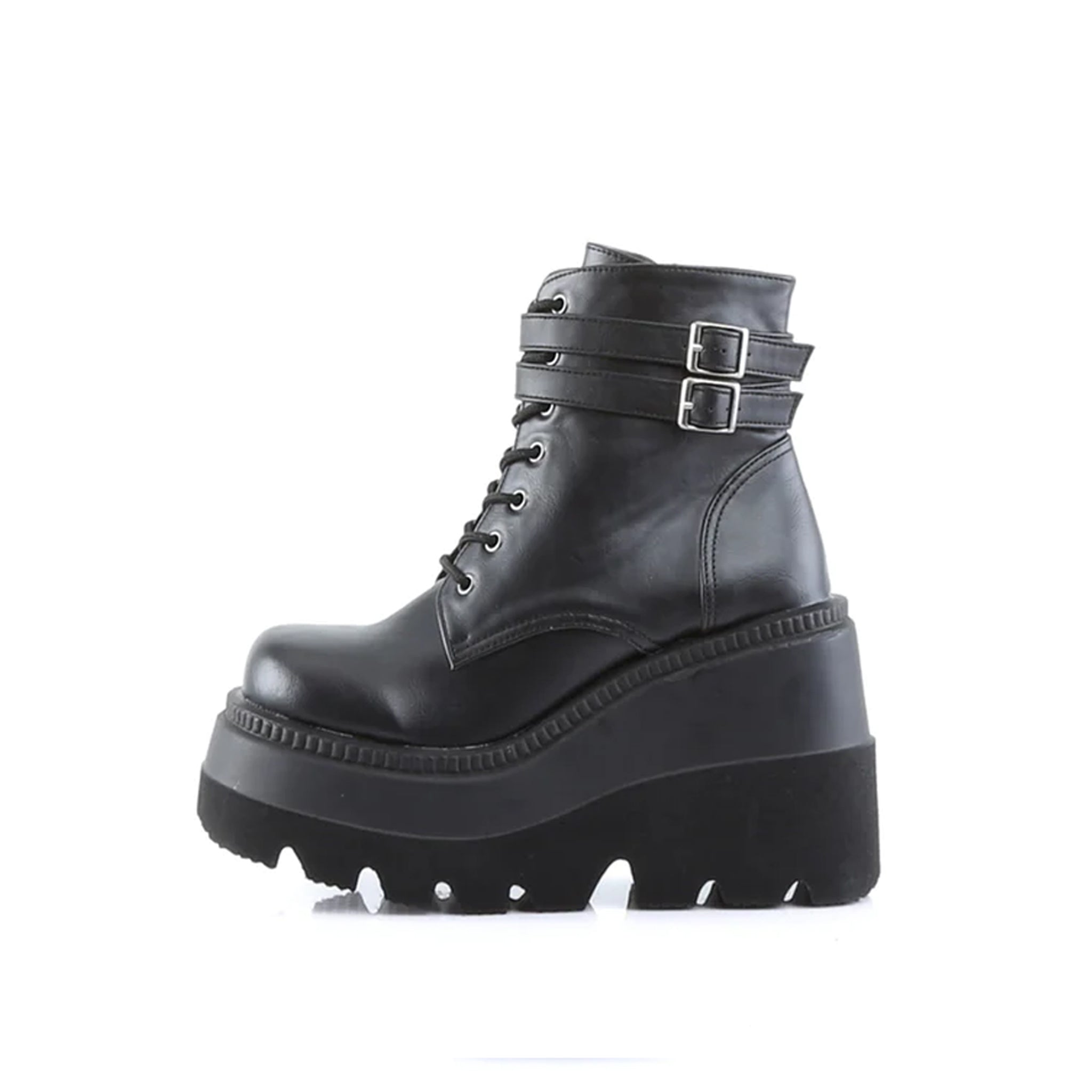 Shaker-52 is the quintessential Demonia ankle boot. Featuring a daring 4.5" stacked wedge platform that will elevate any outfit from ordinary to extraordinary. The striking black vegan leather adds an edgy touch to your look, while the lace-up front and double buckled ankle straps provide a secure and comfortable fit. The full inner side zip closure ensures ease of wear, while the iconic design will have heads turning with every step. Whether you're hitting the club or dressing up for a special occasion, the Shaker-52 is the perfect choice for anyone looking to make a bold statement with their footwear. Get ready to stomp and shine in these unforgettable and versatile boots.