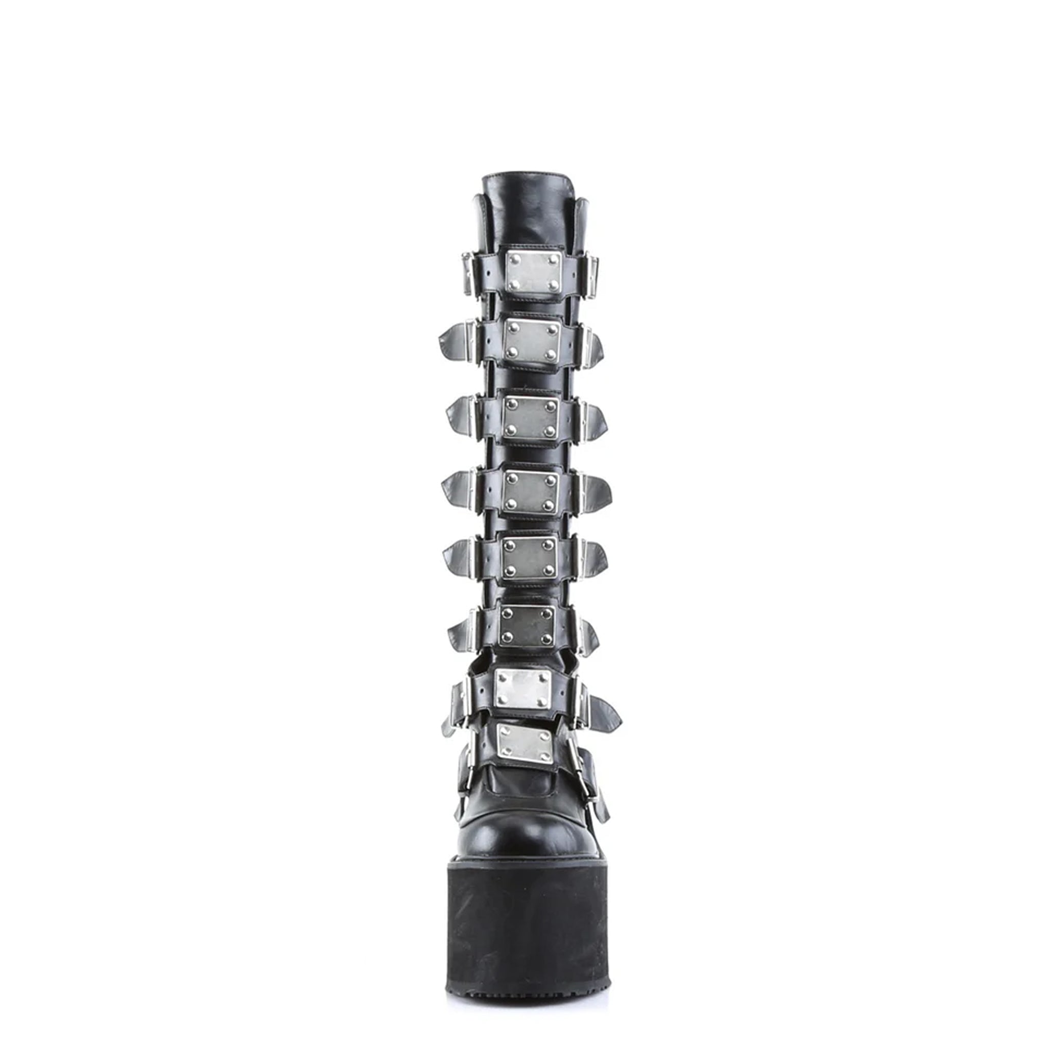 Unleash your inner punk muse with the Swing-815 knee-high boot, the ultimate in alternative footwear. Featuring a towering 5 1/2" wedge platform, these knee-high boots are perfect for anyone looking to make a bold statement with their shoes. The 8 metal plate buckles add a hint of industrial charm and contrast against the classic black vegan leather. The full back zip closure ensures easy and secure wear without compromising on style. Step out with confidence and take on the world with these strikingly cool boots. Whether you're headed to a concert, night out with friends or simply want to add a unique touch to your style, the Swing-815 has got you covered.