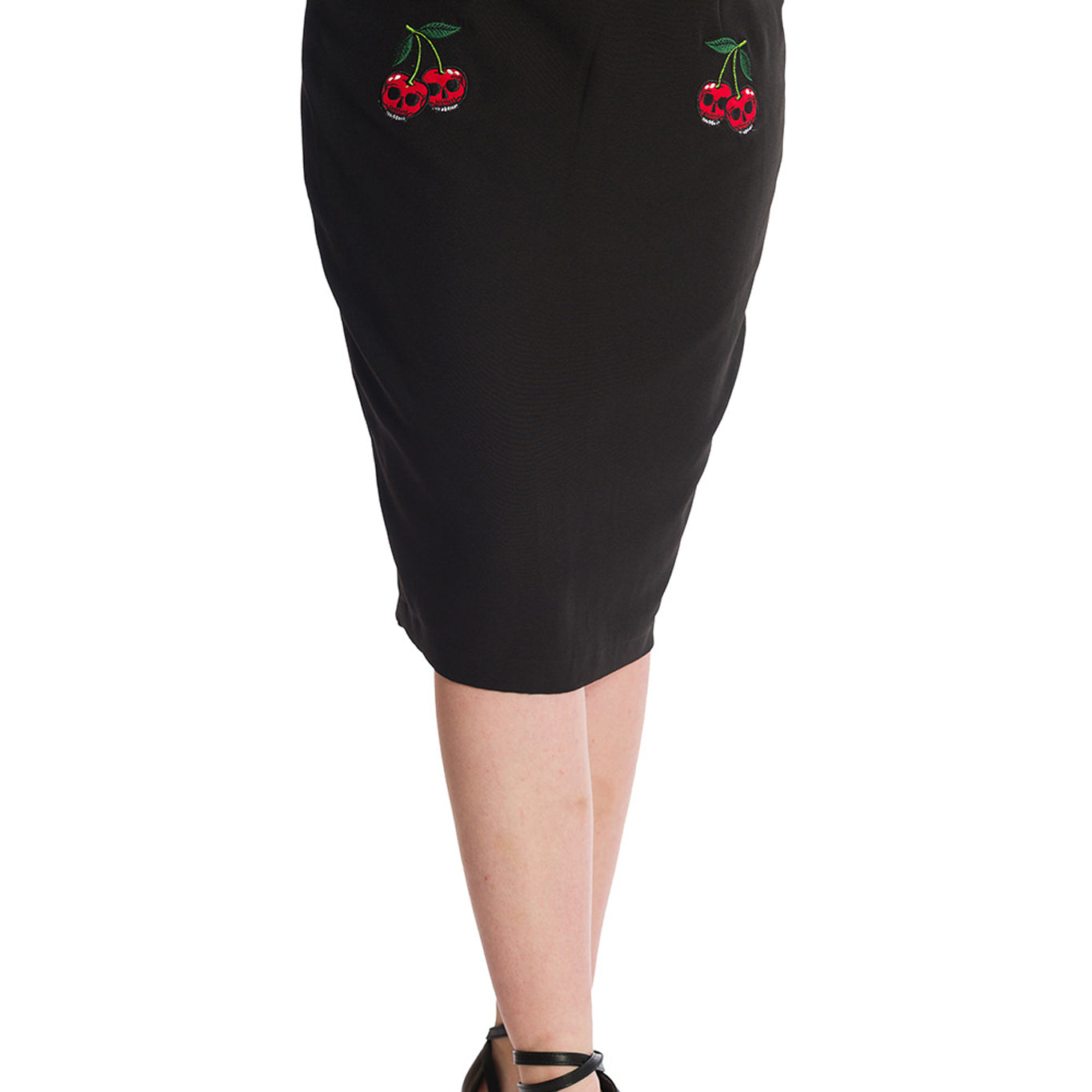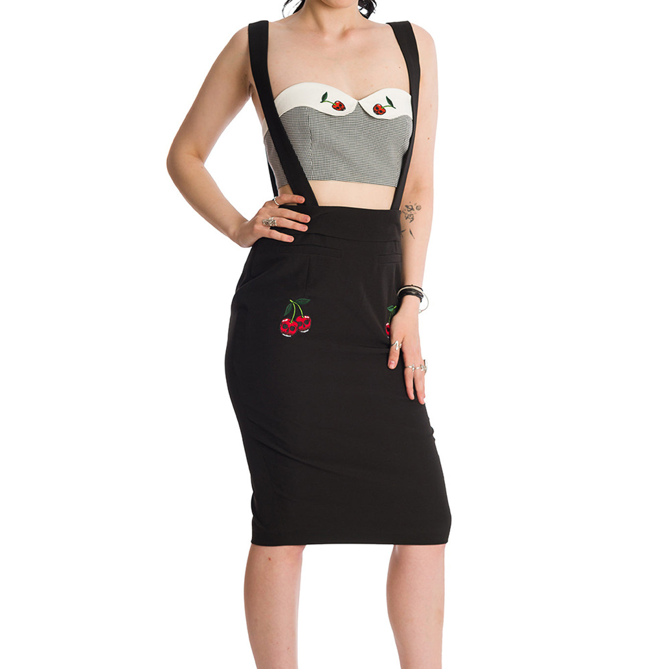 This stylish pencil skirt features detachable suspenders and showcases a distinctive cherry skull embroidery on the front. Crafted for an edgy vintage-inspired look, it combines 95% polyester with 5% elastane for a structured yet comfortable fit.