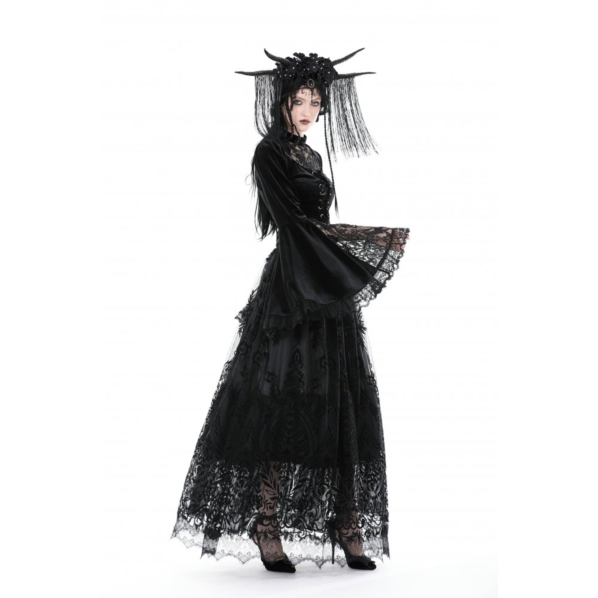 This top features a blend of lace and subtly stretchy velvet, highlighted by bell sleeves with lace edging and a corset-inspired front design.