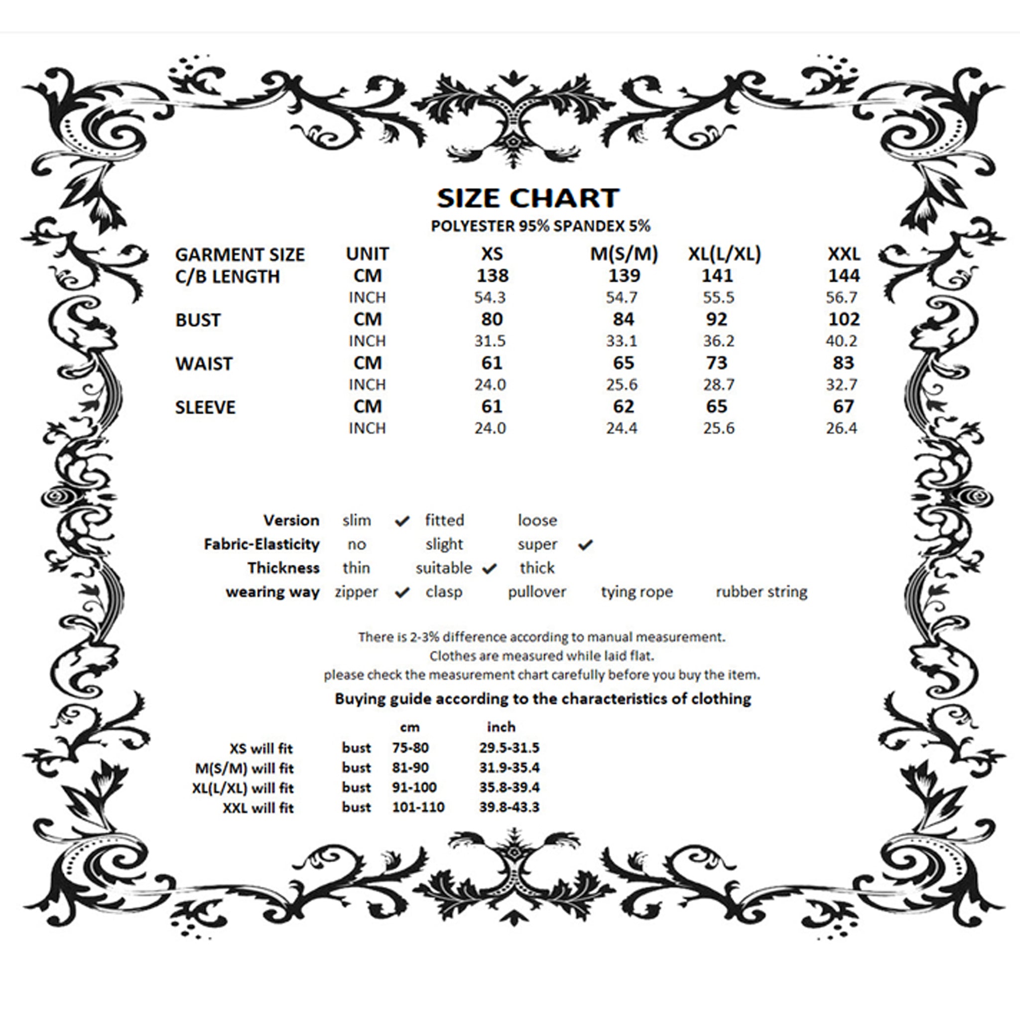See size chart for more garment information