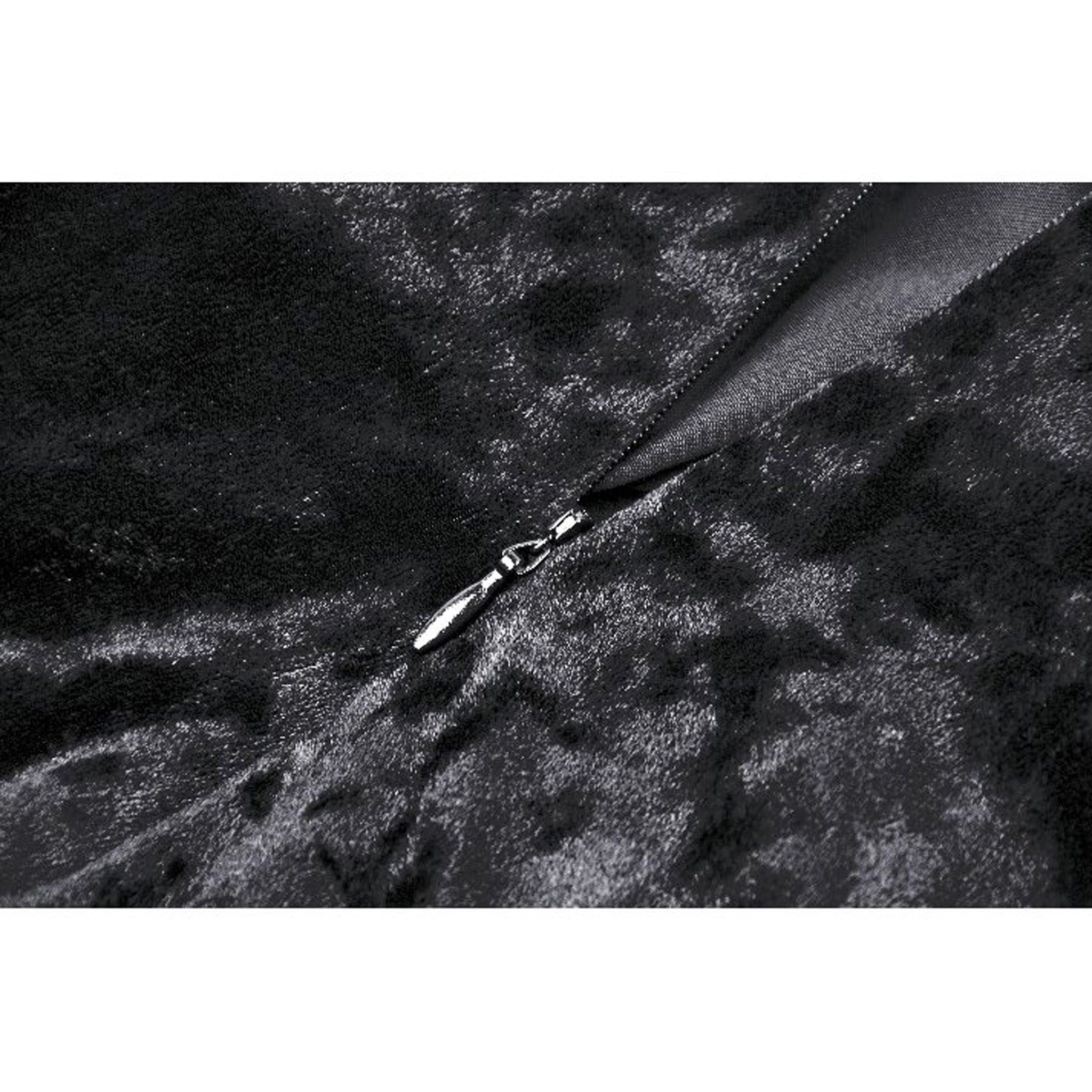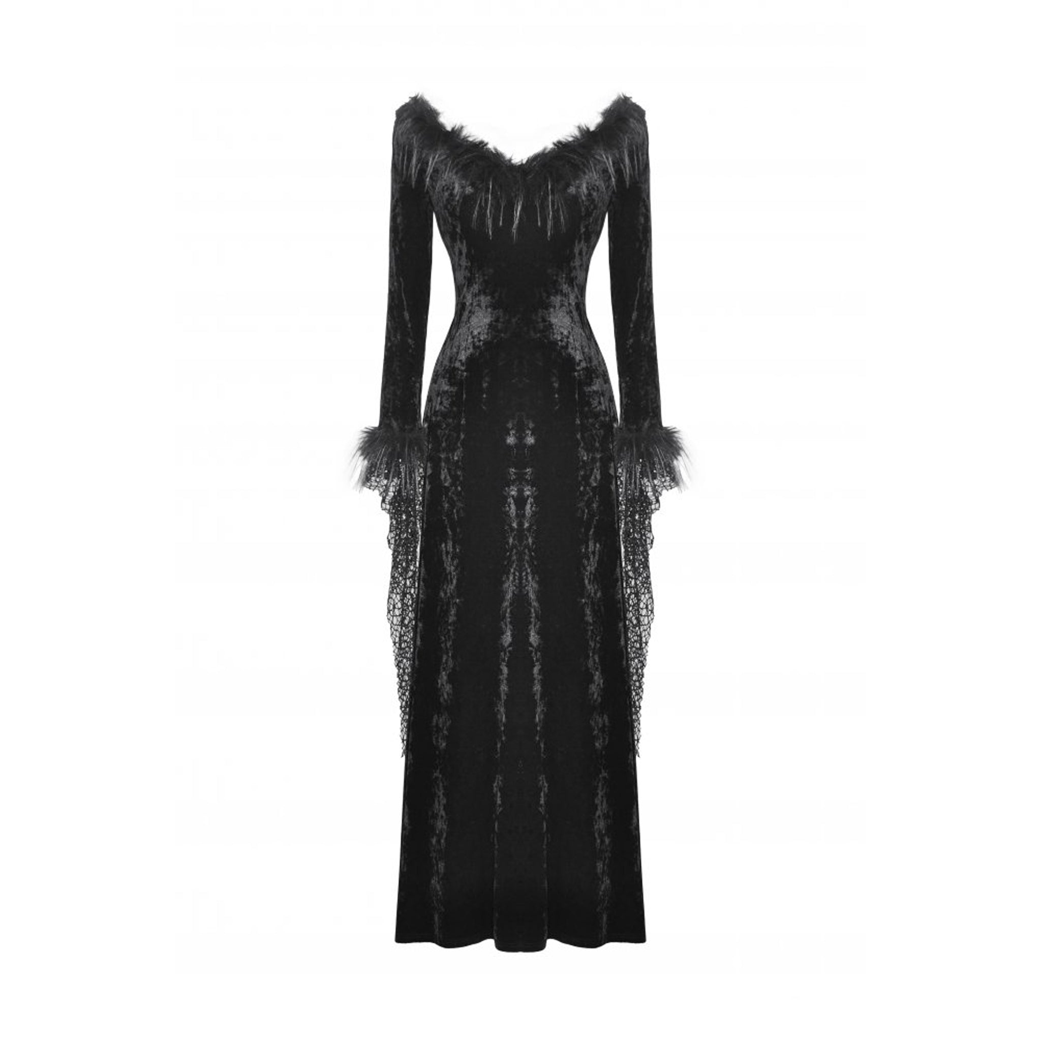 Elevate your wardrobe with this luxurious stretch velvet dress that combines elegance with edgy details. The plush faux fur trim frames the V neckline and cuffs beautifully, while delicate fishnet-textured accents add visual interest. A lace-up corset-style back allows you to customize the fit to flatter your silhouette perfectly. Style it with your favorite belt, corset, or waist accessory to create a look that's uniquely yours.