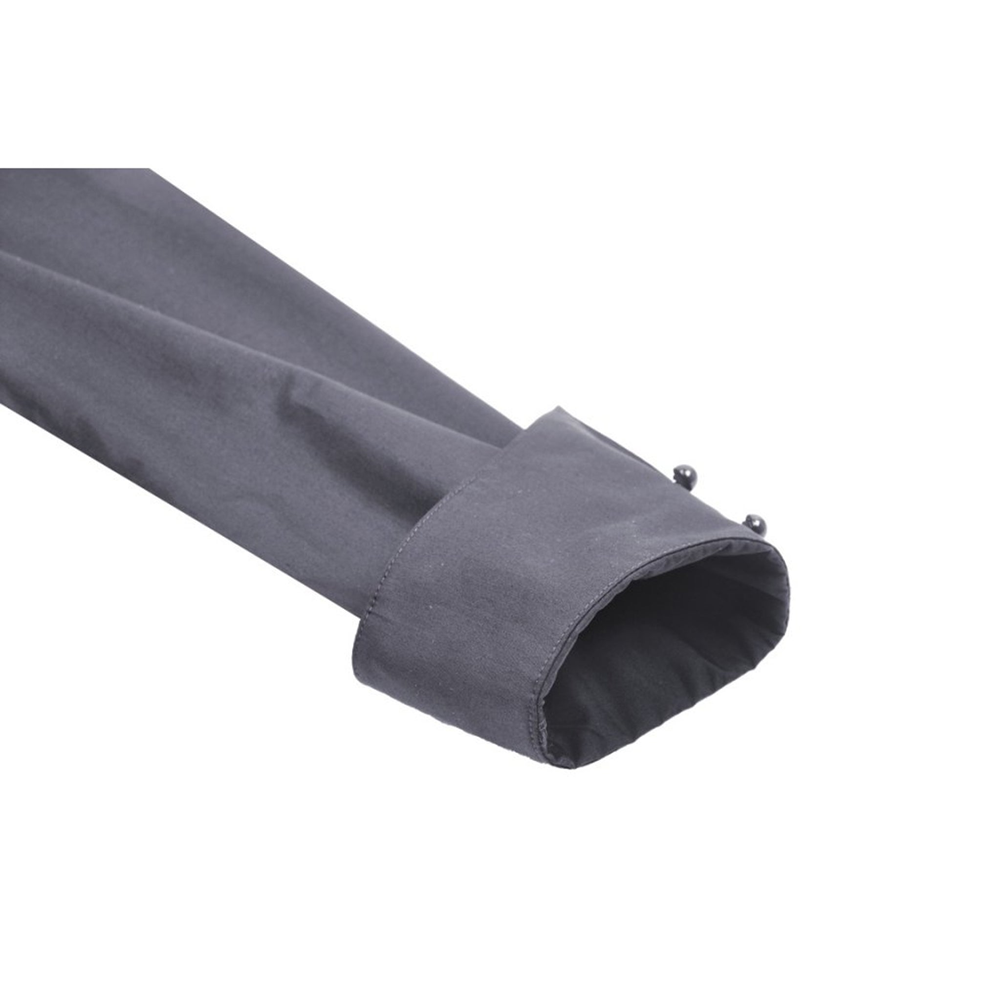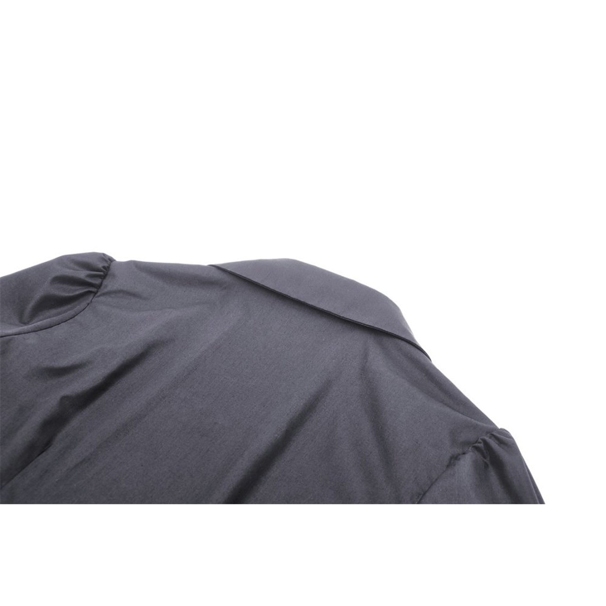 This blouse offers a gothic twist on the traditional button-down design. It features a collar with a dropped, pointed hem and delicate ruffles cascading along the front. The cuffs also end in a sharp, pointed detail for a refined finish.