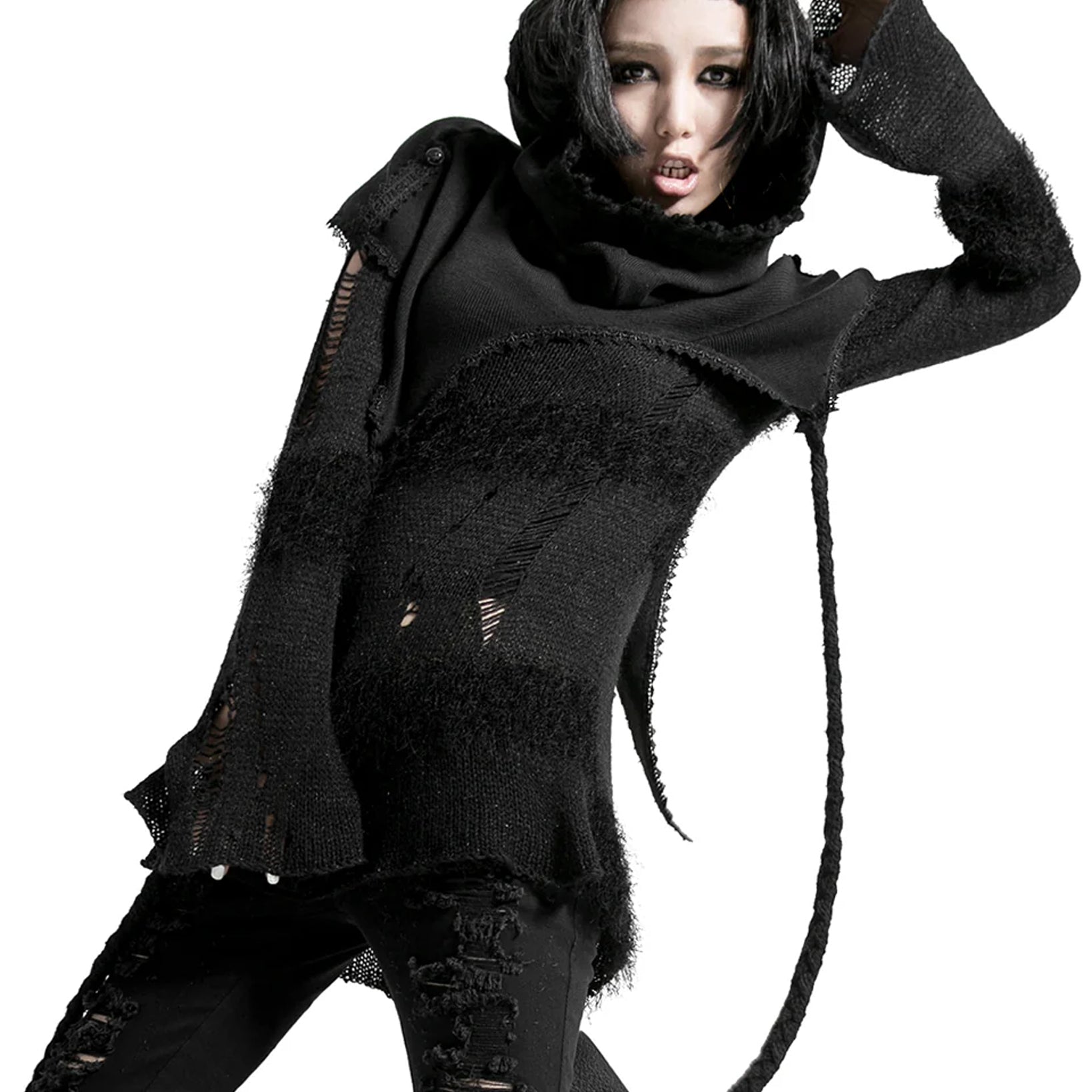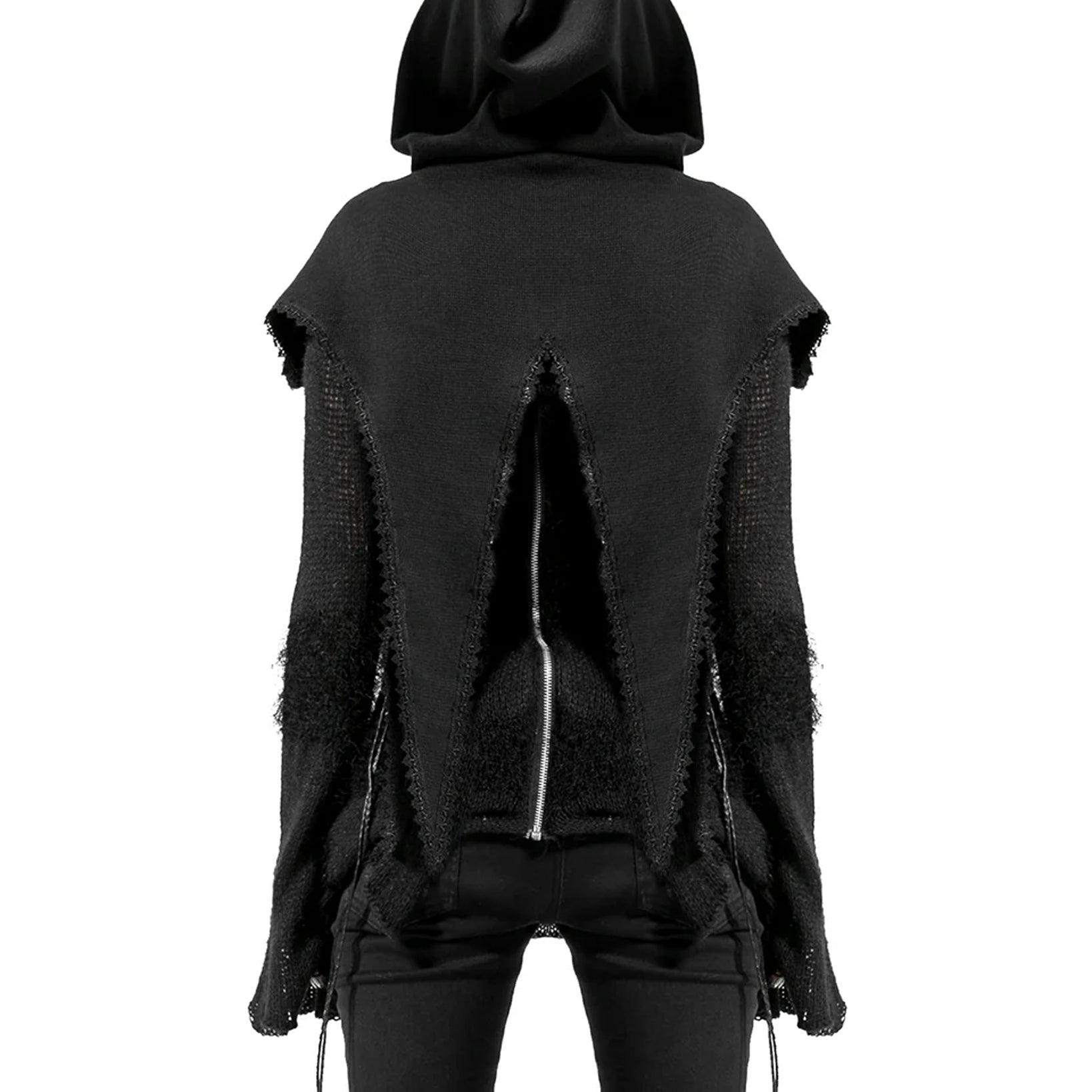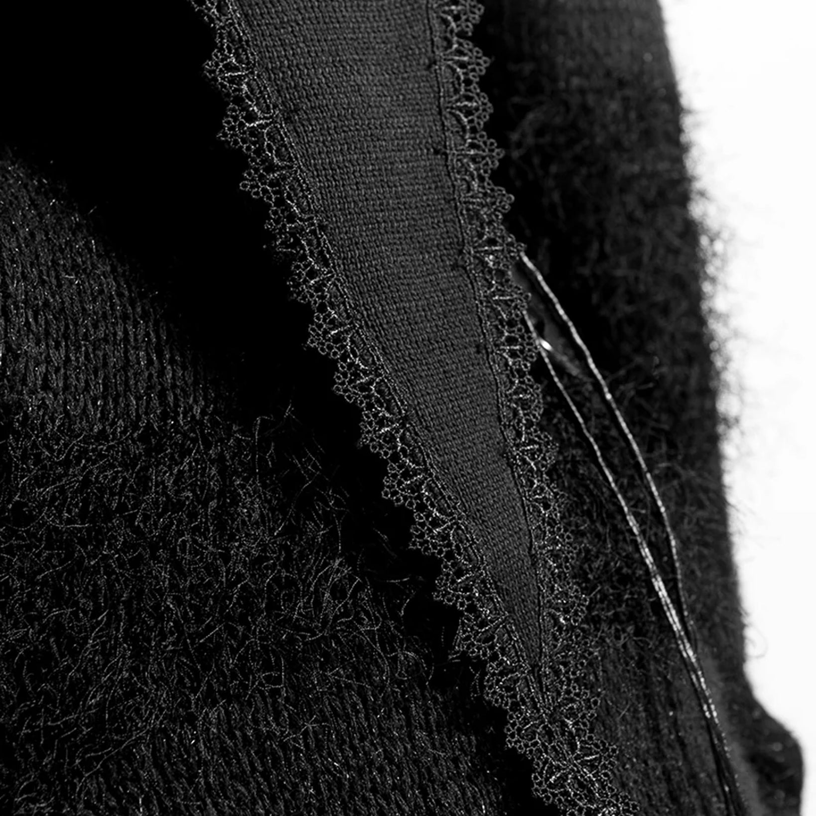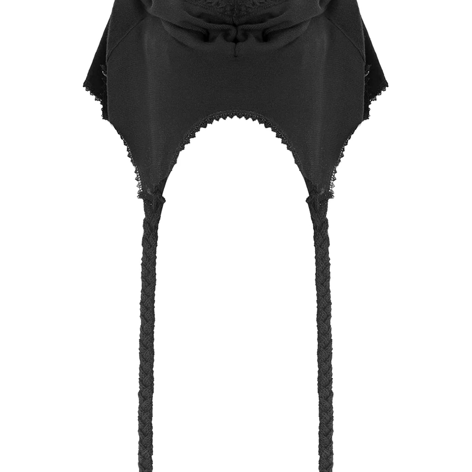 The Gothic Poncho Capelet is a knitted black wool garment that reinterprets the traditional poncho with a striking pointed hem and braided tassel accents. Designed as a pullover, it is easily worn by slipping it over the head, combining classic comfort with a distinctive gothic edge.