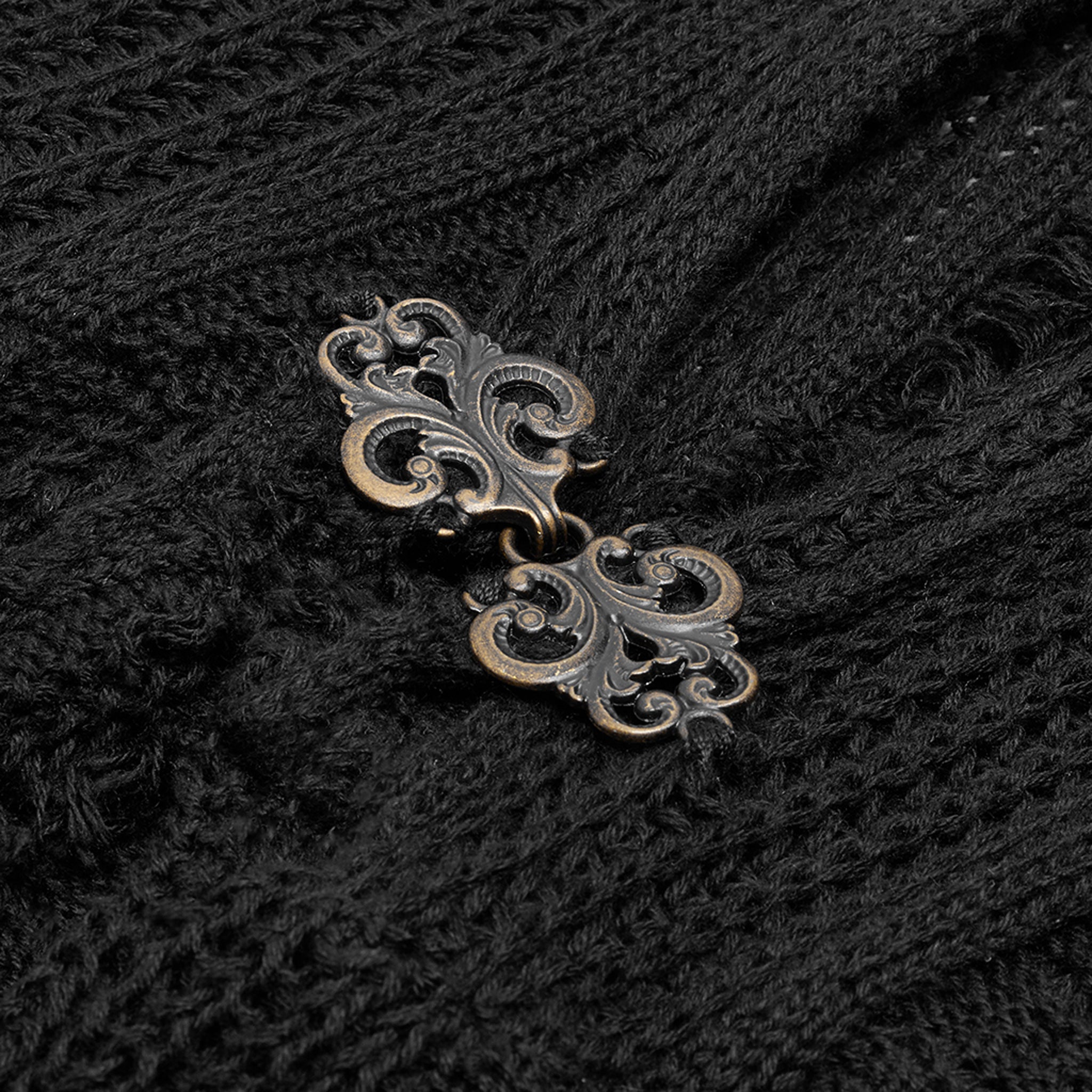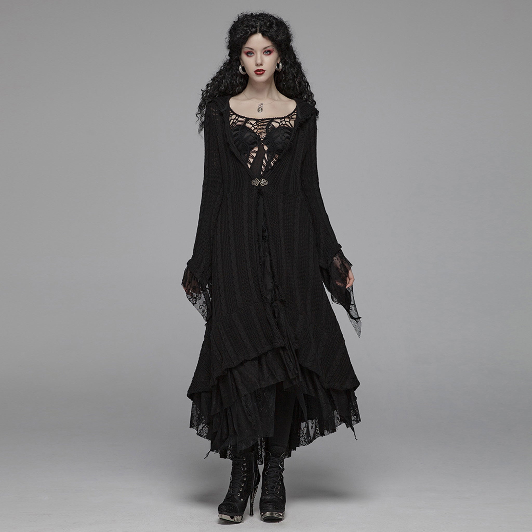 This cardigan features a large hood and a front clasp hook closure for secure wear. It is accented with substantial lace trim on the cuffs and hem, adding a refined gothic touch. Equipped with two side pockets, it offers practicality alongside style. While not overly heavy, it provides sufficient warmth for cooler days.