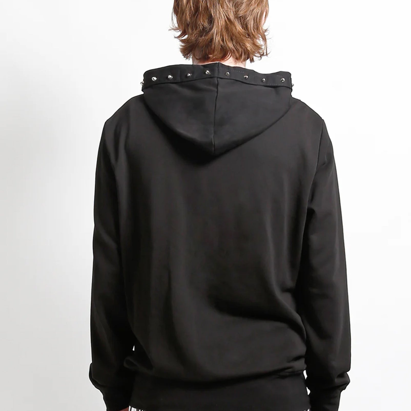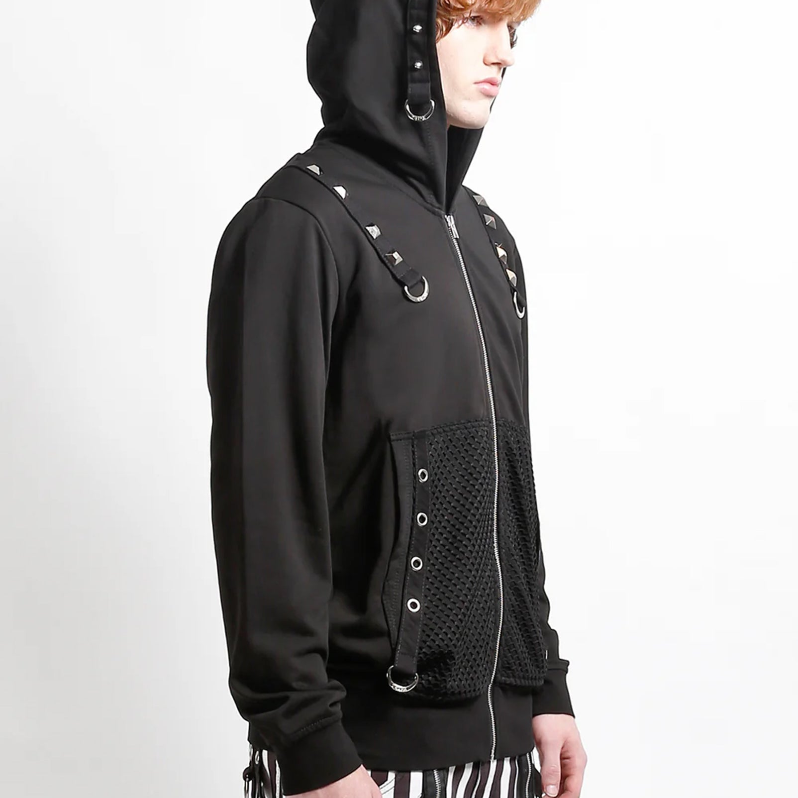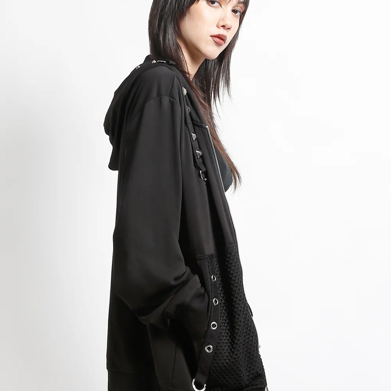 This oversized hoody features a zipper closure with studs, d-rings, and rivets. Two oversized front pockets featuring black mesh. French Terry knitted sweat shirt hoodie