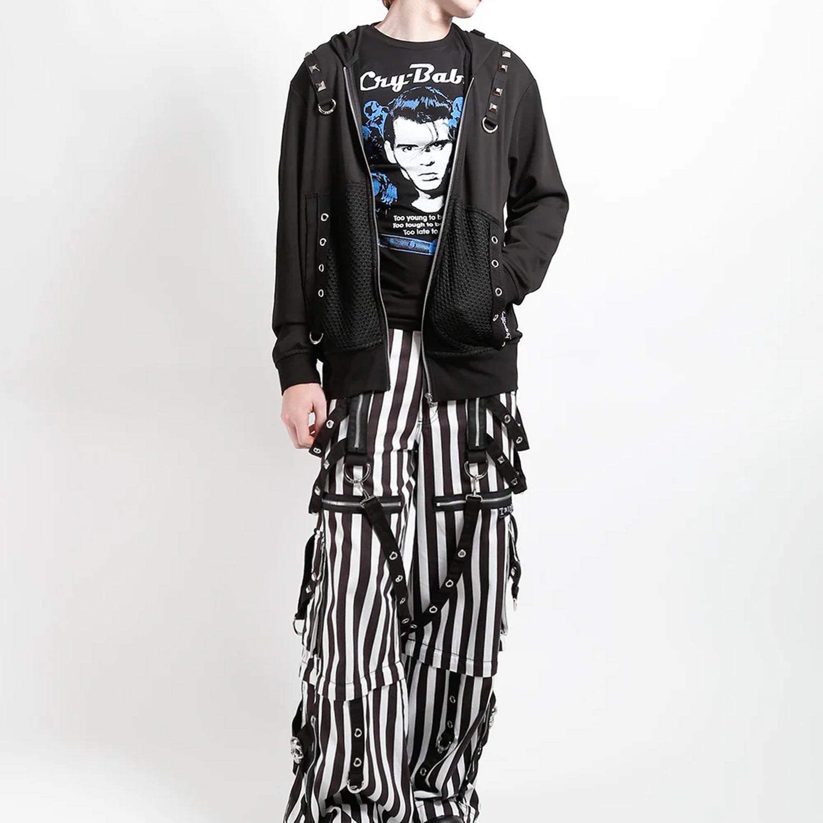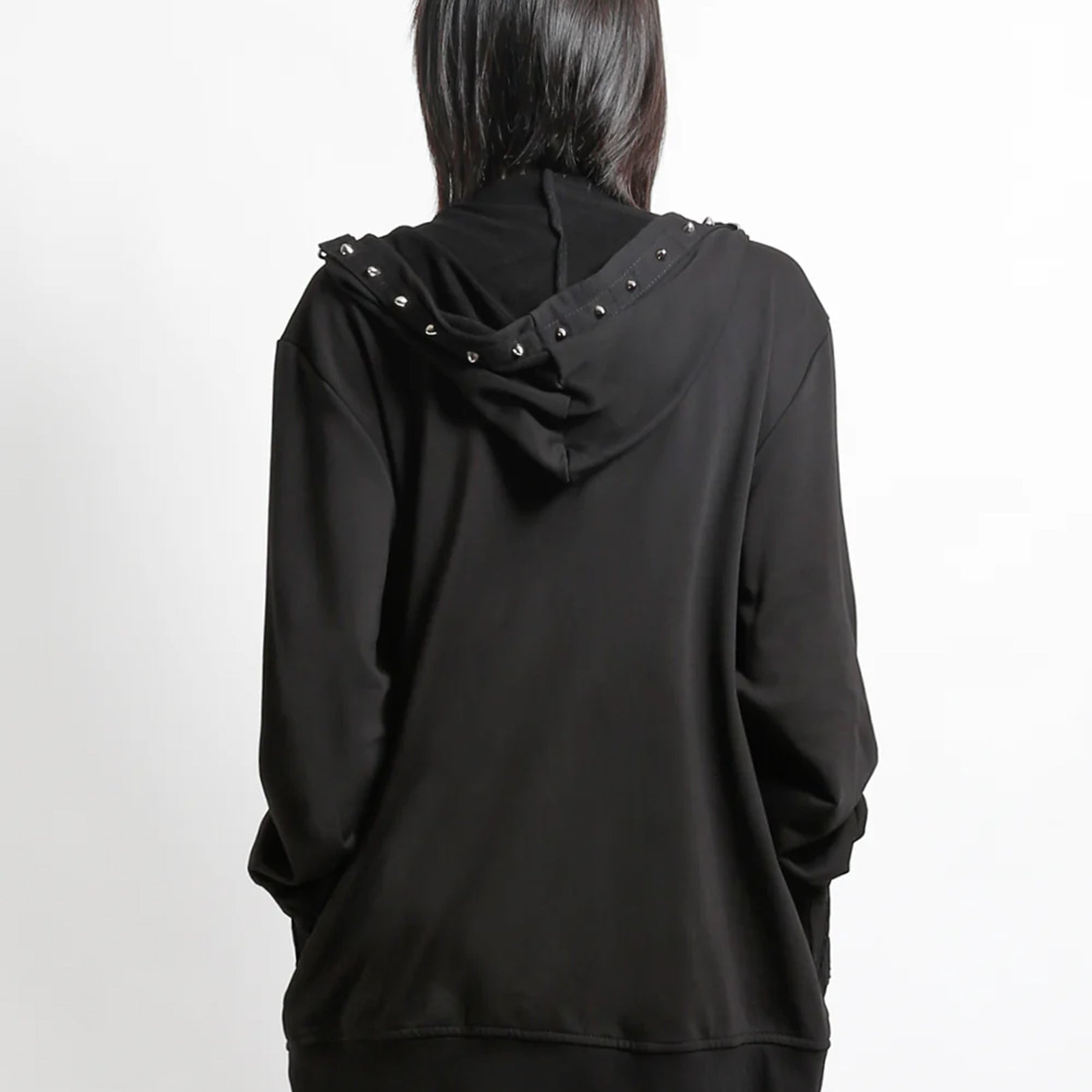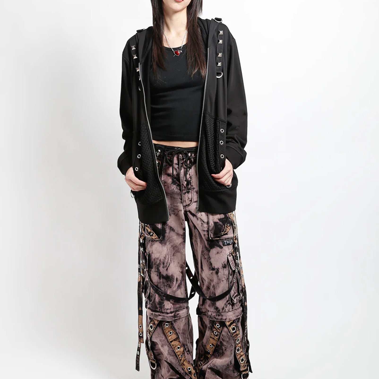 This oversized hoody features a zipper closure with studs, d-rings, and rivets. Two oversized front pockets featuring black mesh. French Terry knitted sweat shirt hoodie