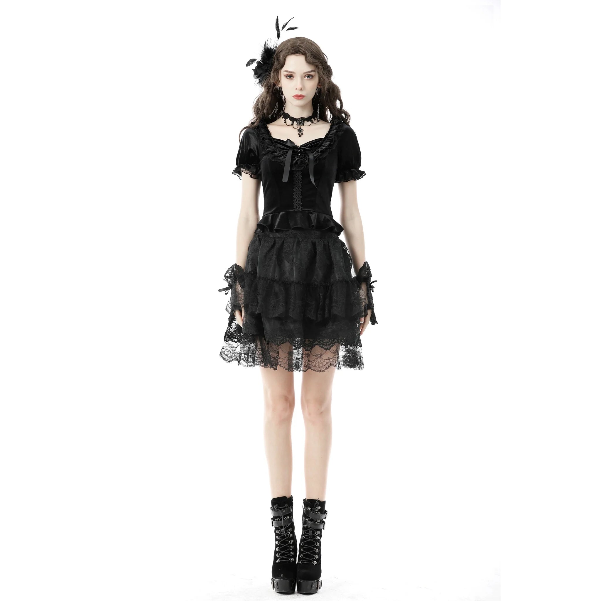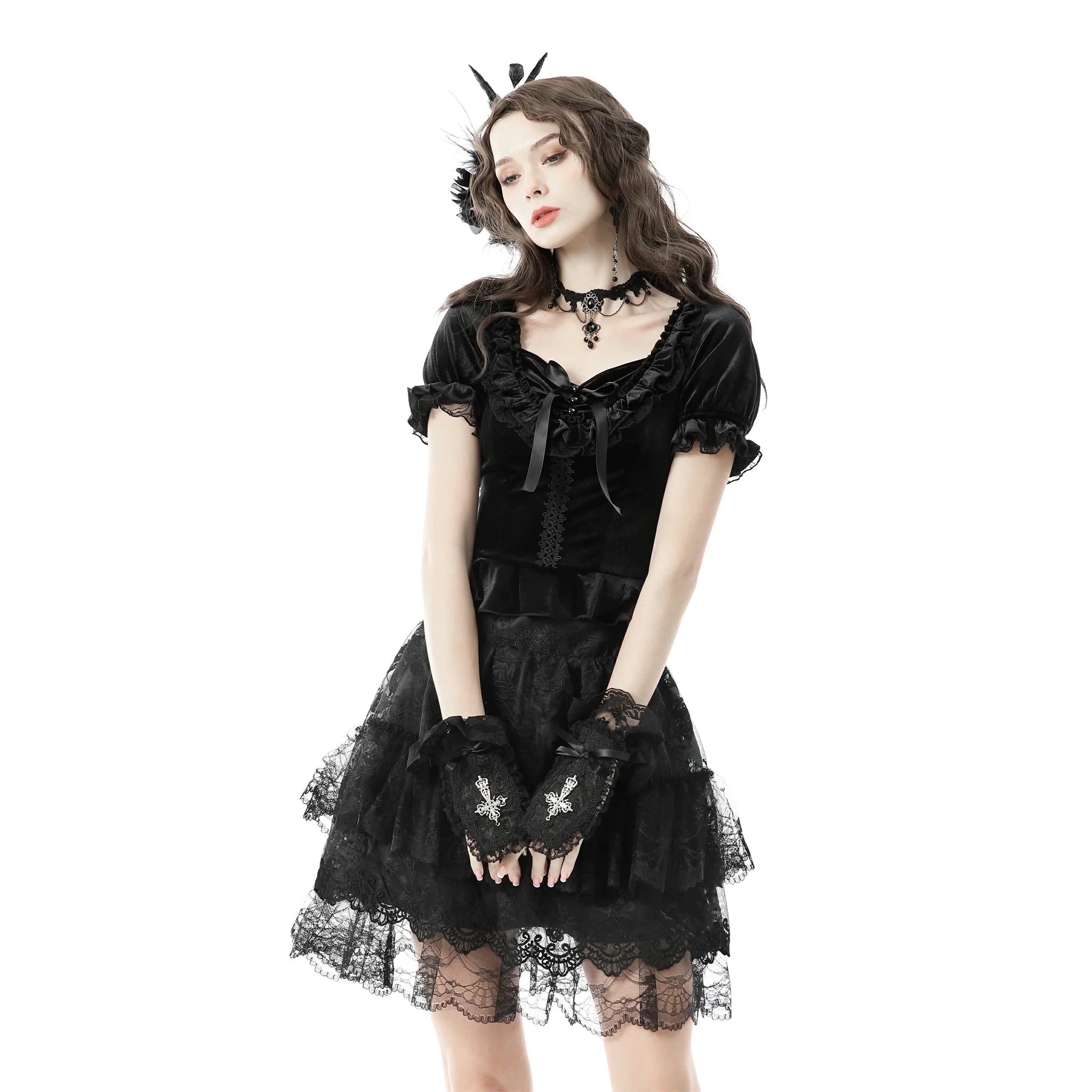 This charming velvet top showcases braided trim along the front and corset-style lacing at the back, allowing for an adjustable and tailored fit.