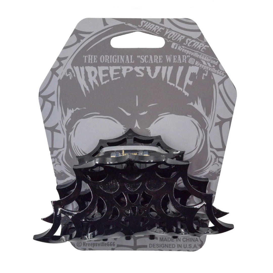 Kreepsville Spiderweb Hair Claw Clip Black. Put some scare in your hair with our eye-catching, super sturdy spring claw clips. Perfect for up do's and lazy hair days! Made with black shiny OR holographic acrylic. Designed by ghouls in the USA! Clip size: 4.5" (11.43cm) x 2" (5cm).
