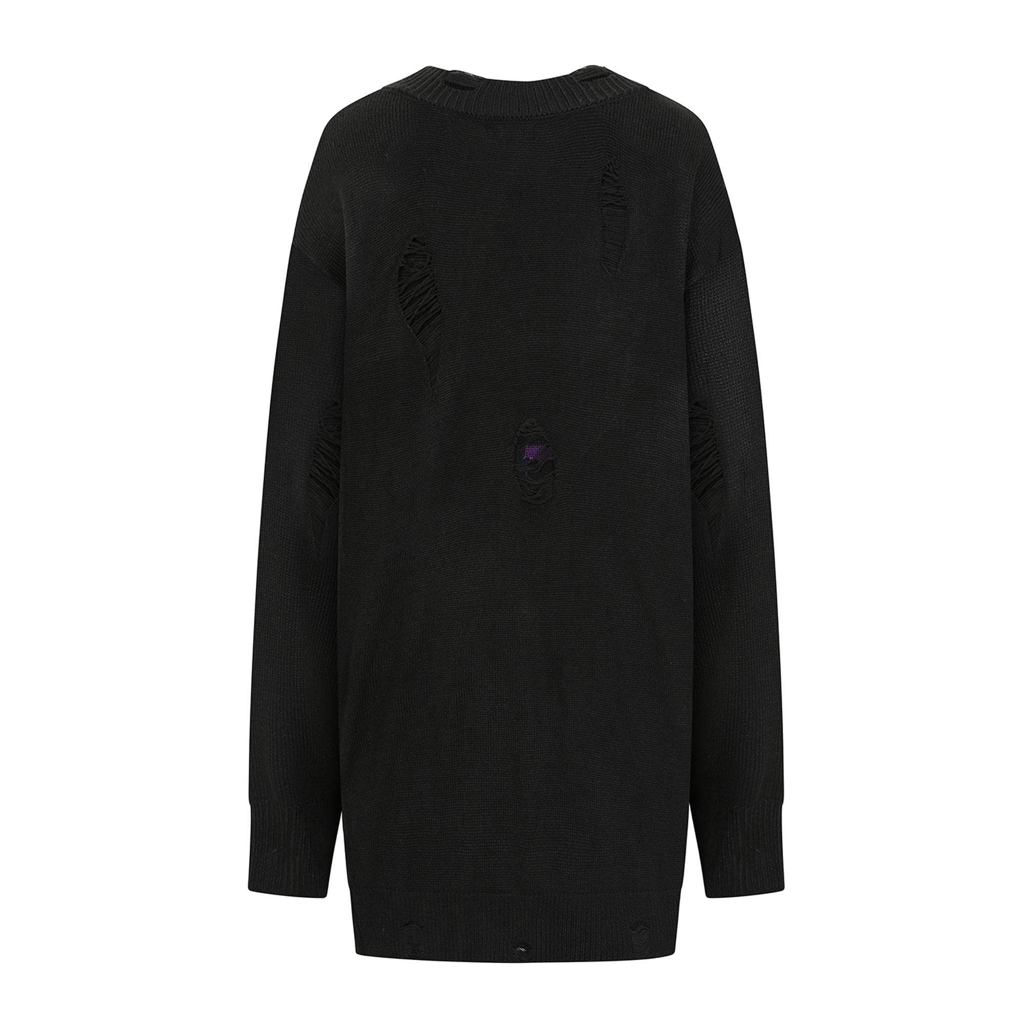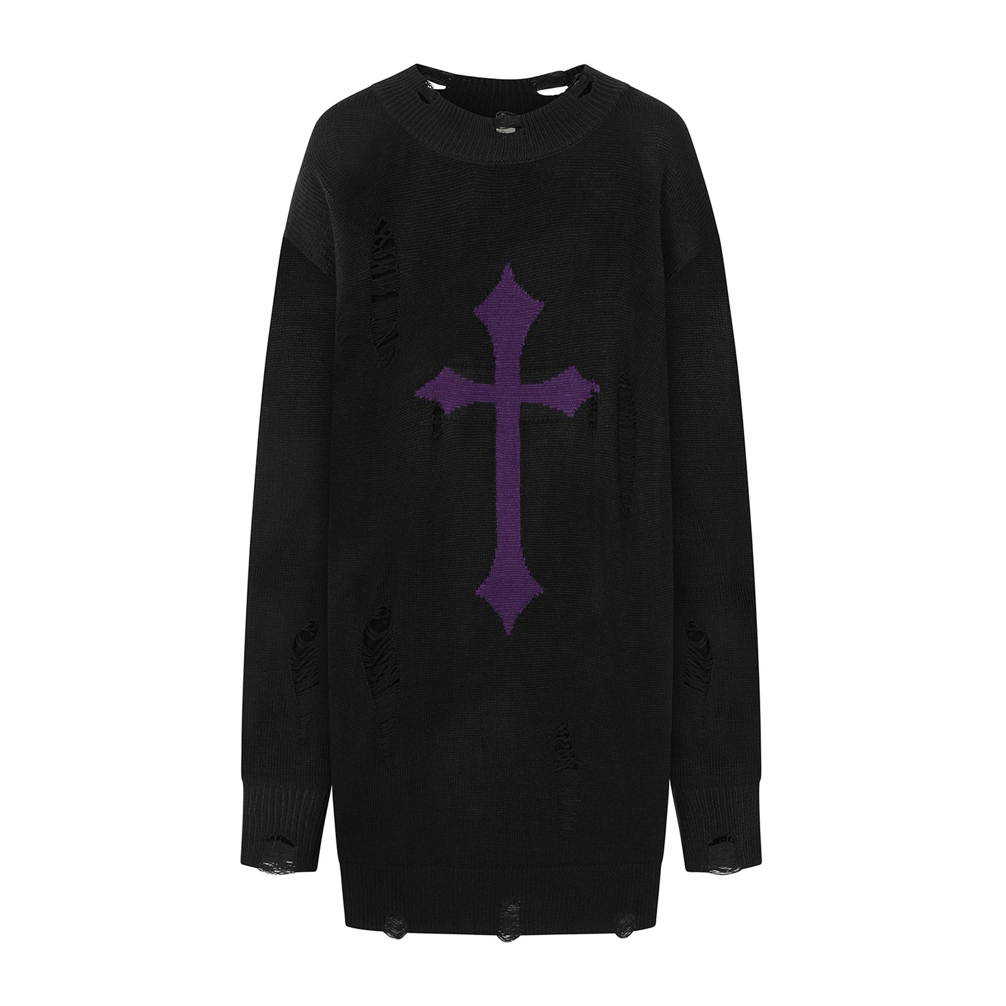 This knitted oversized sweater features a shredded neckline and distressed sections throughout, highlighted by a violet cross design on the front. Crafted entirely from 100% polyacrylic knit, it offers both style and comfort.