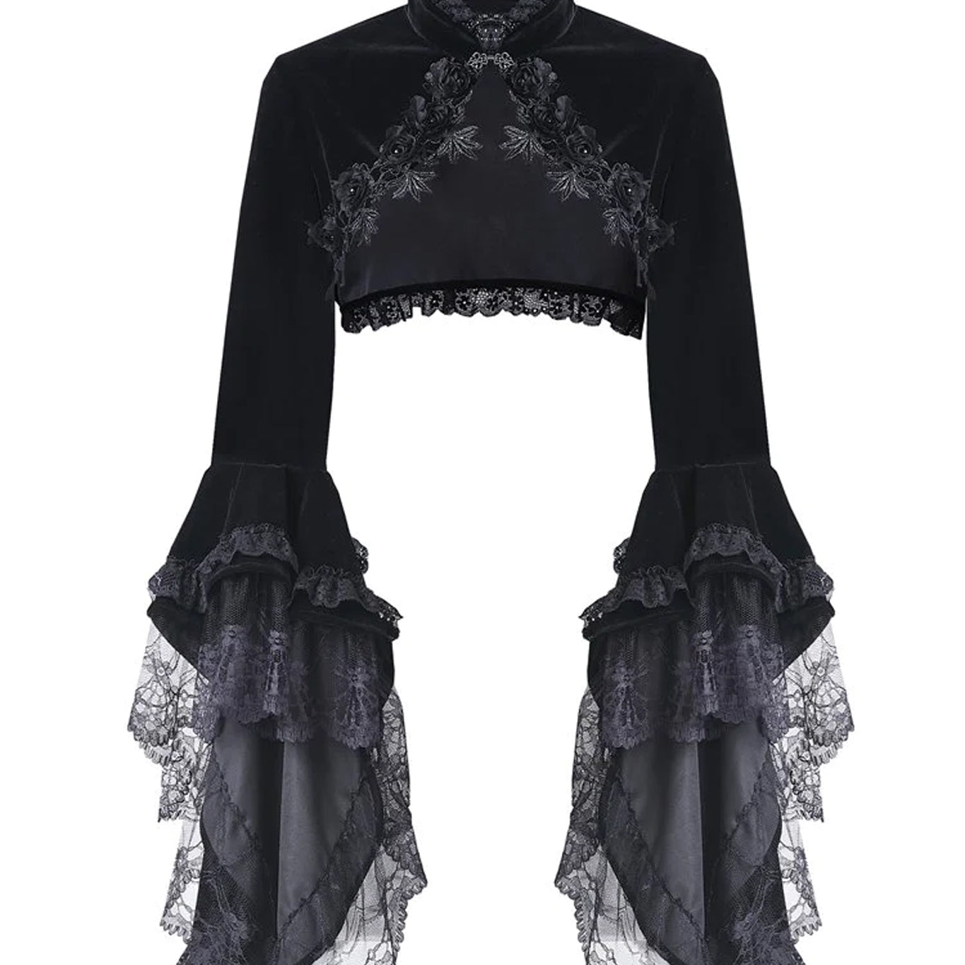 This striking cropped jacket in velveteen features flounced detailing for added drama. Its Mandarin collar is secured with a refined clasp closure. Each edge is meticulously finished with either delicate lace ruffles or substantial braided trim.
