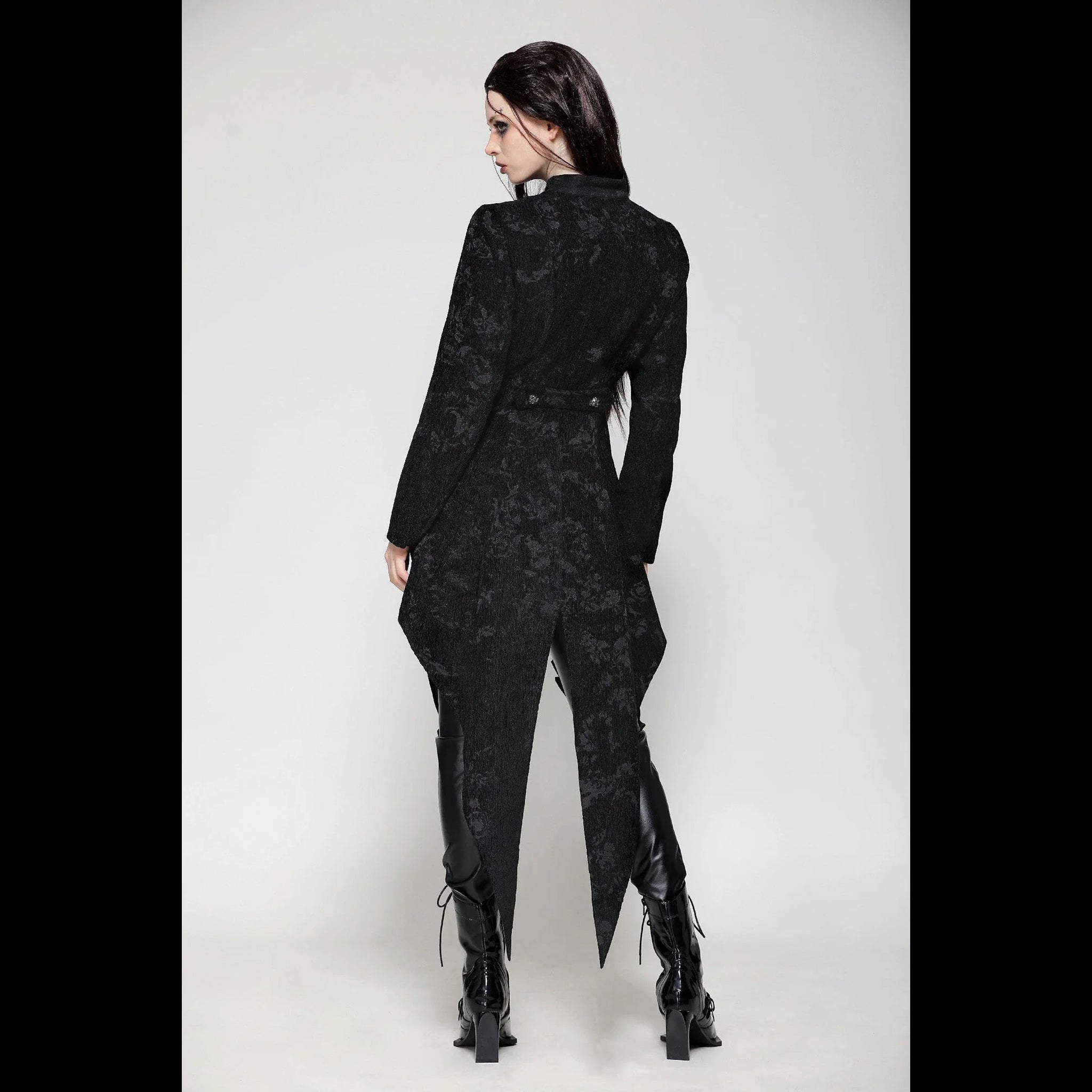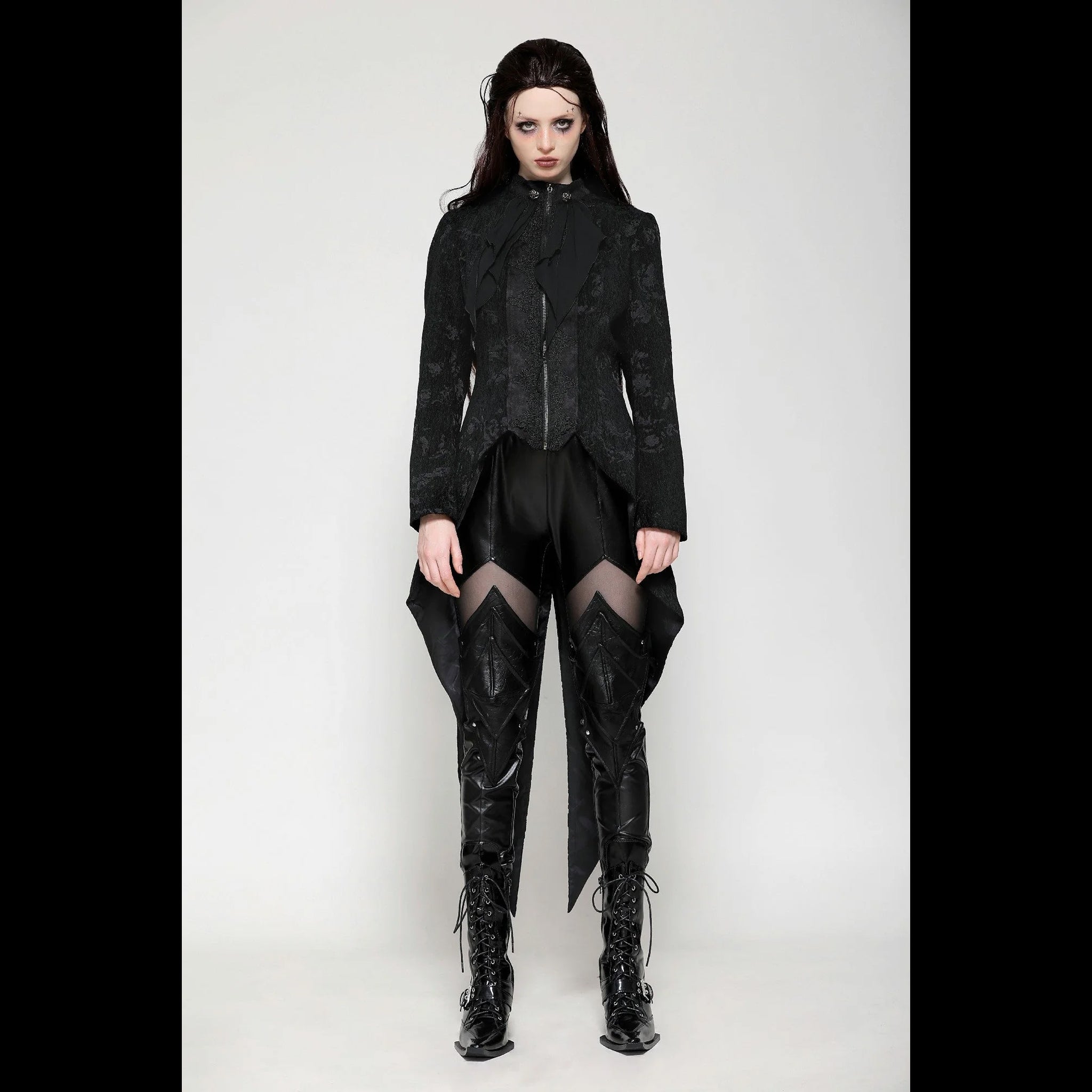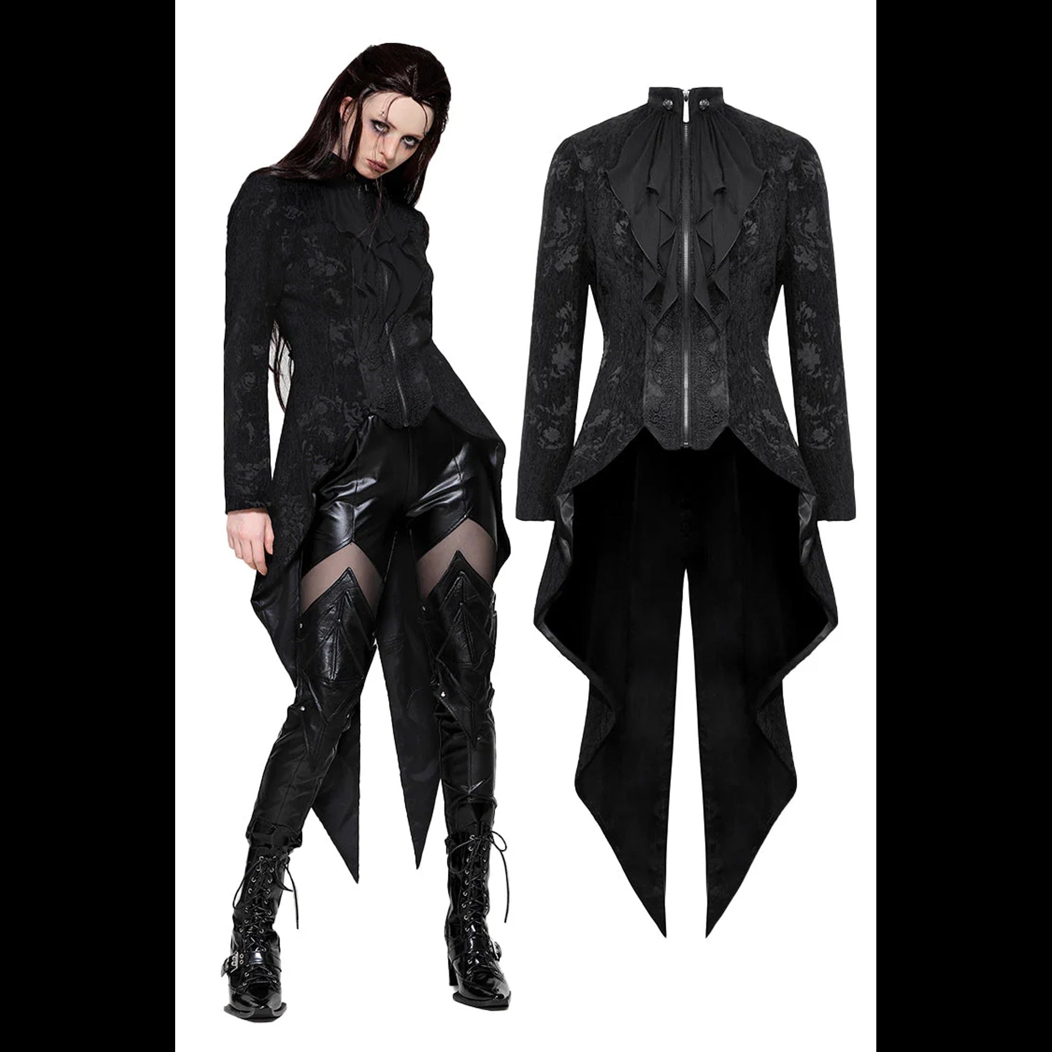 This coat offers a gothic reinterpretation of the classic tales style. Crafted from luxurious, intricate fabric, it showcases a front zipper closure along with delicate ruffle accents at the neckline.