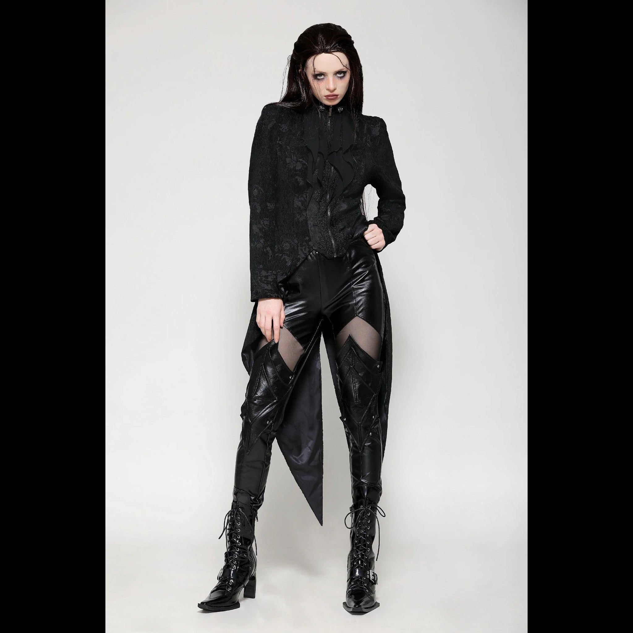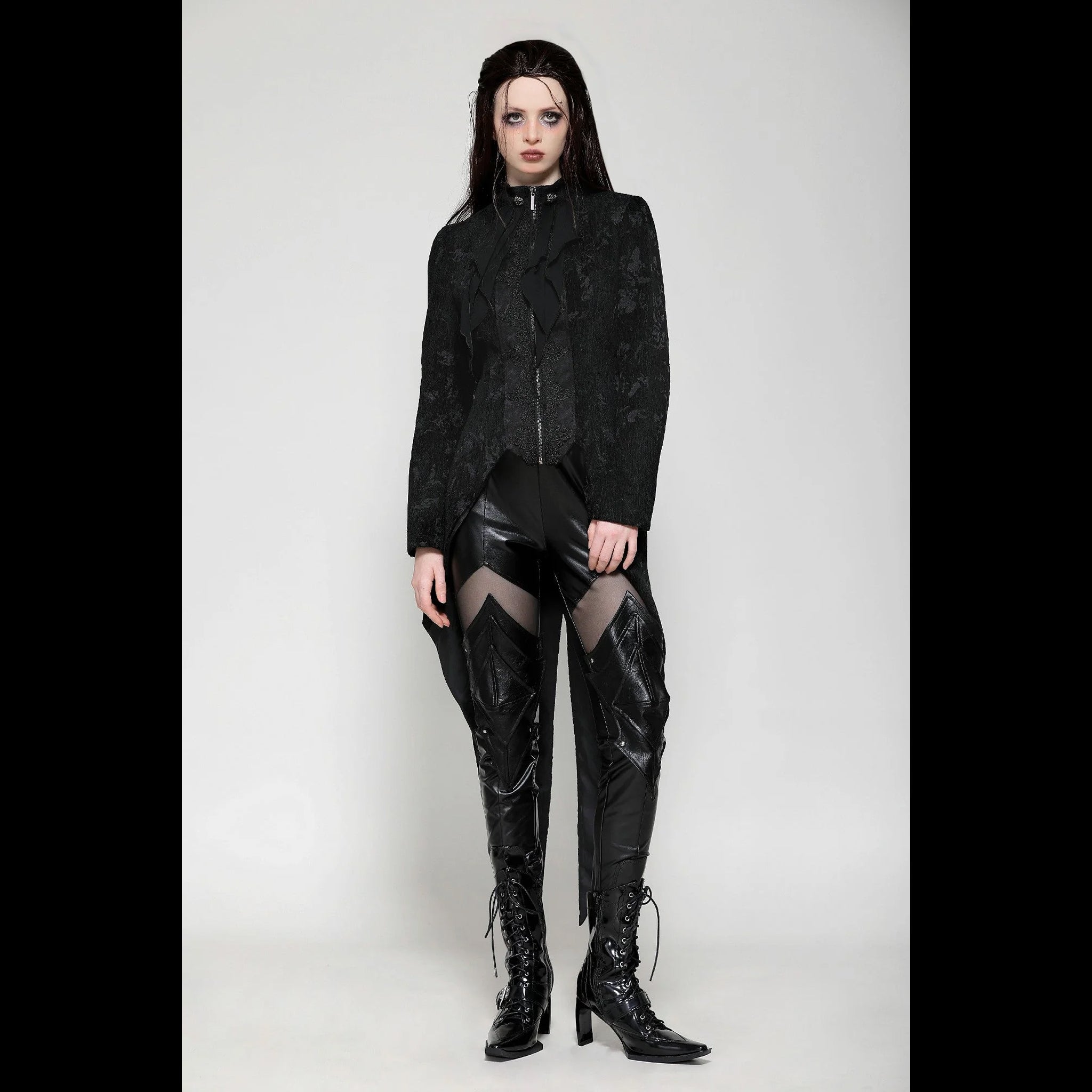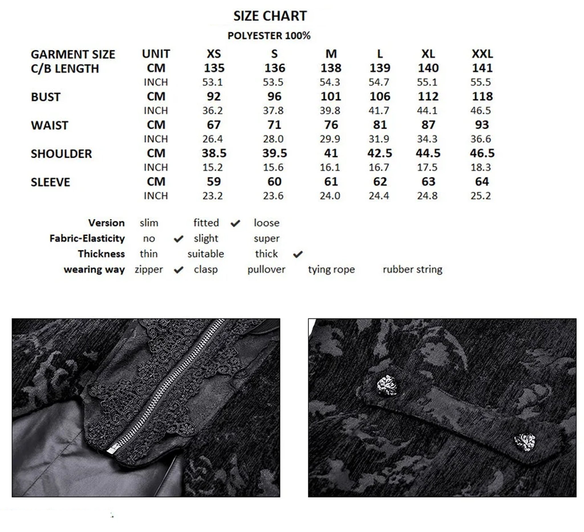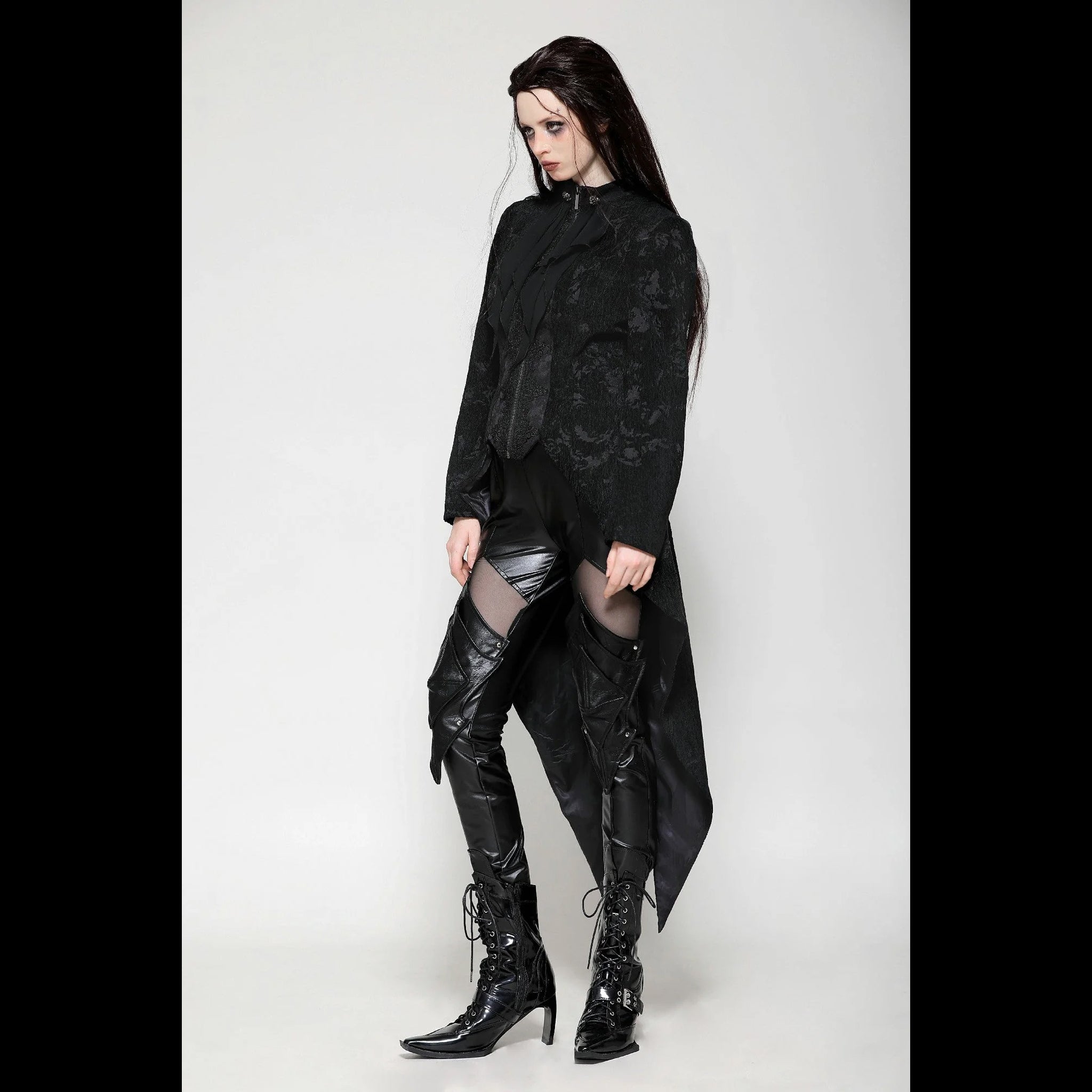 This coat offers a gothic reinterpretation of the classic tales style. Crafted from luxurious, intricate fabric, it showcases a front zipper closure along with delicate ruffle accents at the neckline.