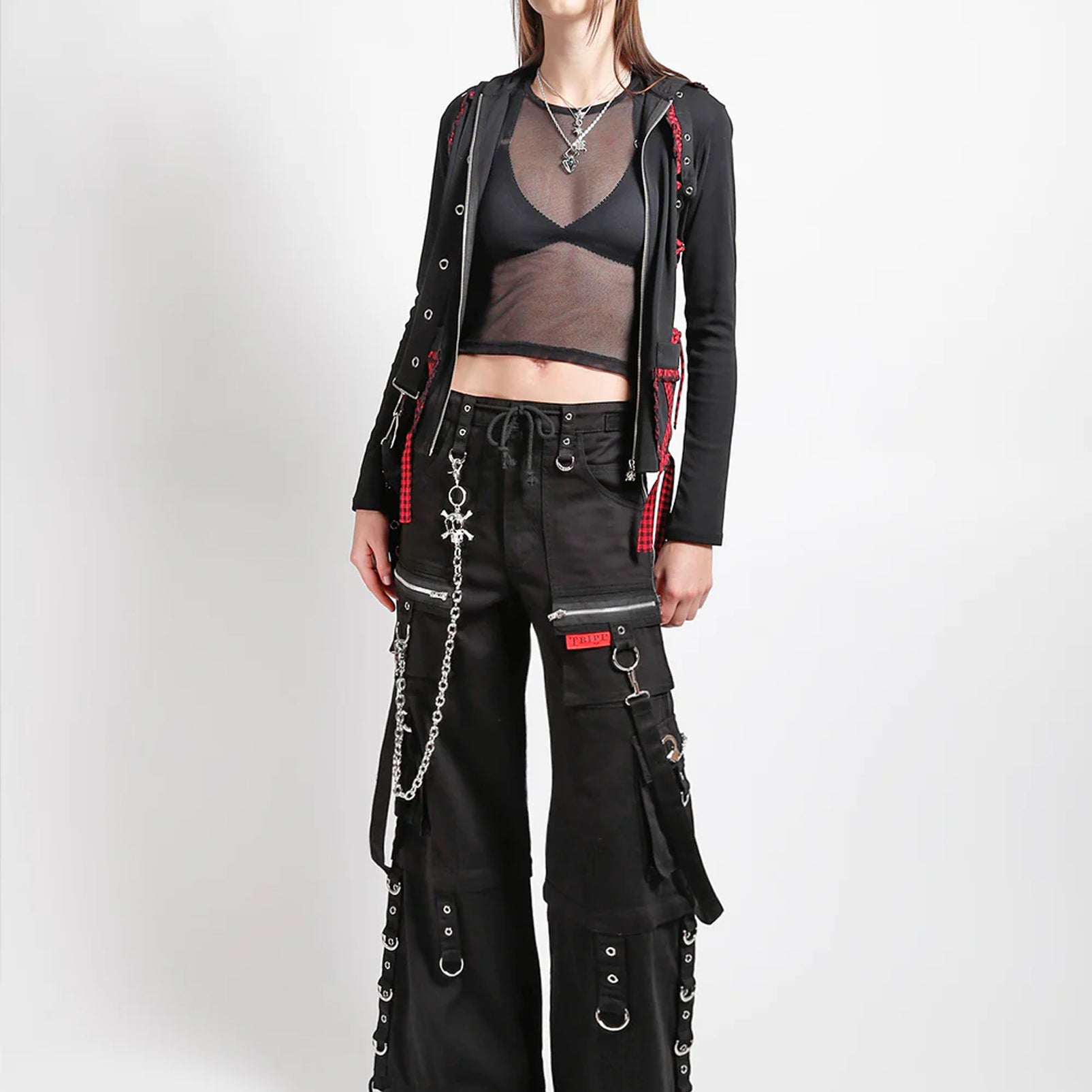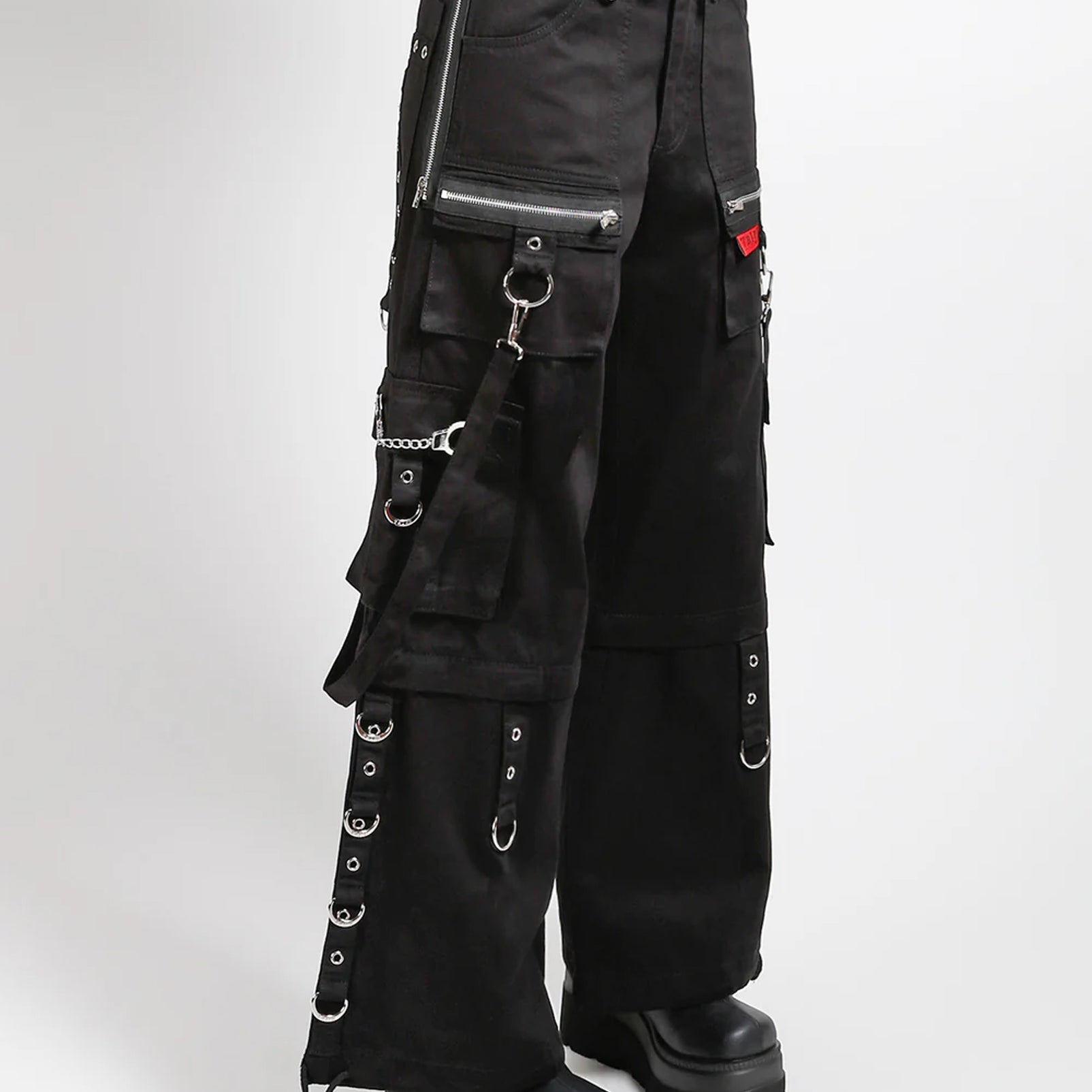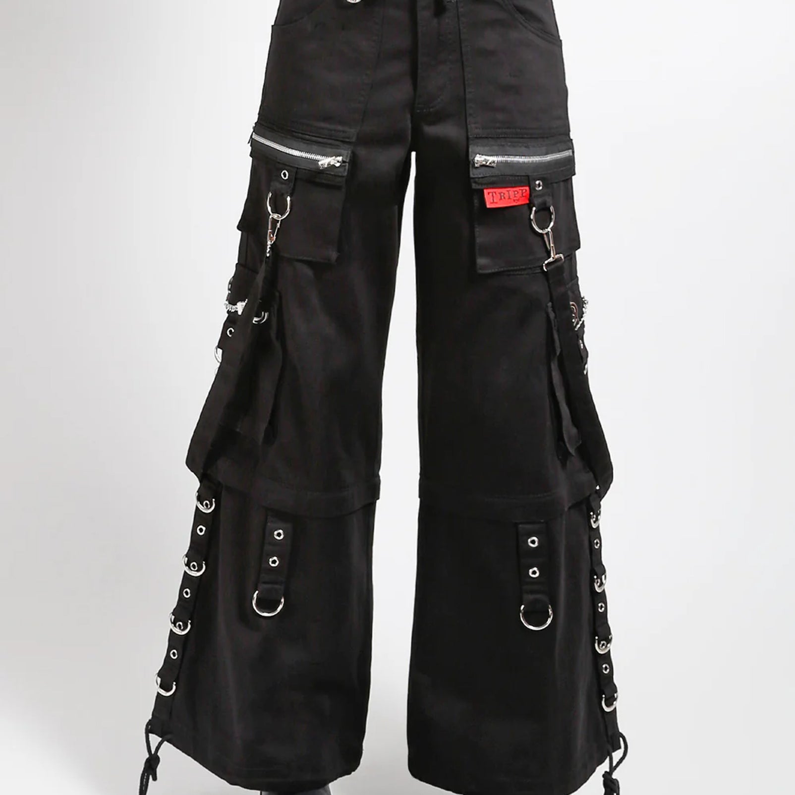 These black pants zip off into shorts and feature removable straps, d-rings/rivets, adjustable ankles, deep pockets and a custom removable mini handcuff chain.